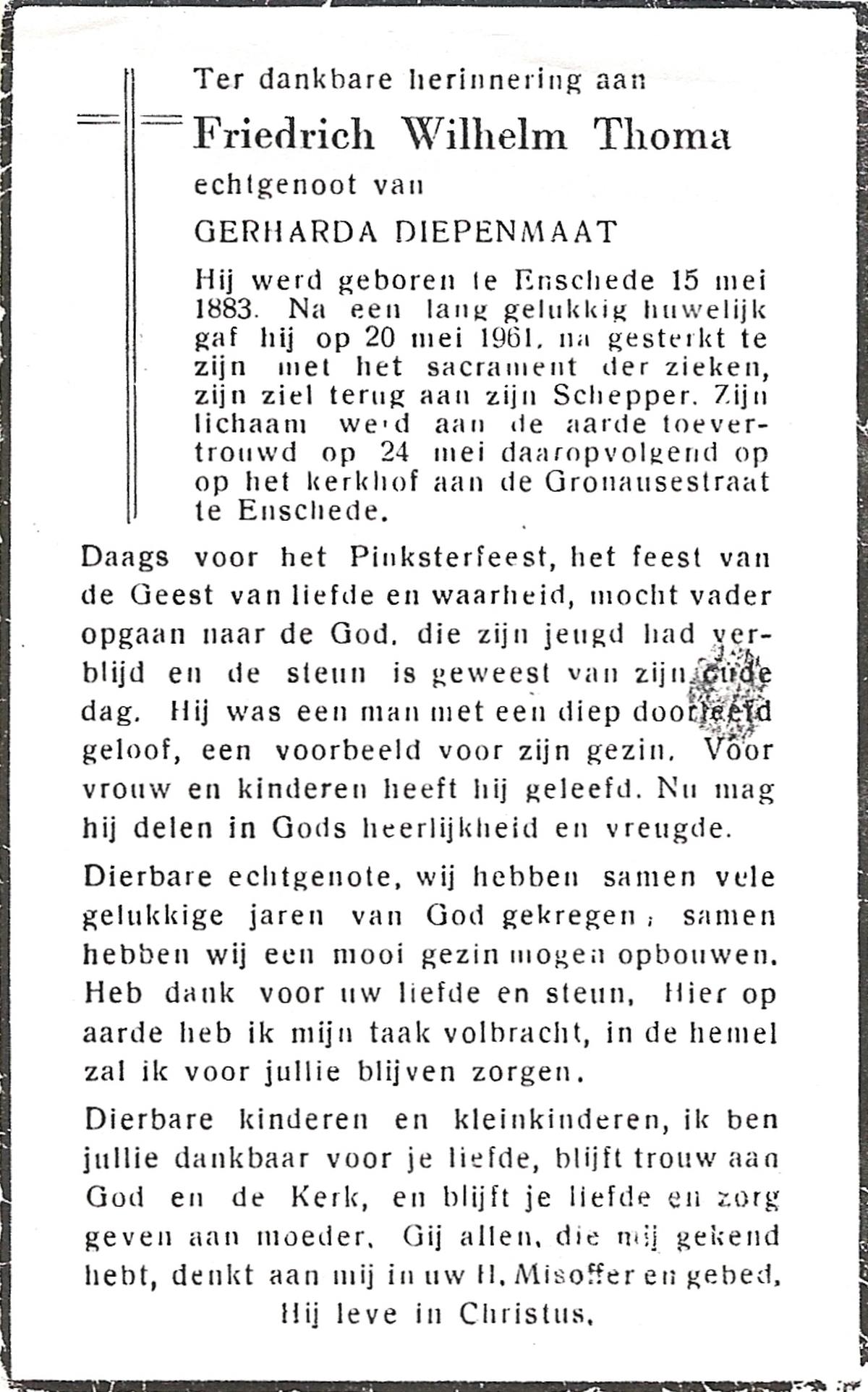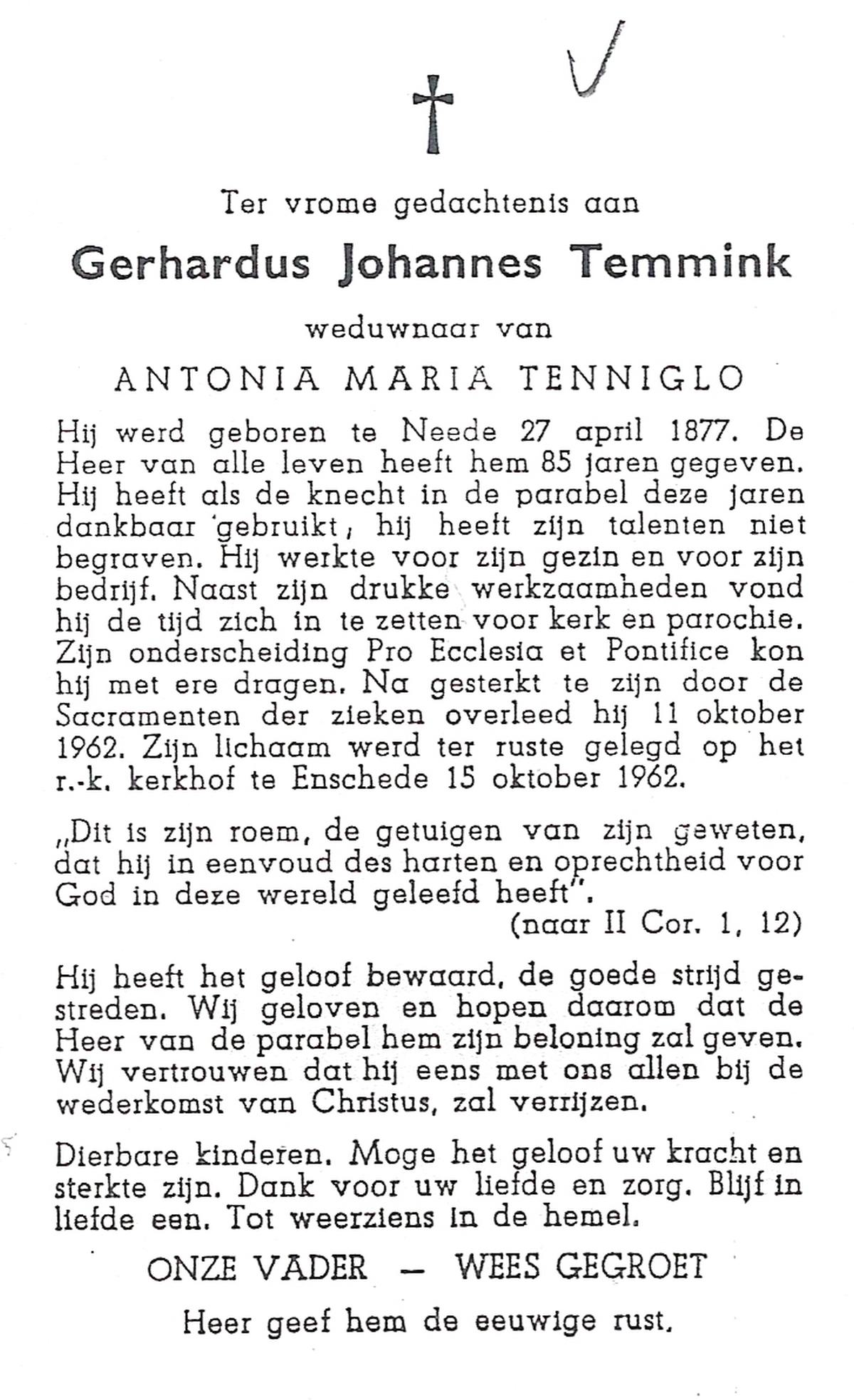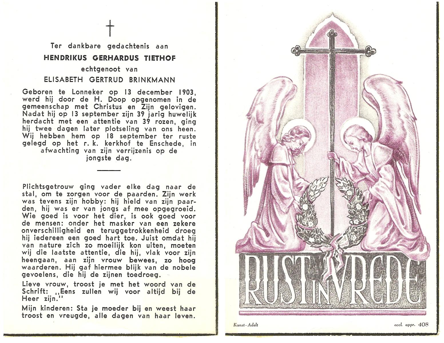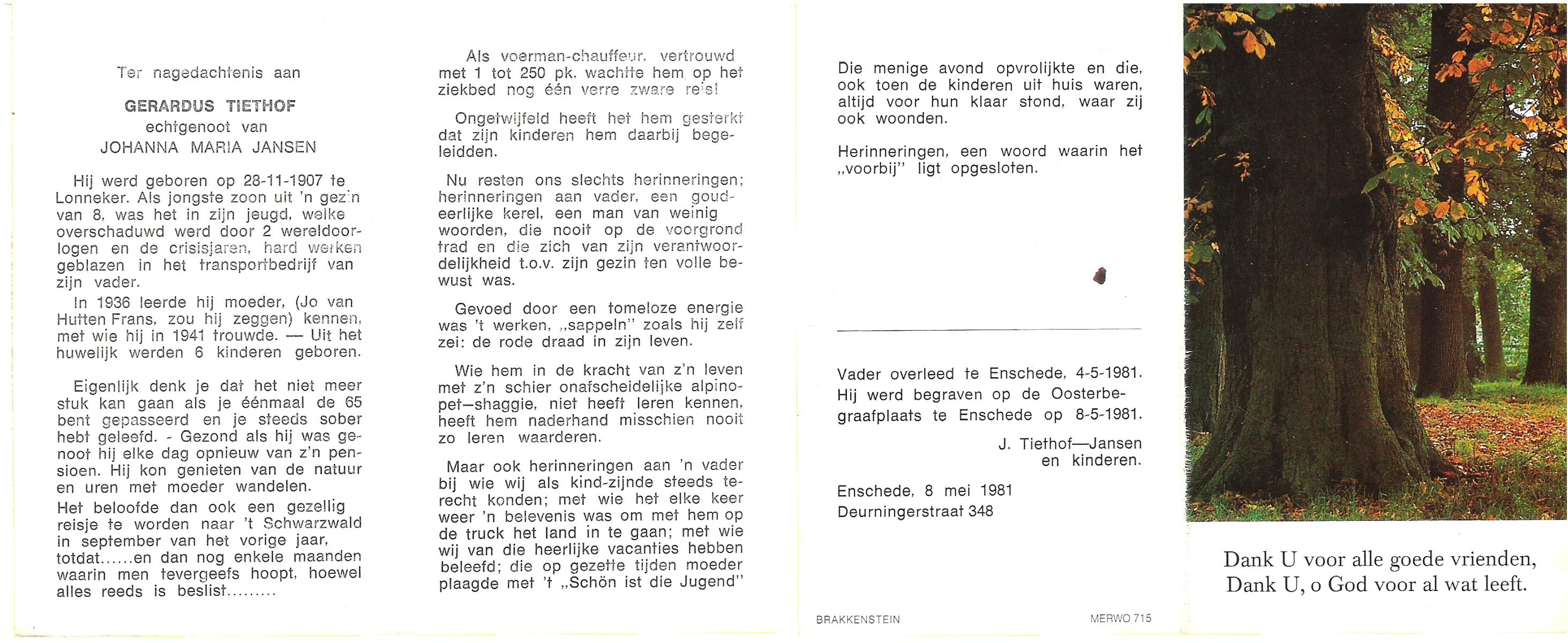 TIETHOF, Gerardus, geboren op 28-11-1907 te Lonneker, overleden op 4-5-1981 te Enschede op 73-jarige leeftijd, begraven op 8-5-1981 te Enschede.