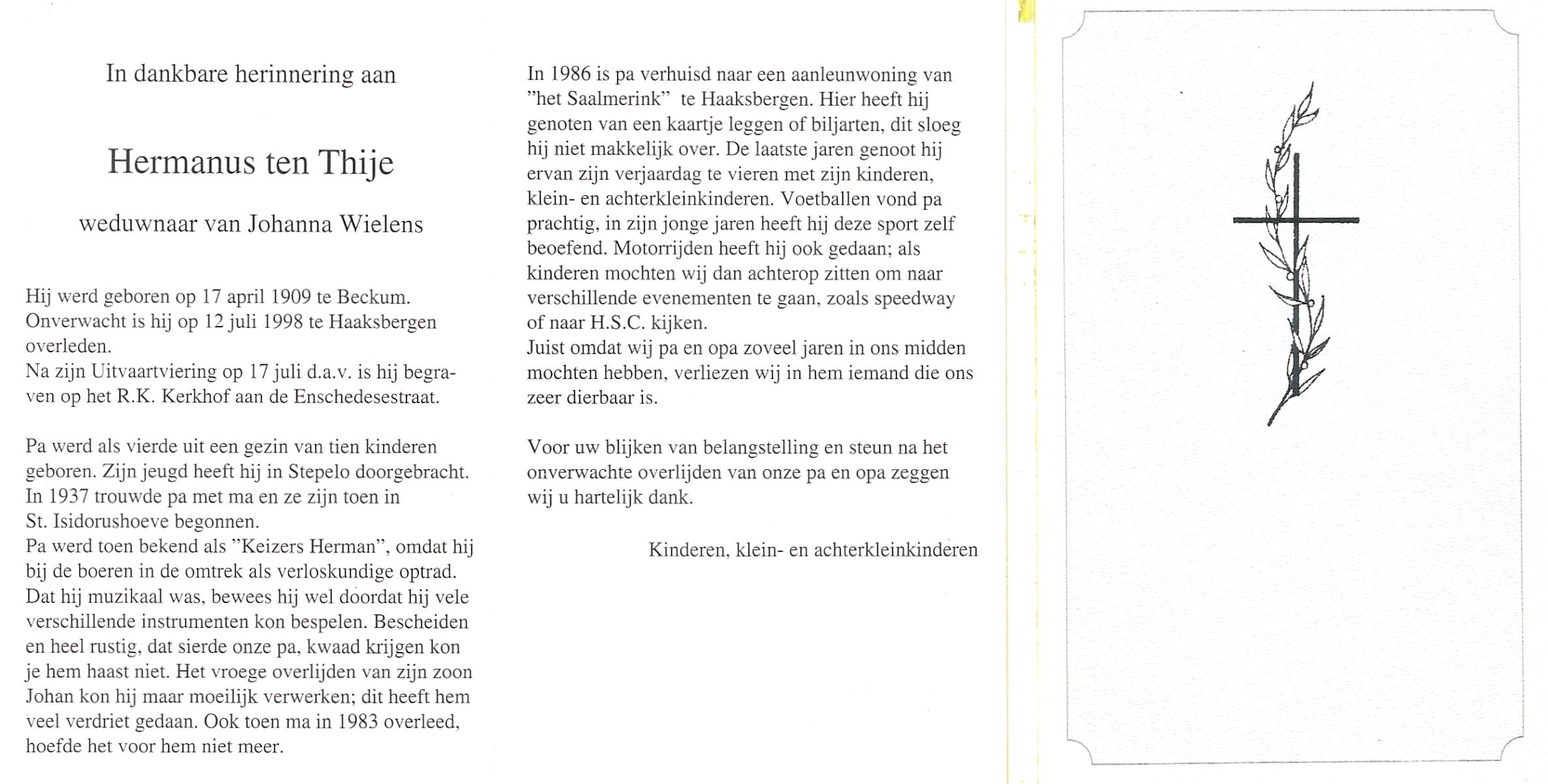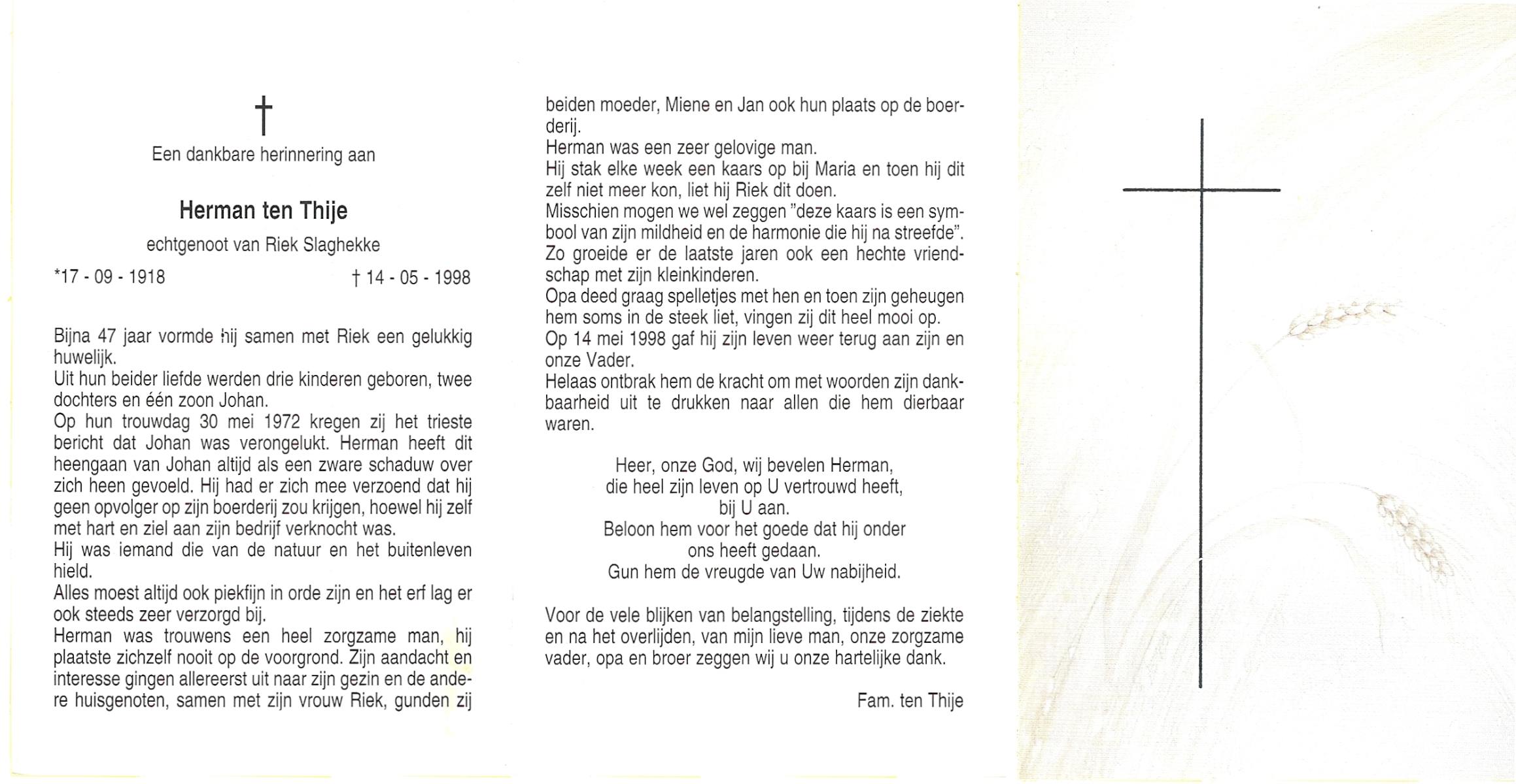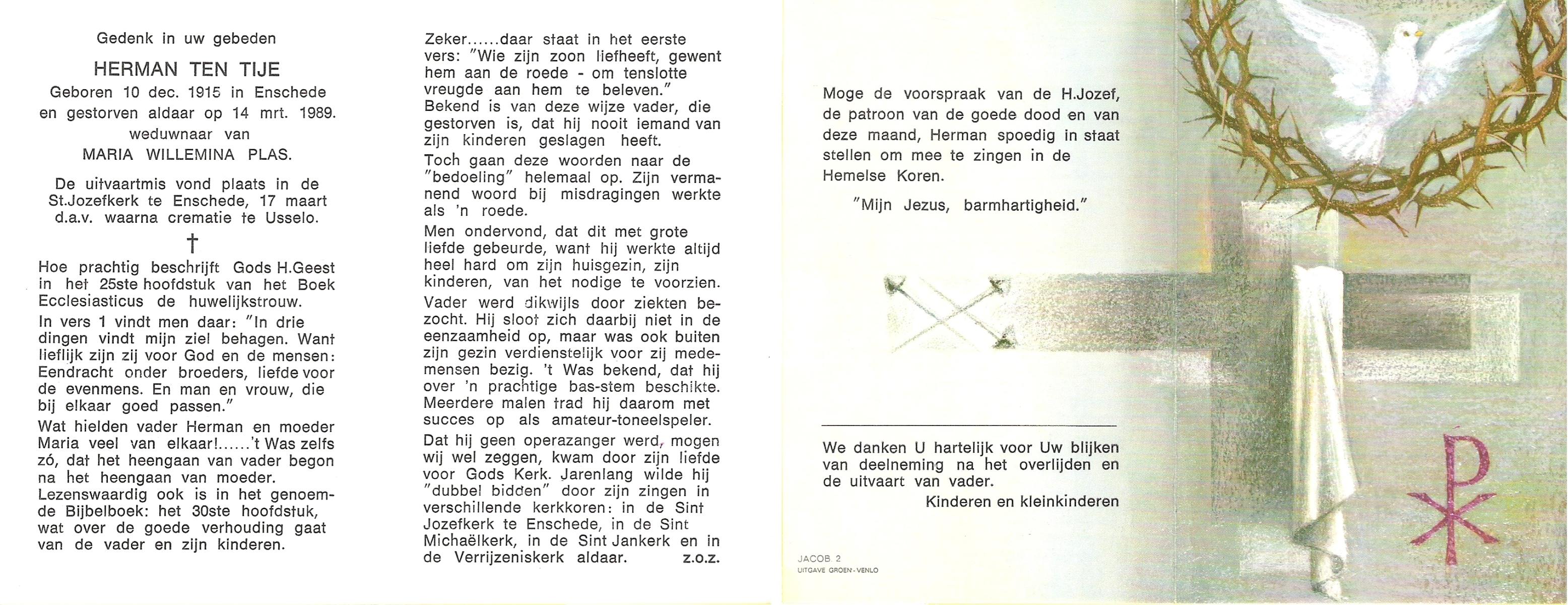 TIJE, ten, Herman, geboren op 10-12-1915 te Enschede, overleden op 14-3-1989 te Enschede op 73-jarige leeftijd, gecremeerd op 17-3-1989 te Usselo.