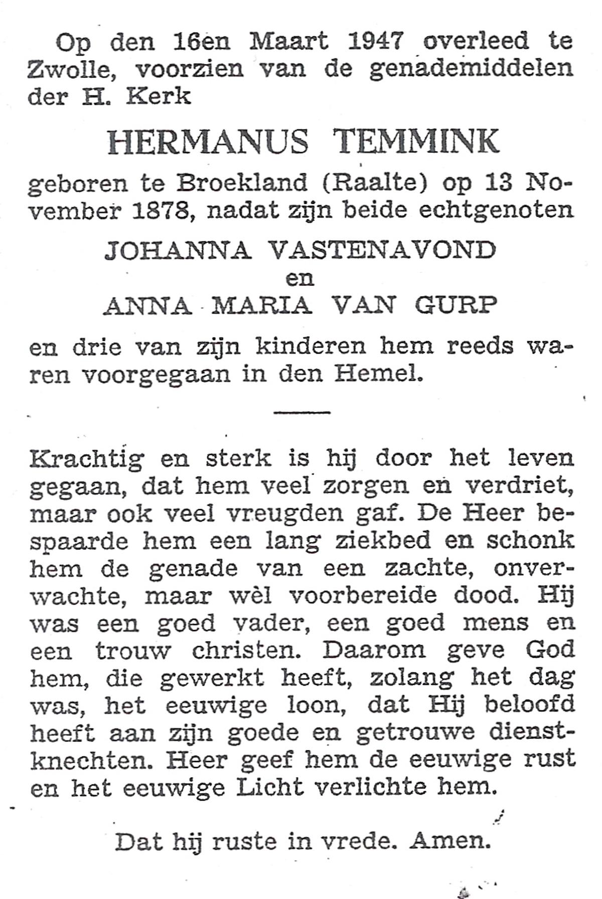 STOKMAN (PASTOOR), Franciscus Hermanus Jozef, geboren op 07-07-1888 te Wijk bij Duurstede, overleden op 1-8-1957 te Raalte op 69-jarige leeftijd, begraven op 5-8-1957 te Raalte.