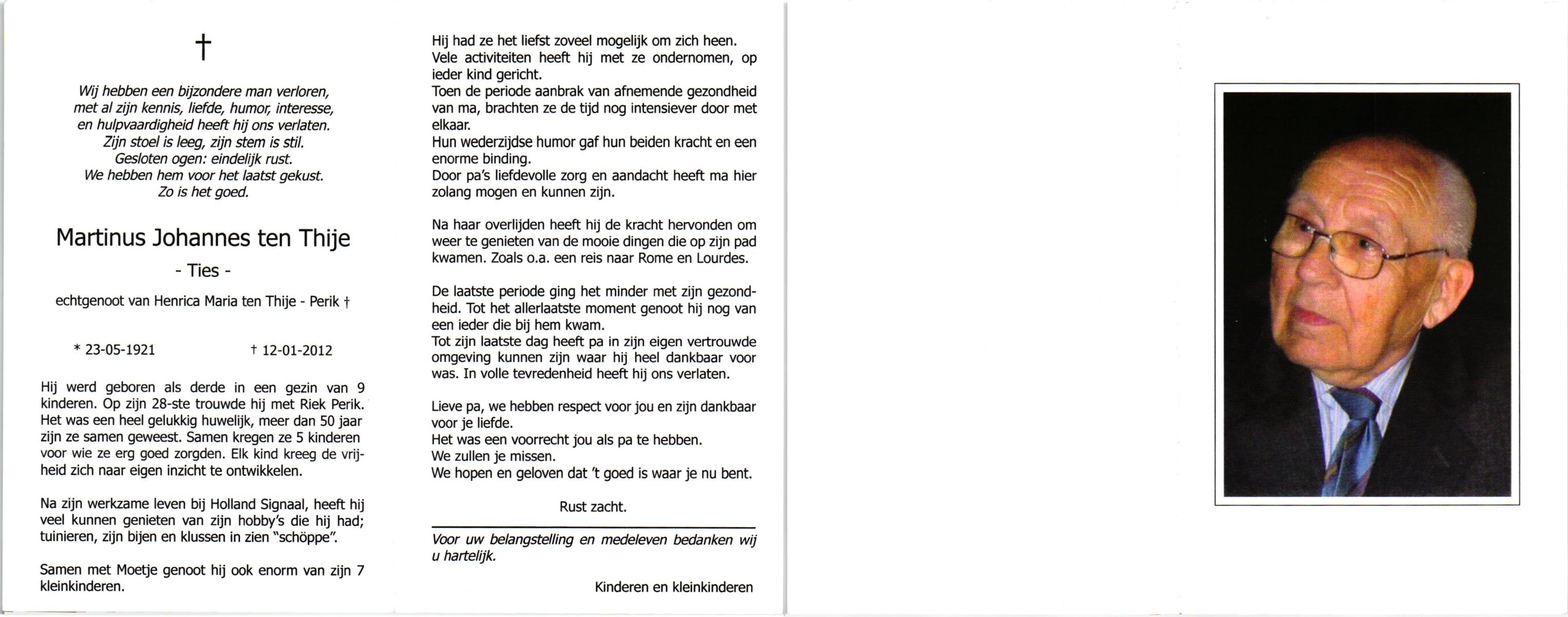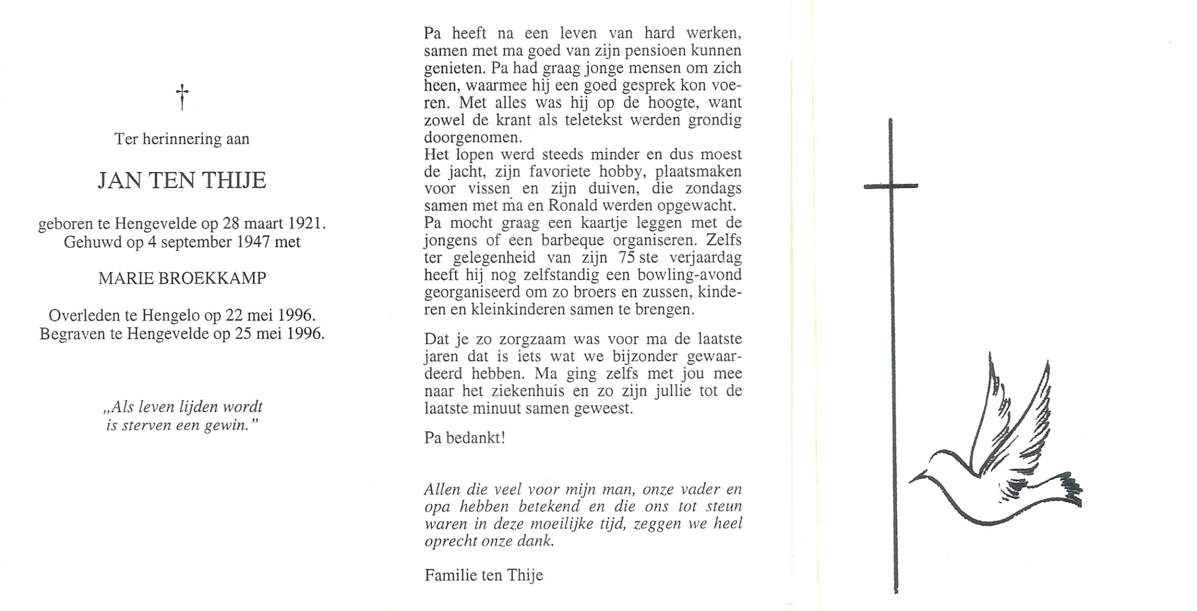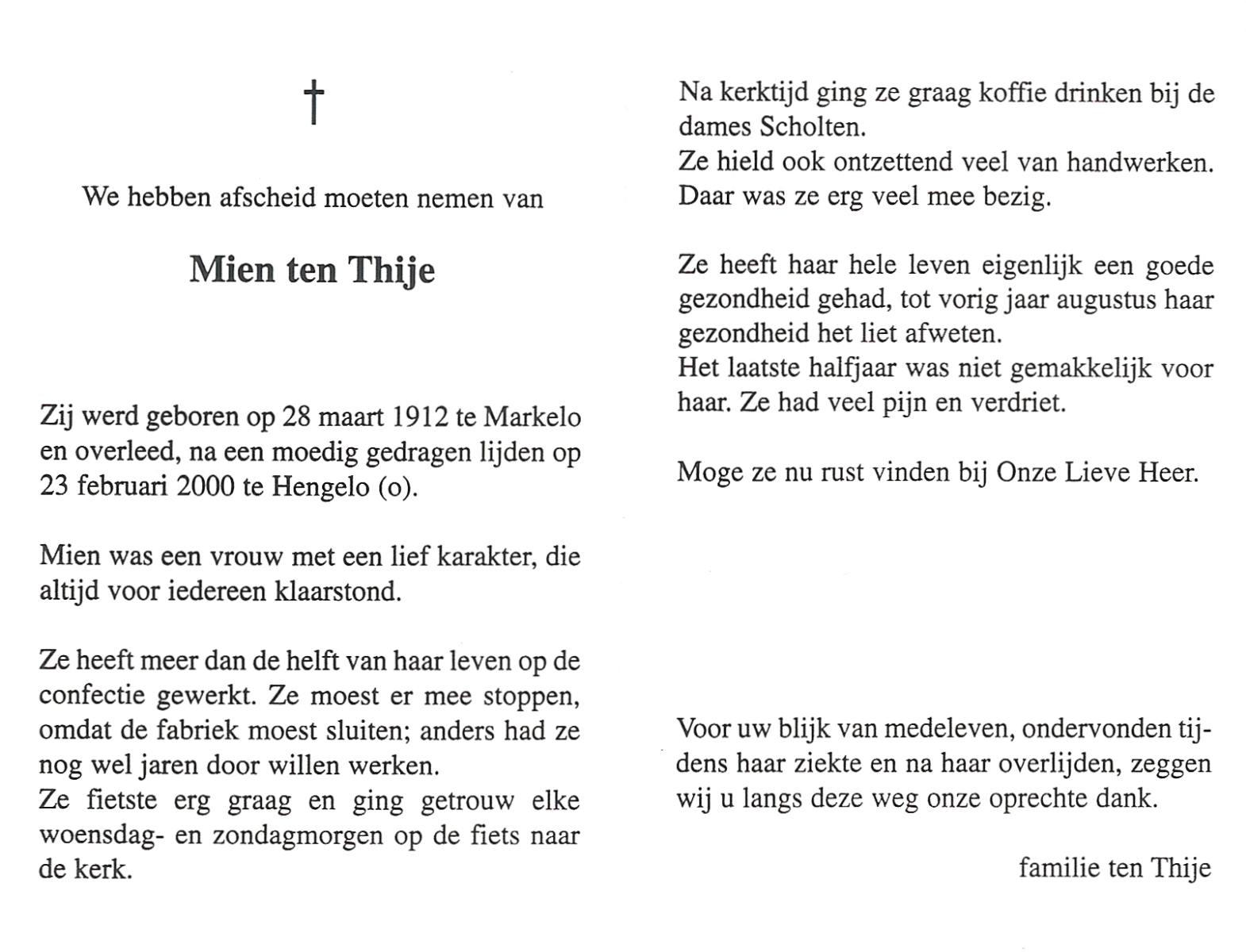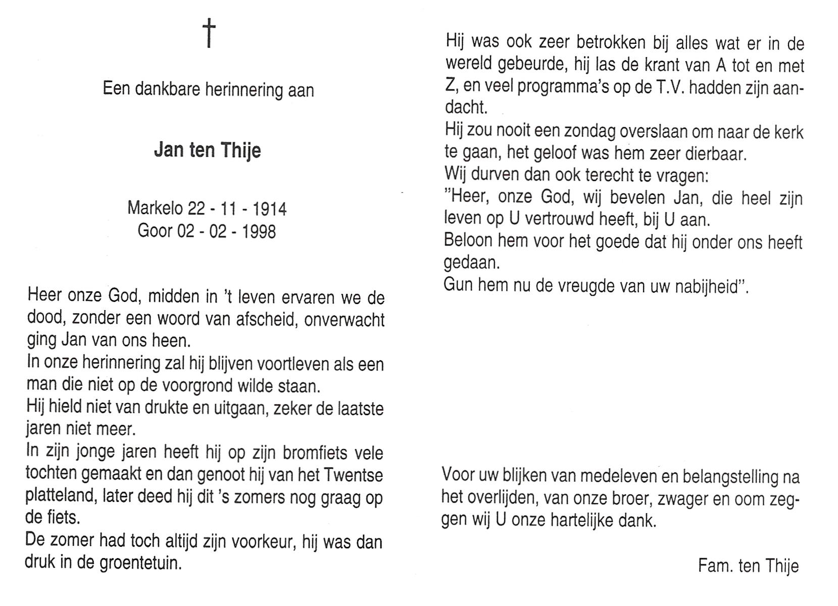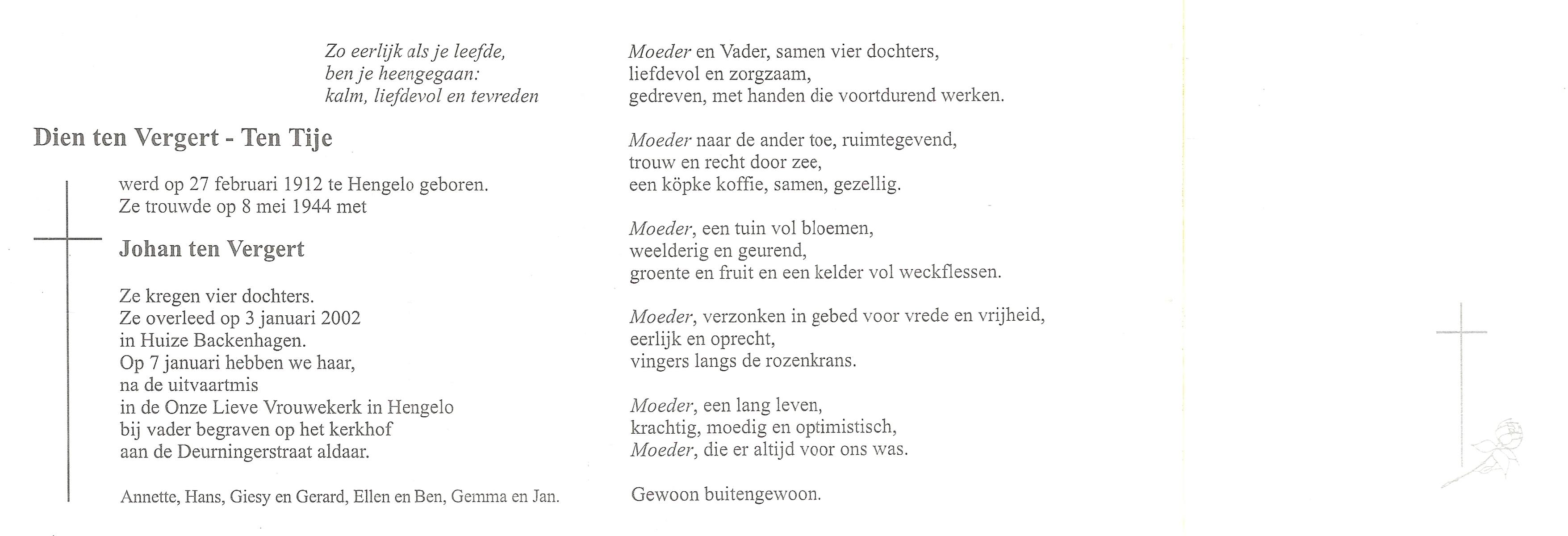 TIJE, Ten, Dien, geboren op 27-2-1912 te Hengelo (O), overleden op 3-1-2002 te Hengelo (Ov.) op 89-jarige leeftijd, begraven op 7-1-2002 te Hengelo (Ov.).