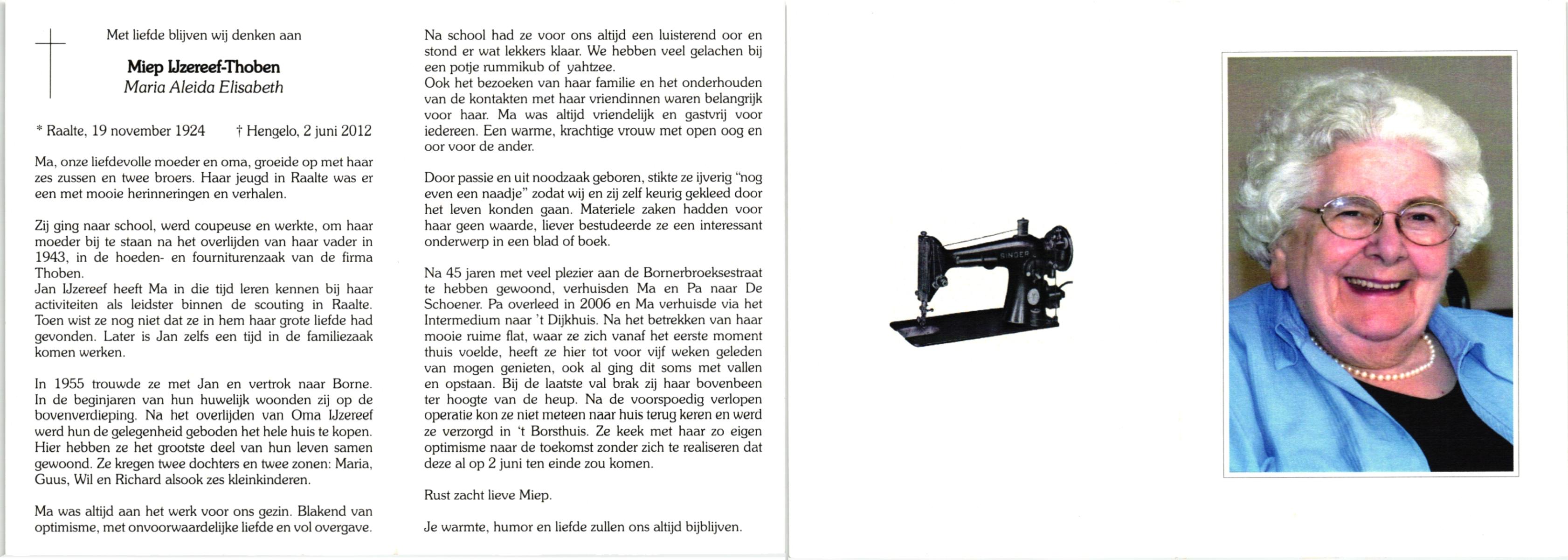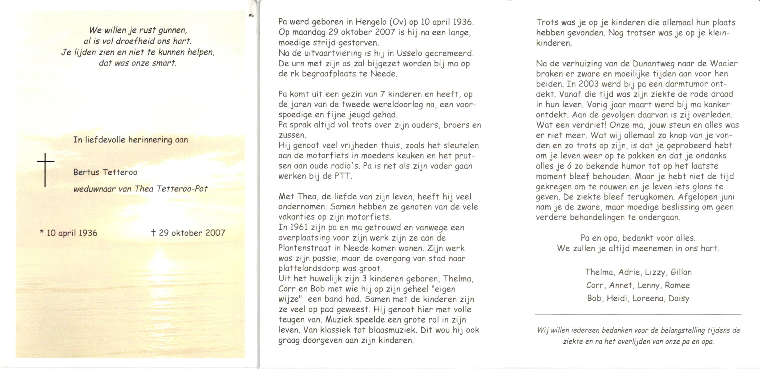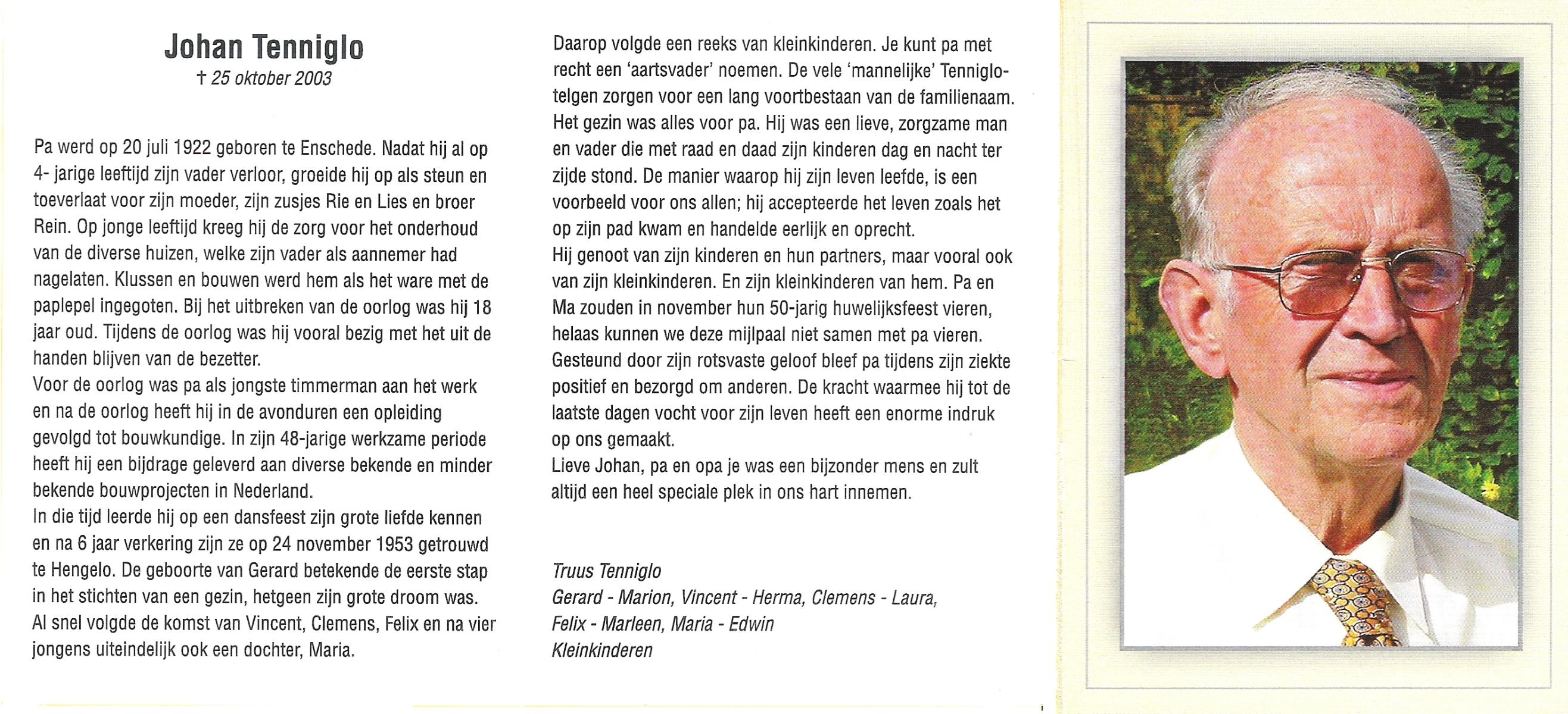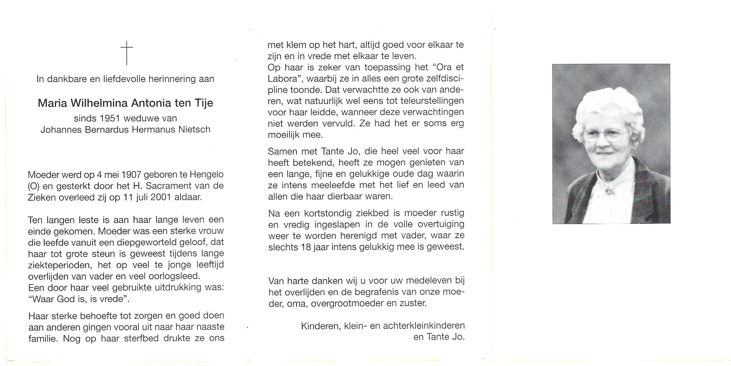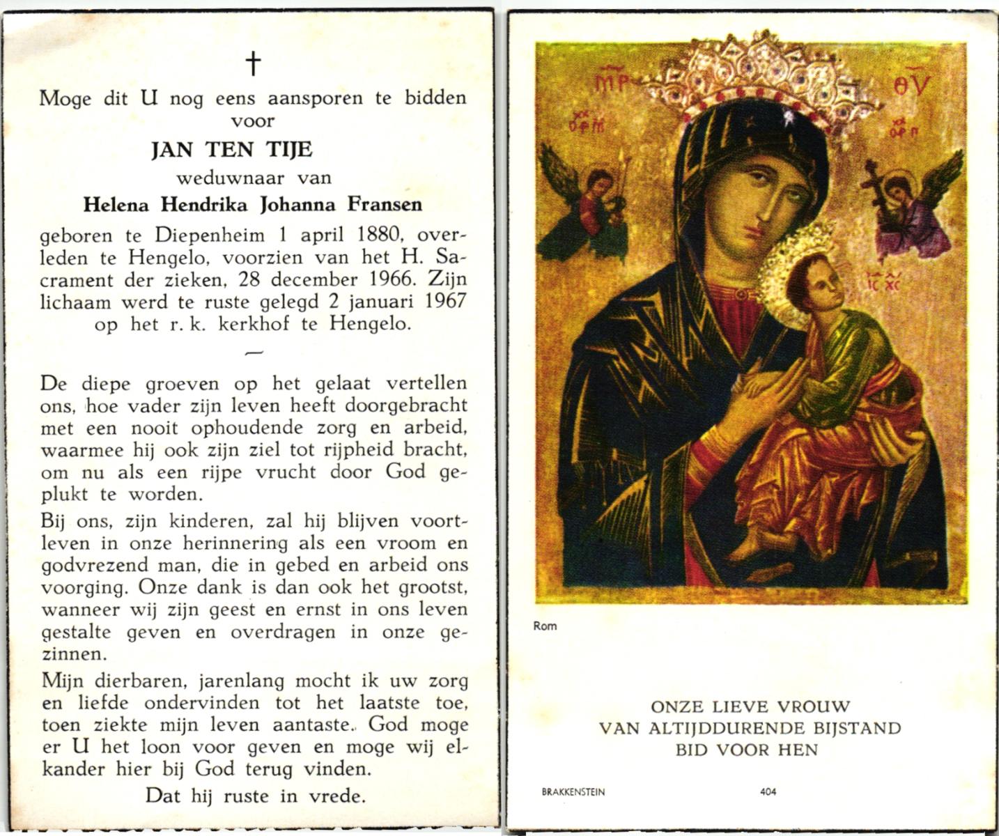 TIJE, Ten, Dien, geboren op 27-2-1912 te Hengelo (O), overleden op 3-1-2002 te Hengelo (Ov.) op 89-jarige leeftijd, begraven op 7-1-2002 te Hengelo (Ov.).