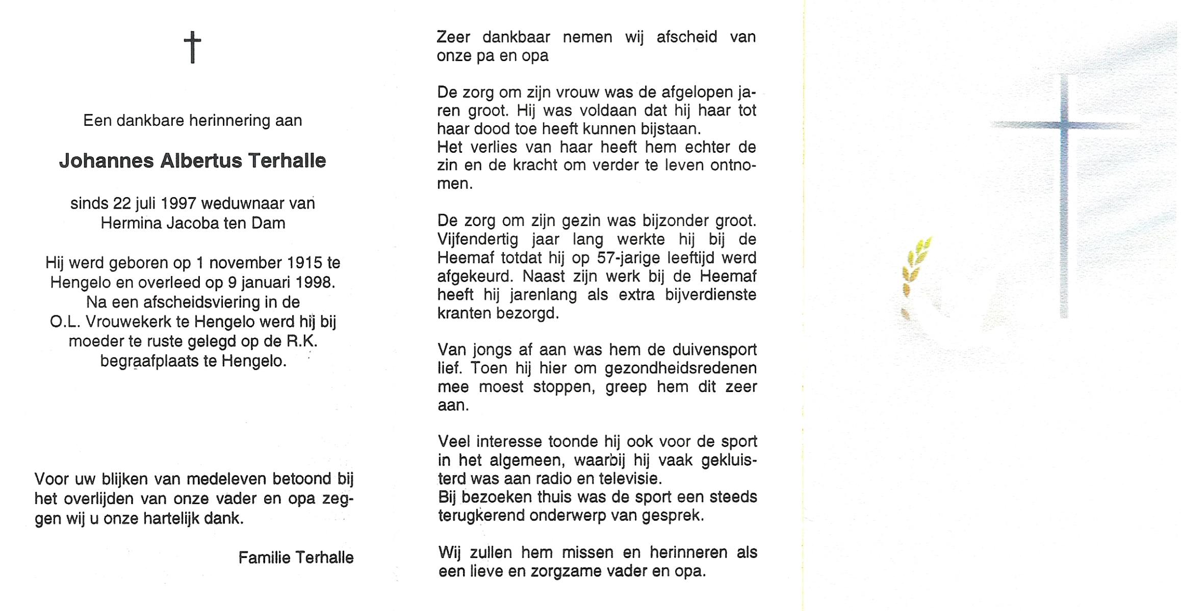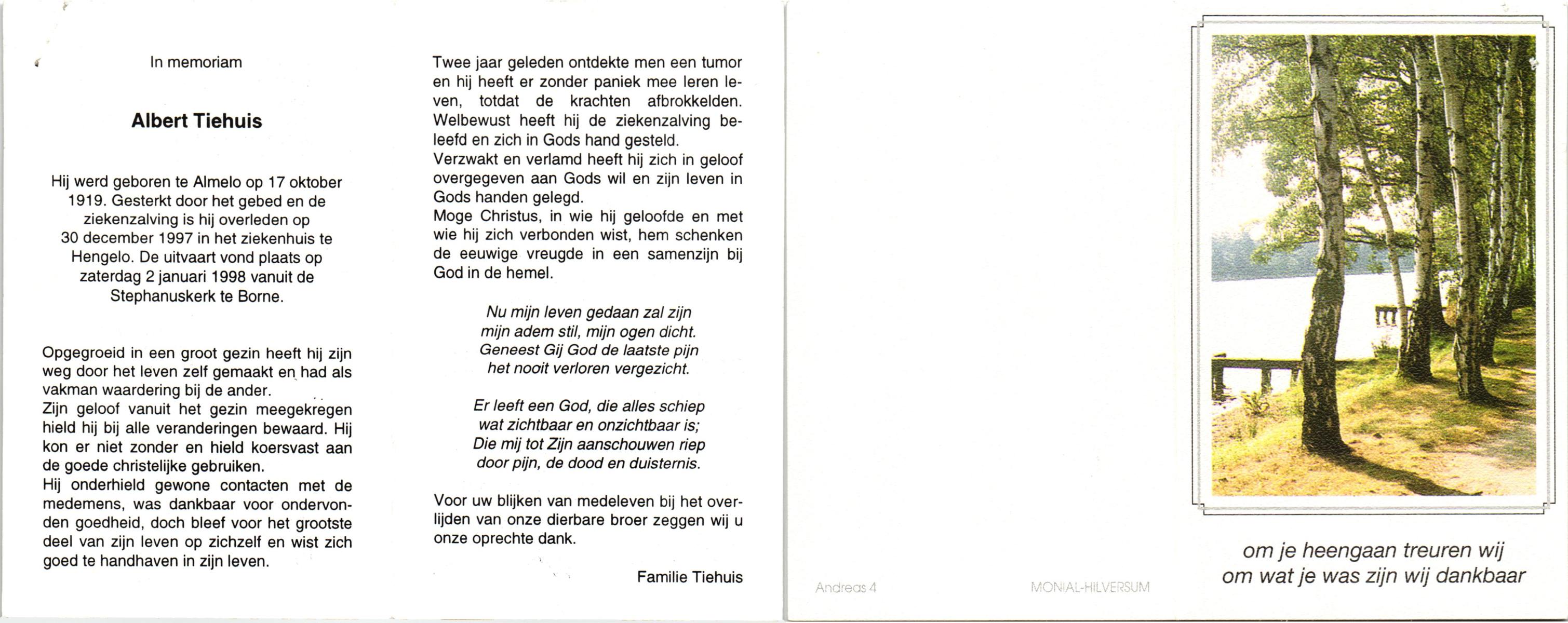 TIEHUIS, Albert, geboren op 17-10-1919 te Almelo, overleden op 30-12-1997 te Hengelo, ziekenhuis op 78-jarige leeftijd, begraven op 2-1-1998 te Borne.