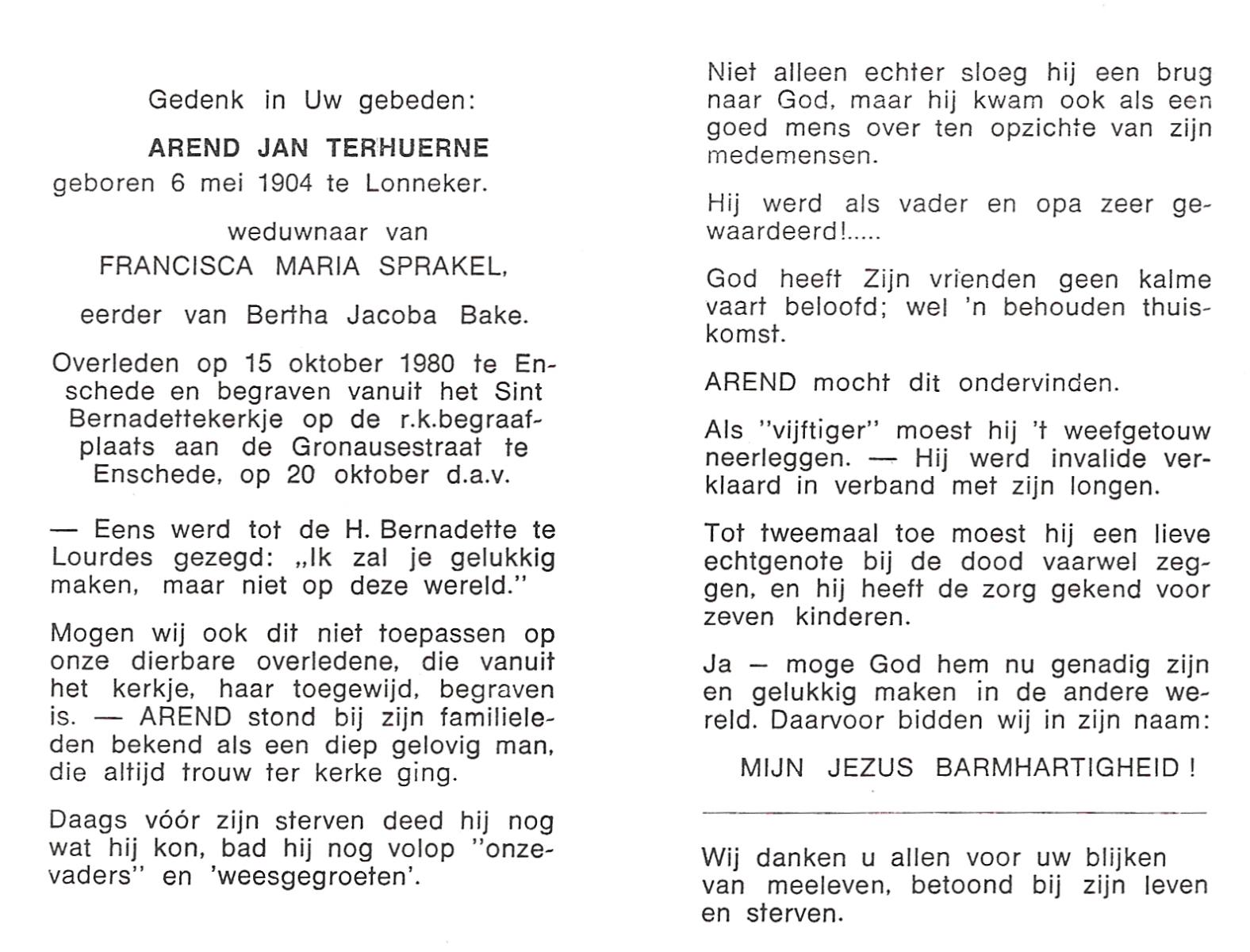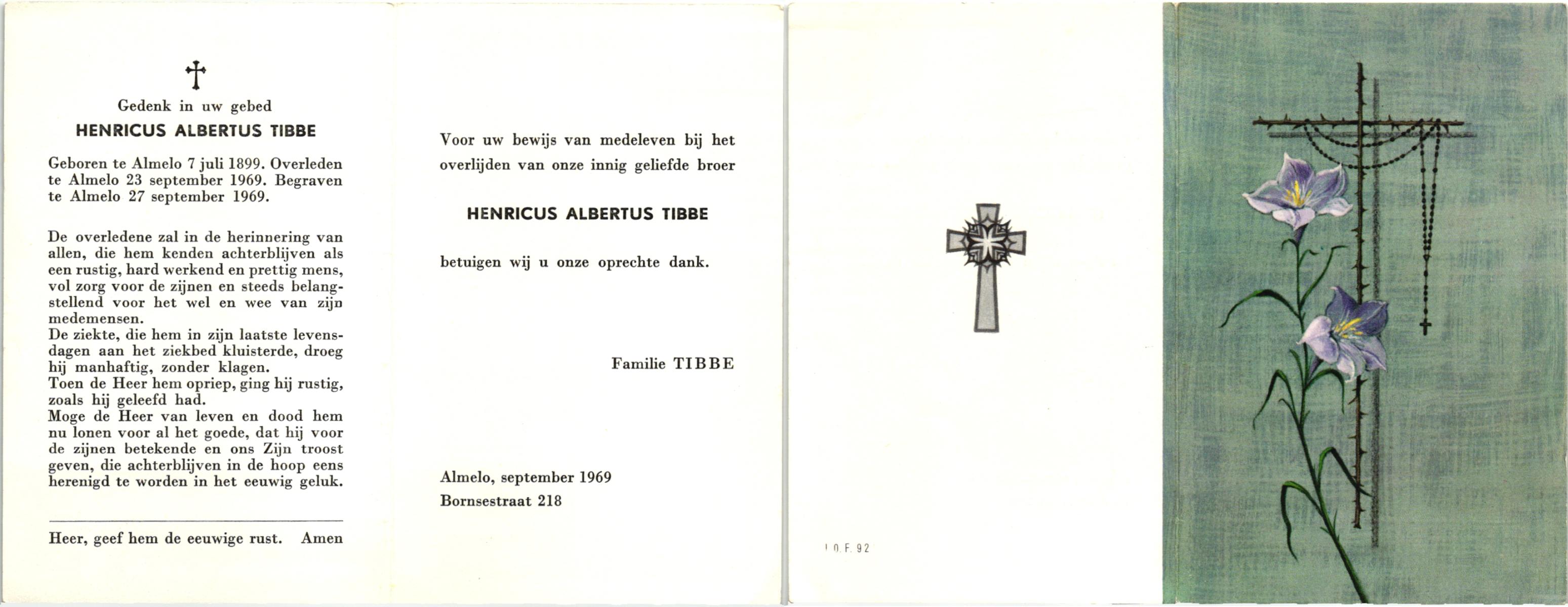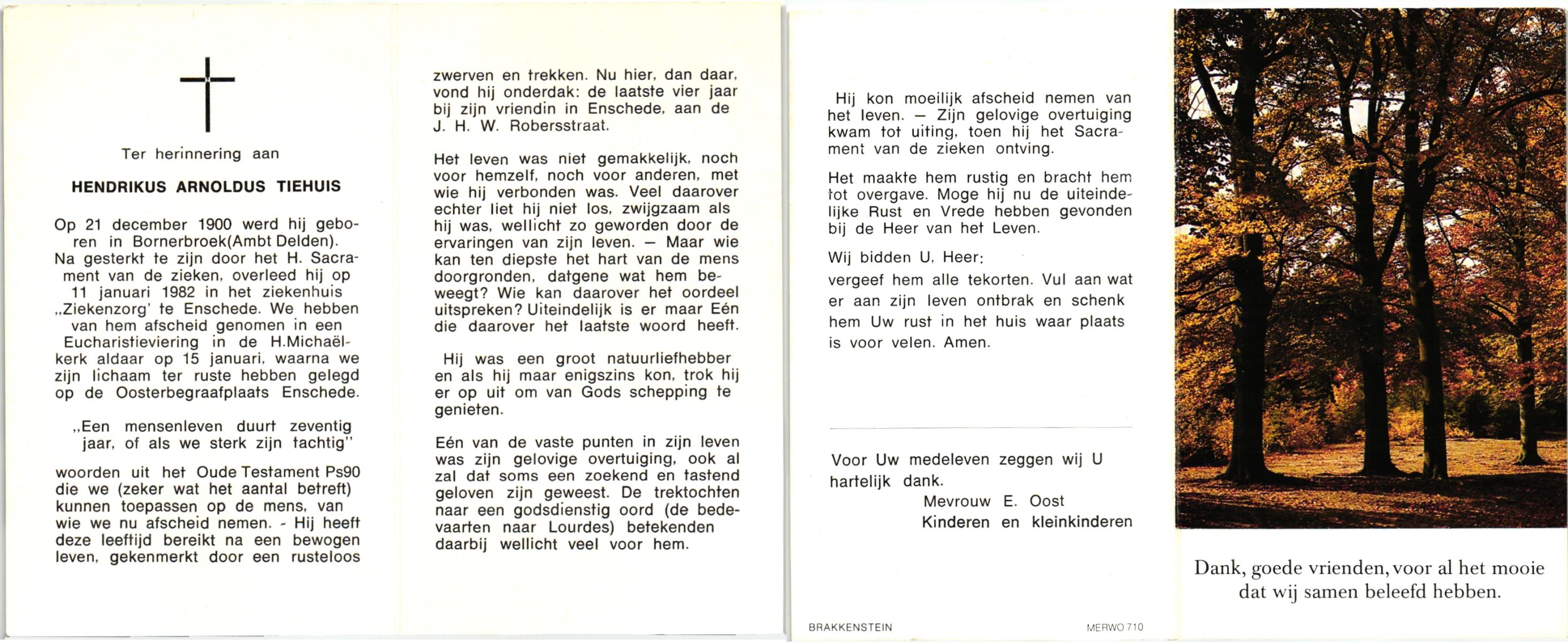 TIEHUIS, , Hendrikus Arnoldus, geboren op 21-12-1900 te Bornerbroek, overleden op 11-1-1982 te Enschede op 81-jarige leeftijd, begraven op 15-1-1982 te Enschede.