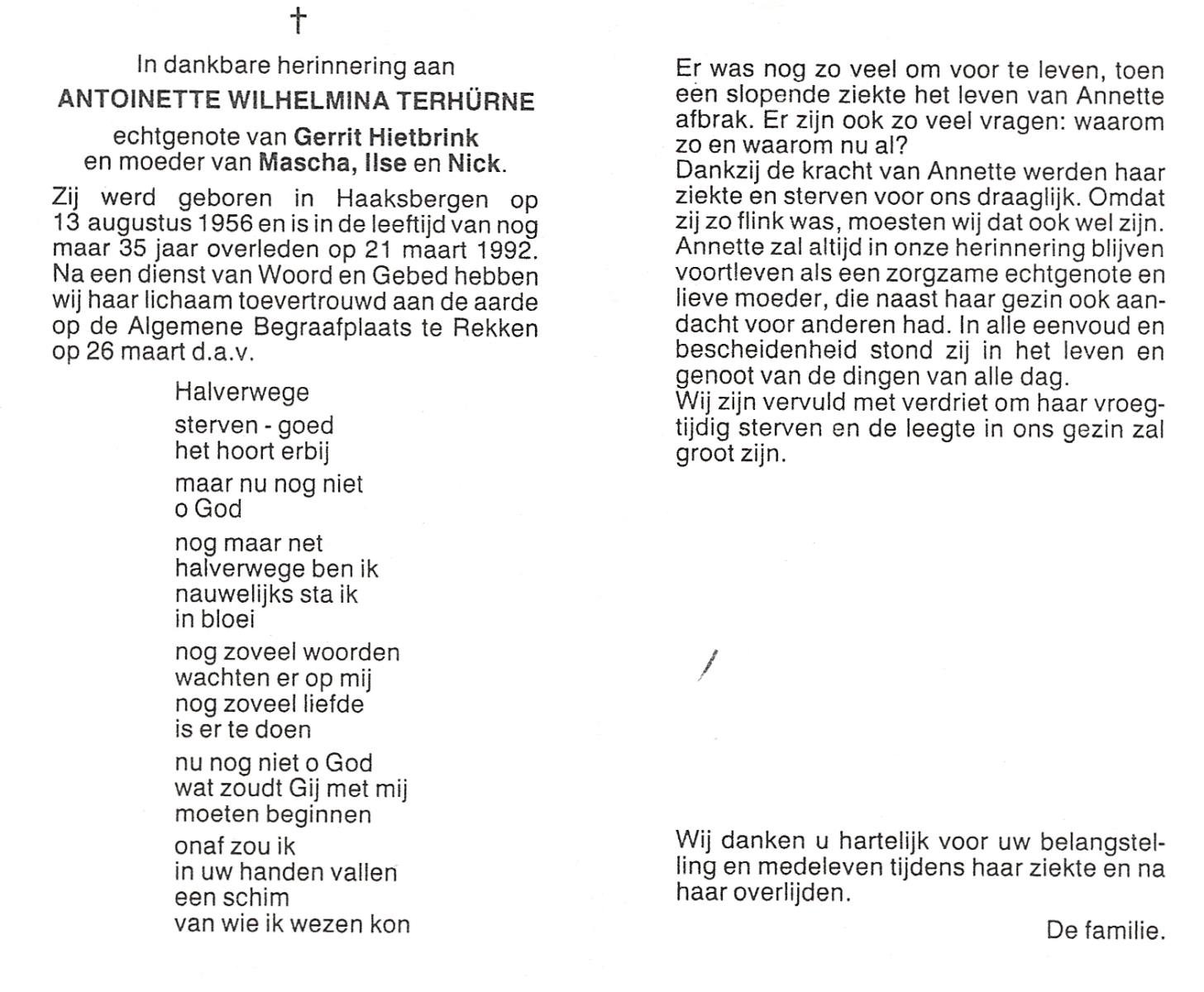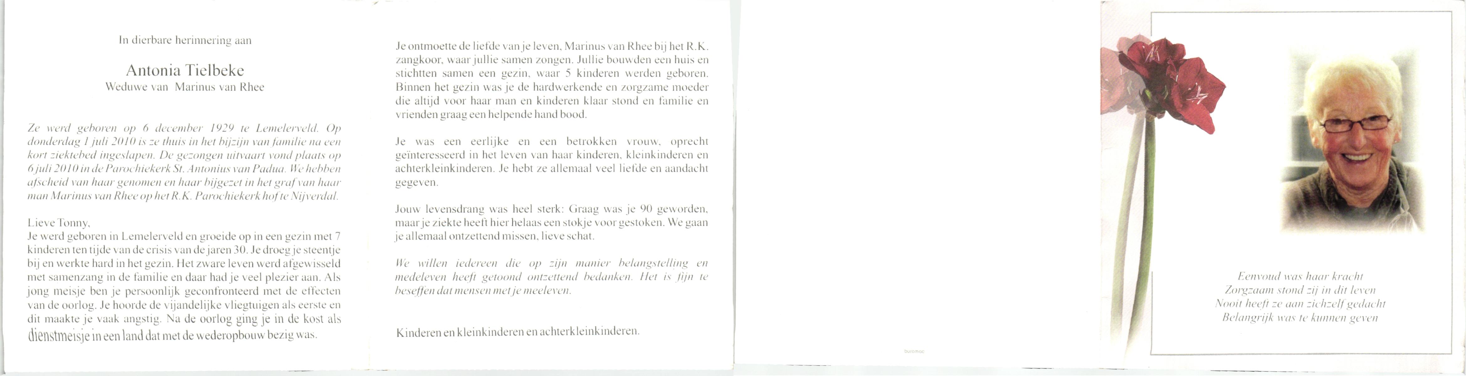 TIELBEKE, , Antonia, geboren op 6-12-1929 te Lemerlerveld, overleden op 1-7-2010 te Hellendoorn, Nijverdal op 80-jarige leeftijd, begraven op 6-7-2010 te Hellendoorn, Nijverdal.