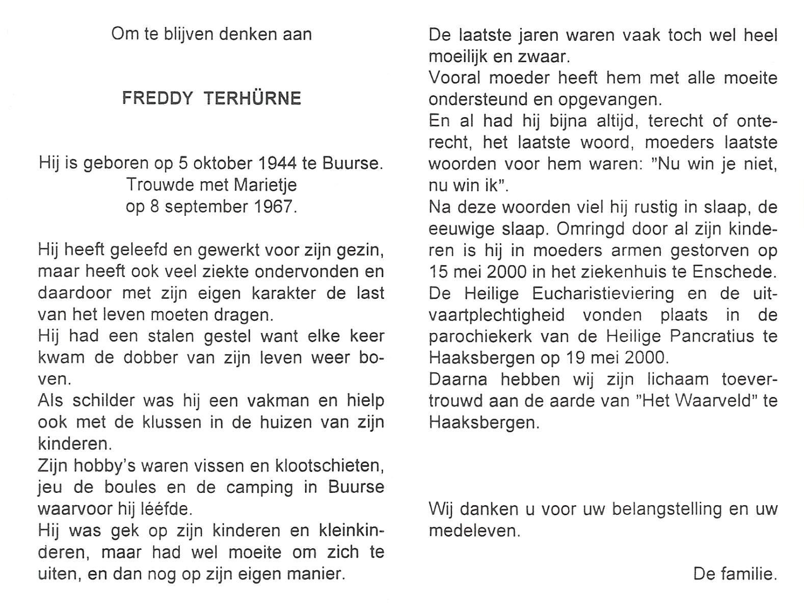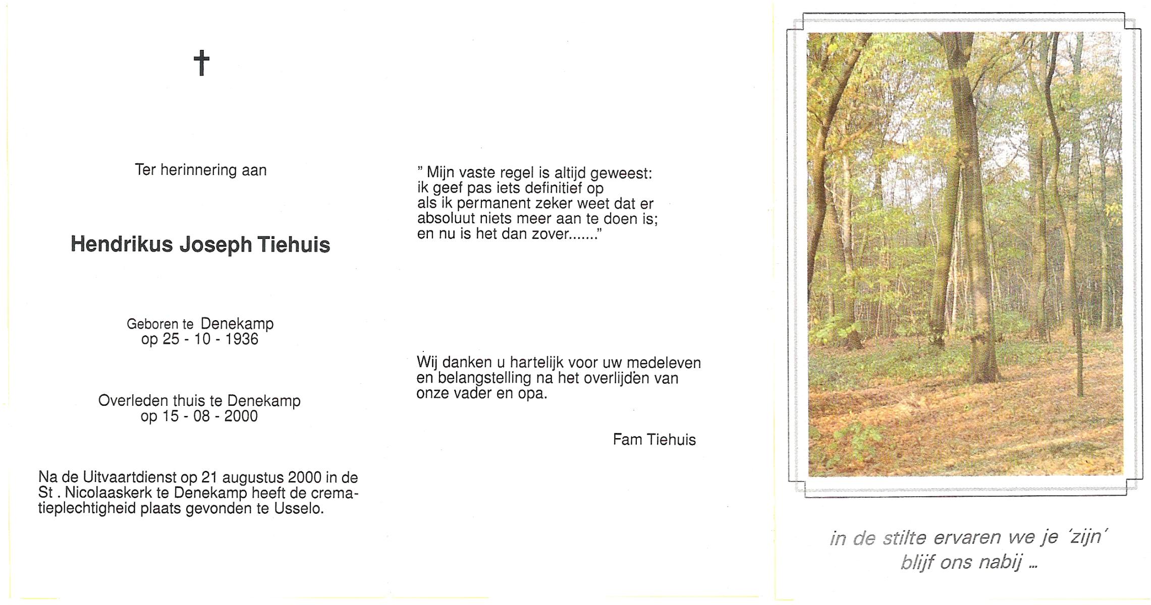 TIEHUIS, Hendrikus Joseph, geboren op 25-10-1936 te Denekamp, overleden op 15-8-2000 te Denekamp op 63-jarige leeftijd, gecremeerd op 21-8-2000 te Usselo.