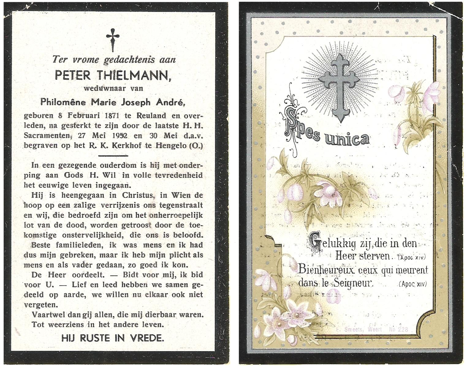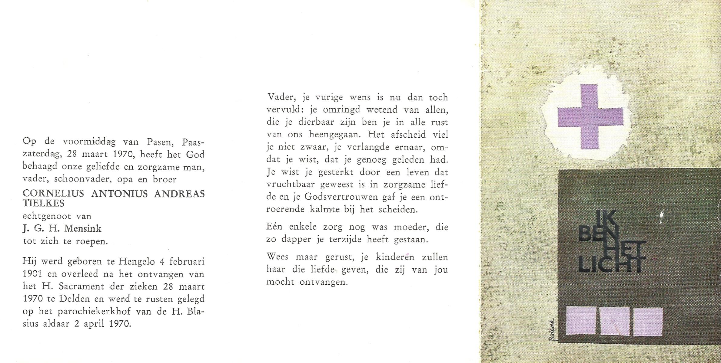TIELKES, Cornelius Antonius Andreas, geboren op 4-2-1901 te Hengelo (O), overleden op 28-3-1970 te Delden op 69-jarige leeftijd, begraven op 2-4-1970 te Delden.