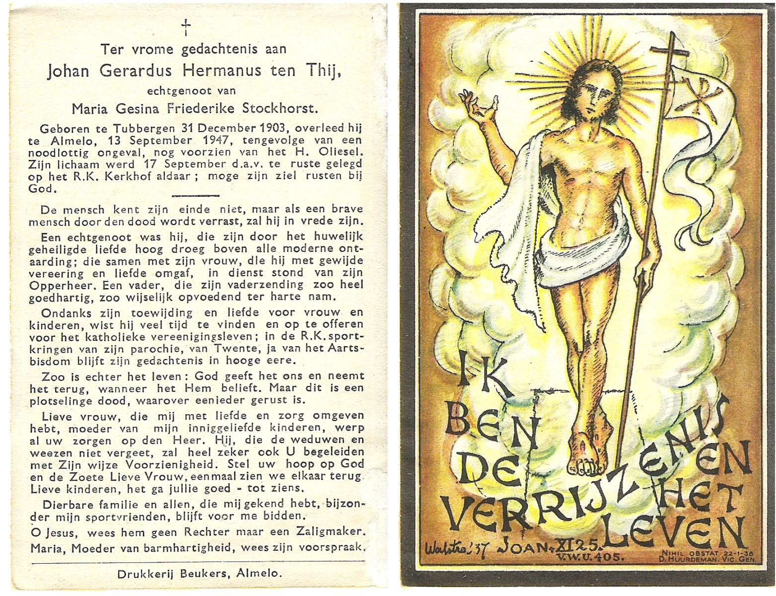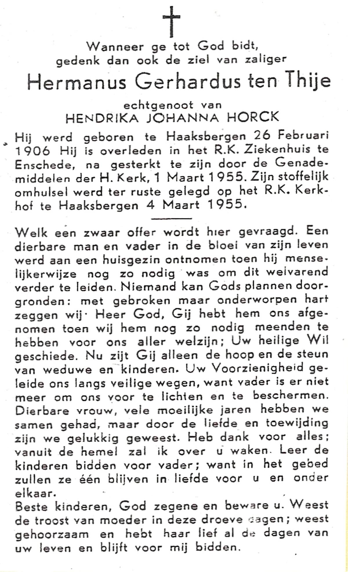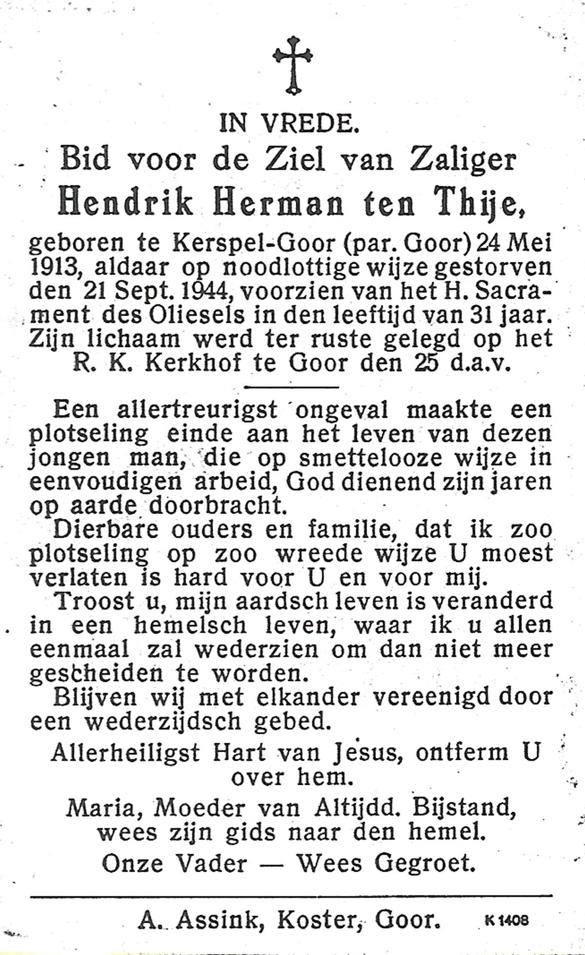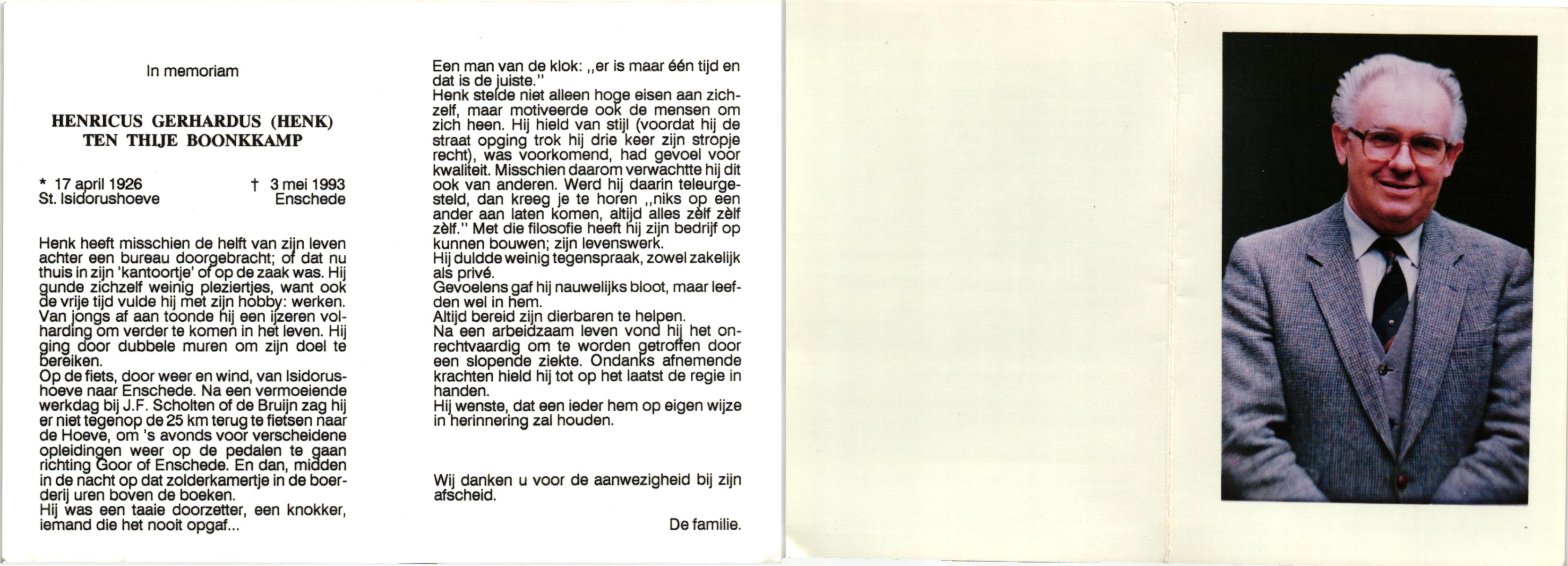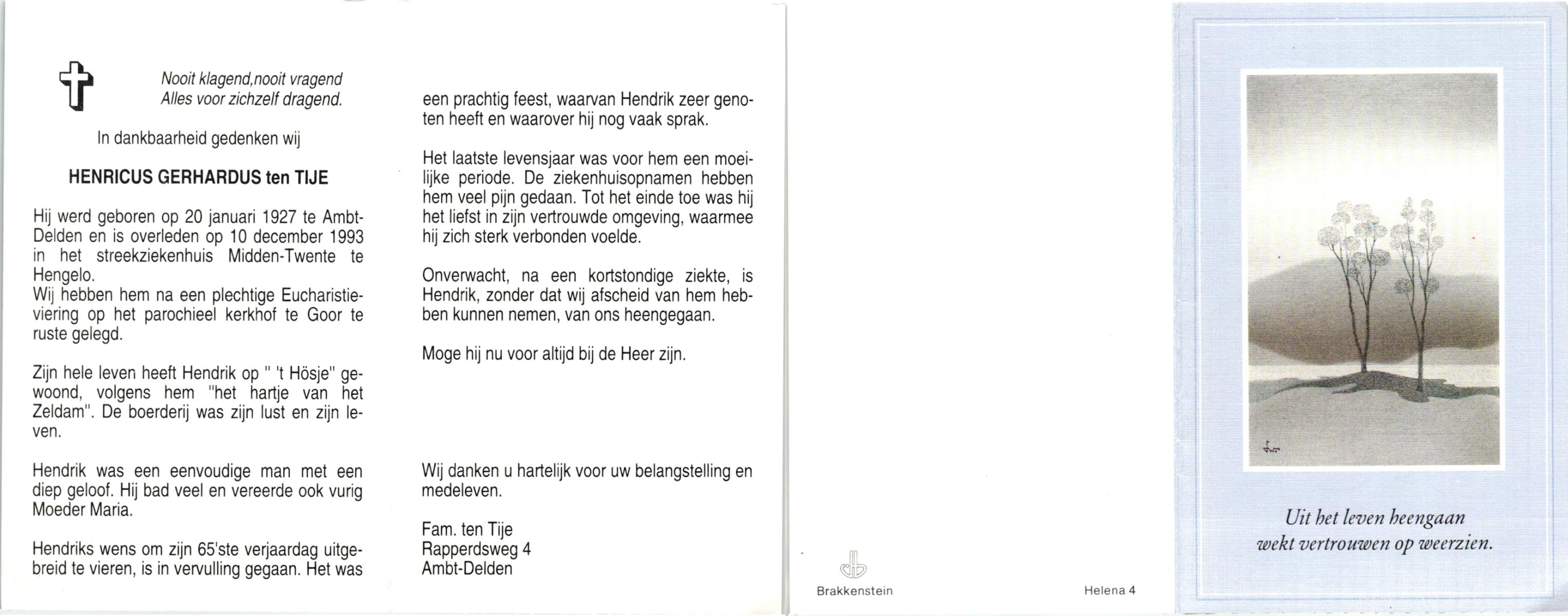 TIJE, ten, Henricus Gerhardus, geboren op 20-1-1927 te Delden, Ambt, overleden op 10-12-1993 te Hengelo (O) op 66-jarige leeftijd, begraven te Goor.