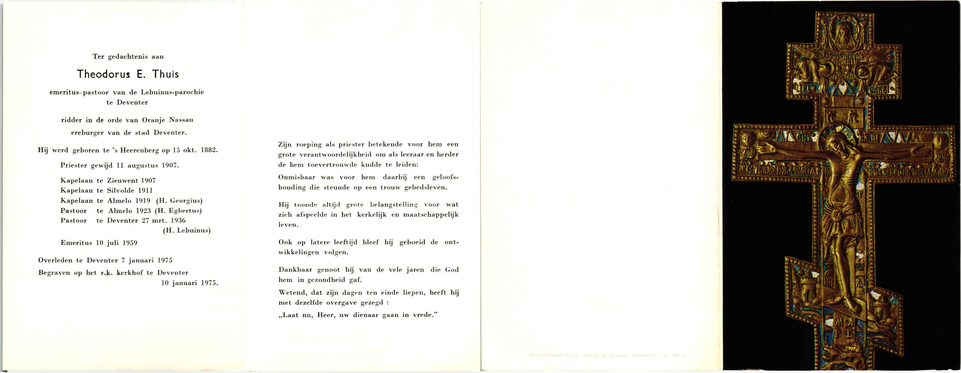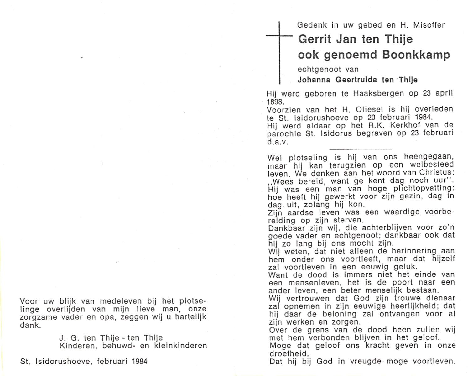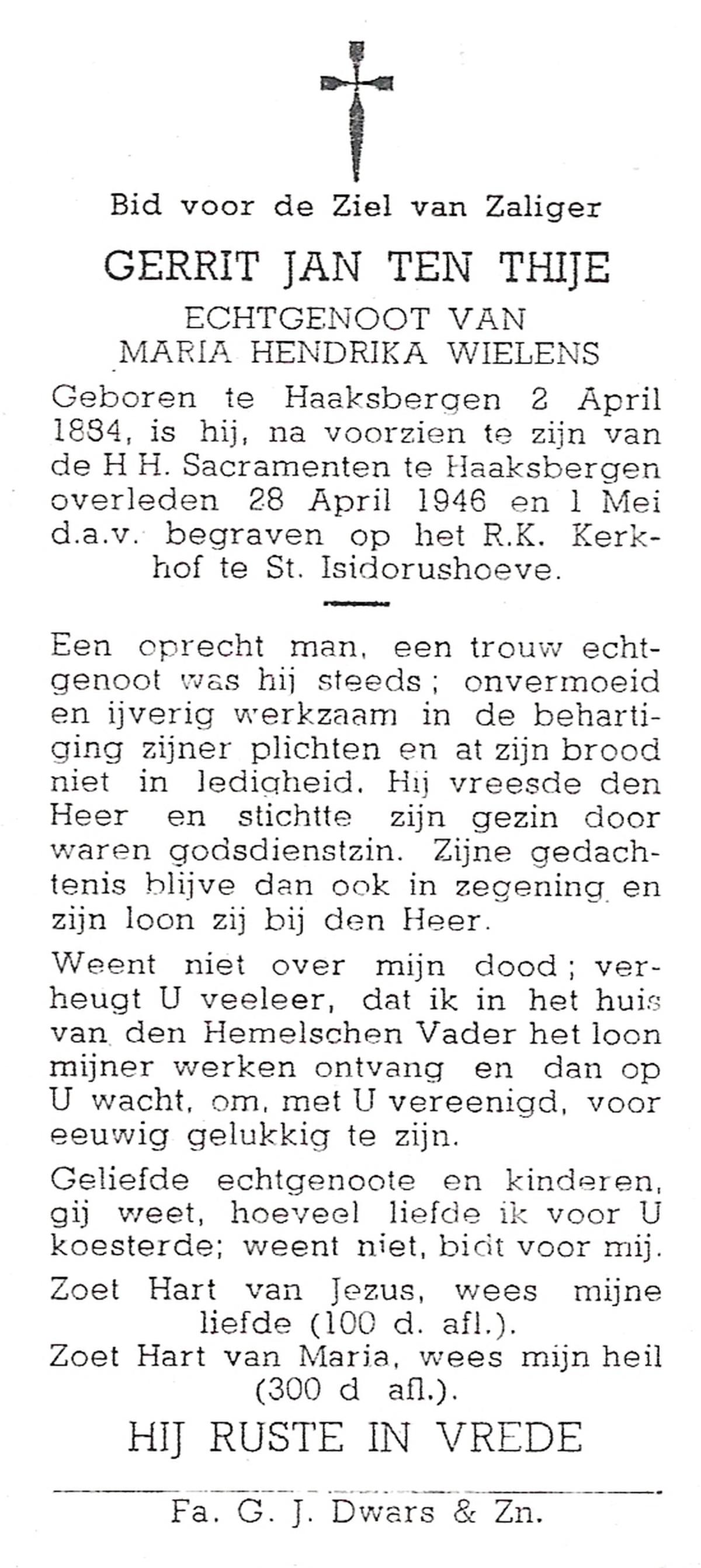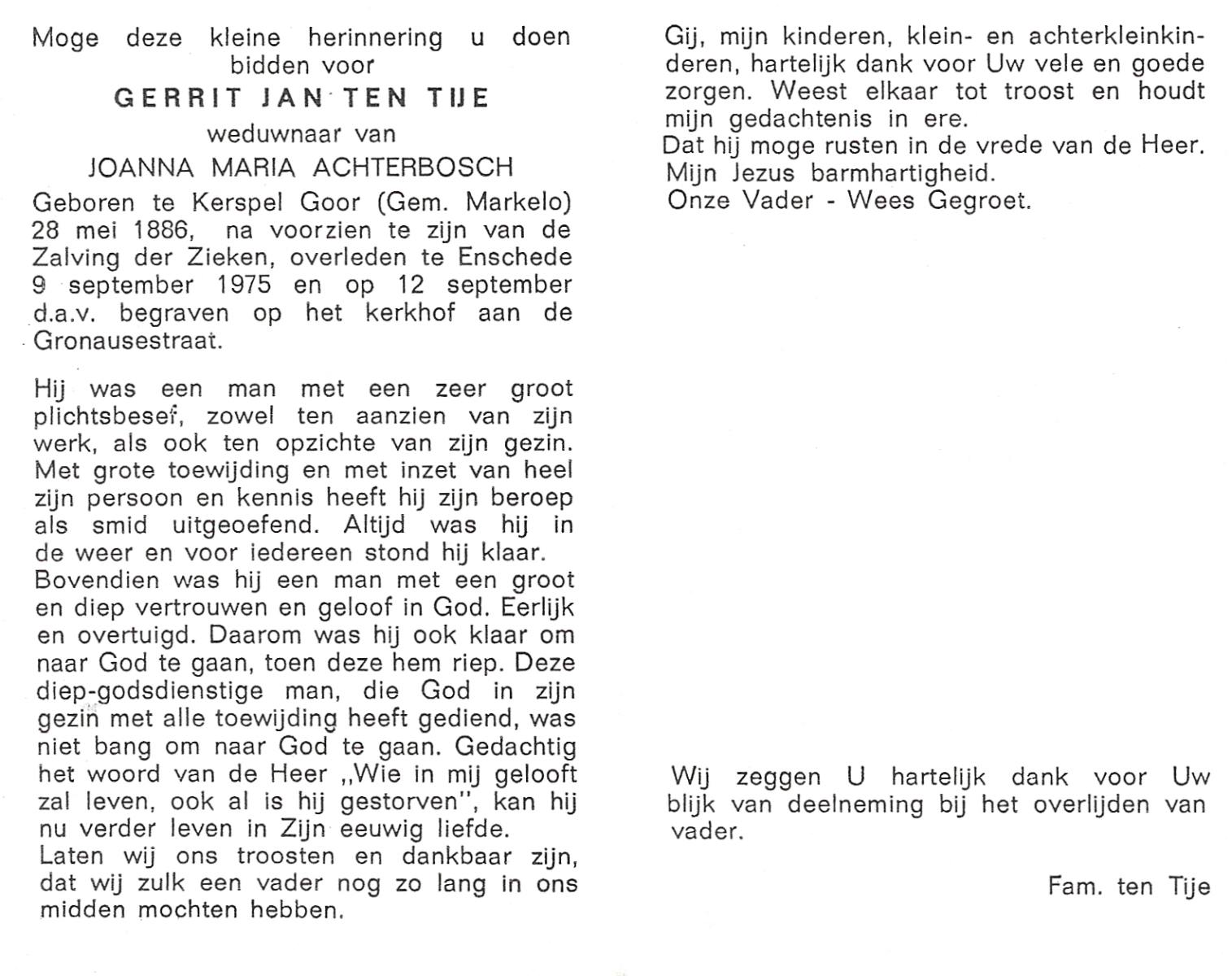 TIJE, ten, Gerrit Jan, geboren op 28-06-1886 te Goor, overleden op 9-9-1975 te Enschede op 89-jarige leeftijd, begraven op 12-9-1975 te Enschede.