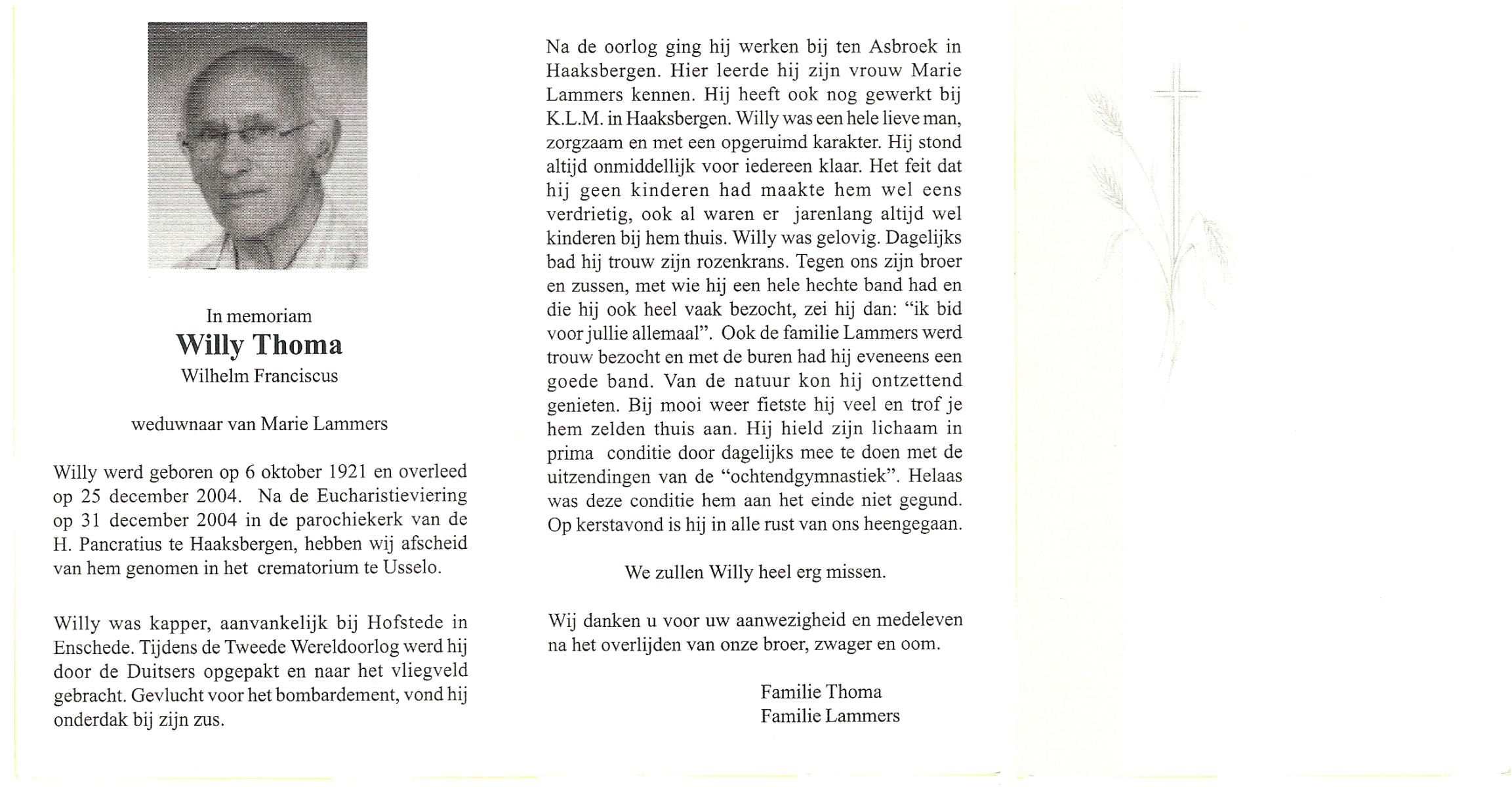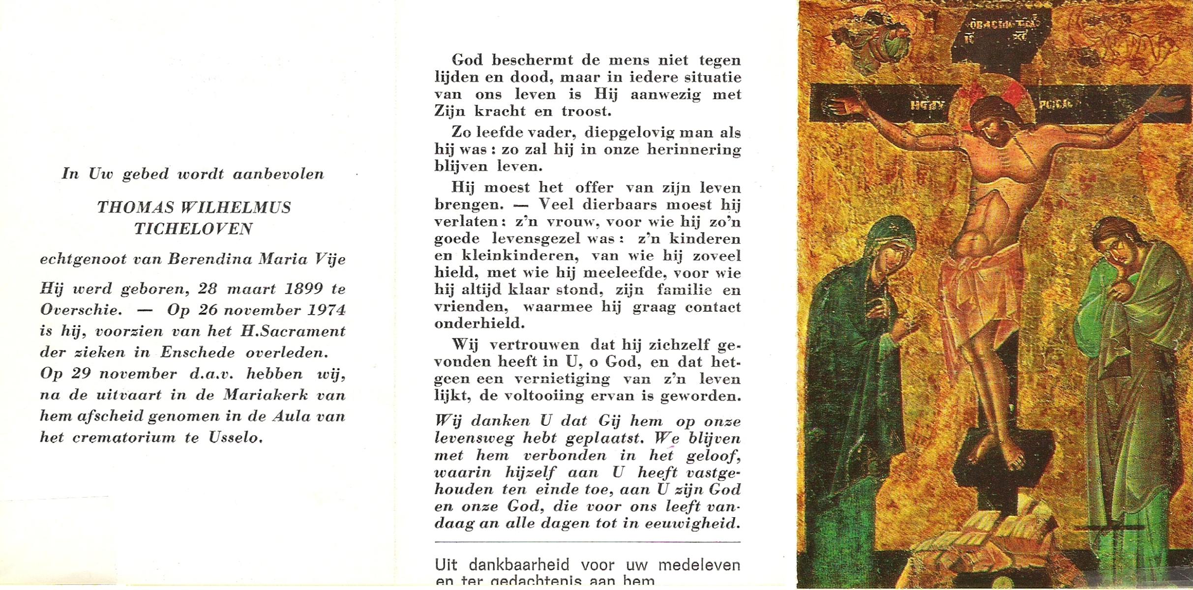 TICHELOVEN, Thomas Wilhelmus, geboren op 28-03-1899 te Overschie, overleden op 26-11-1974 te Enschede op 75-jarige leeftijd, gecremeerd op 29-11-1974 te Usselo.