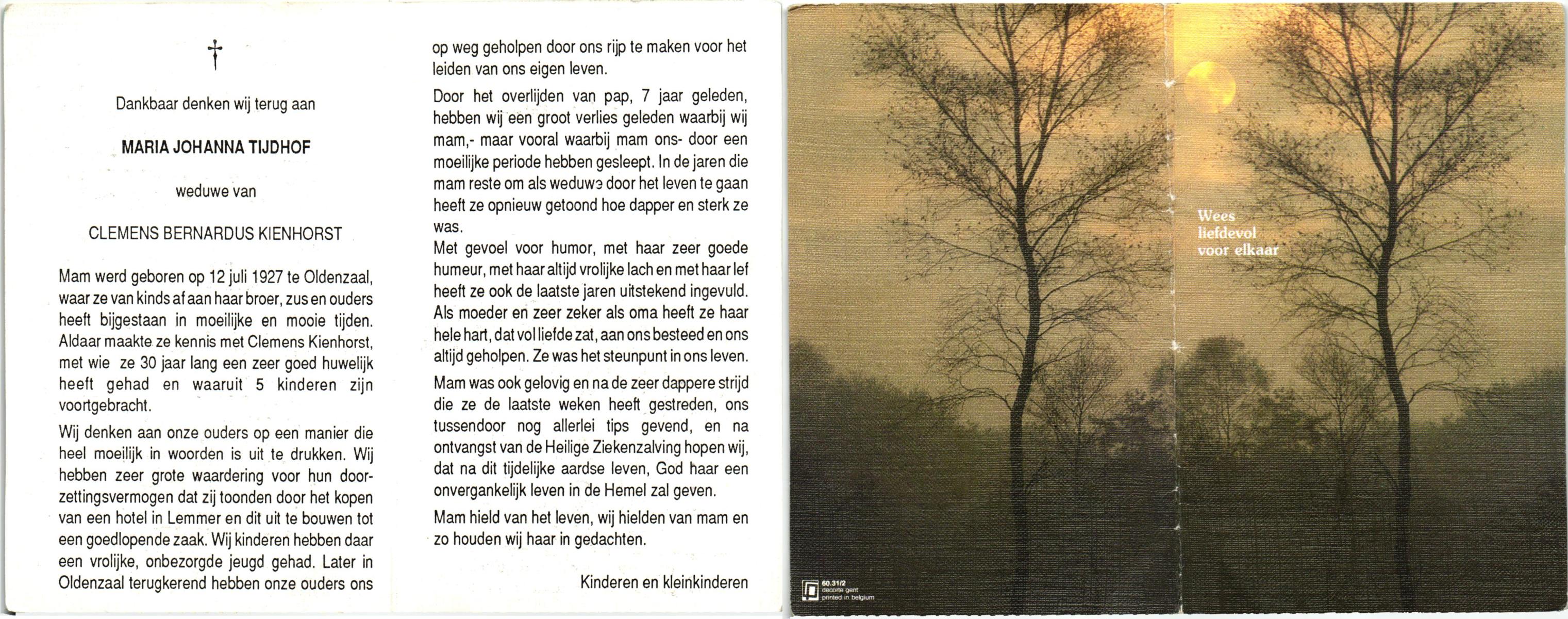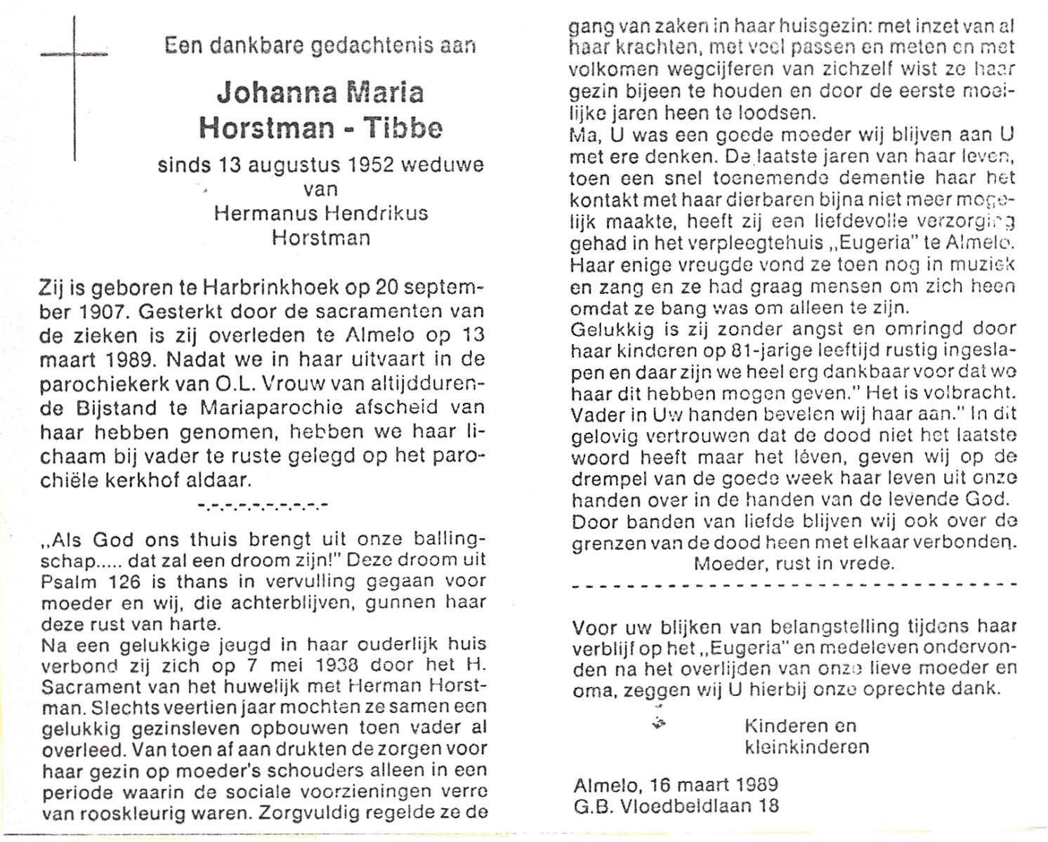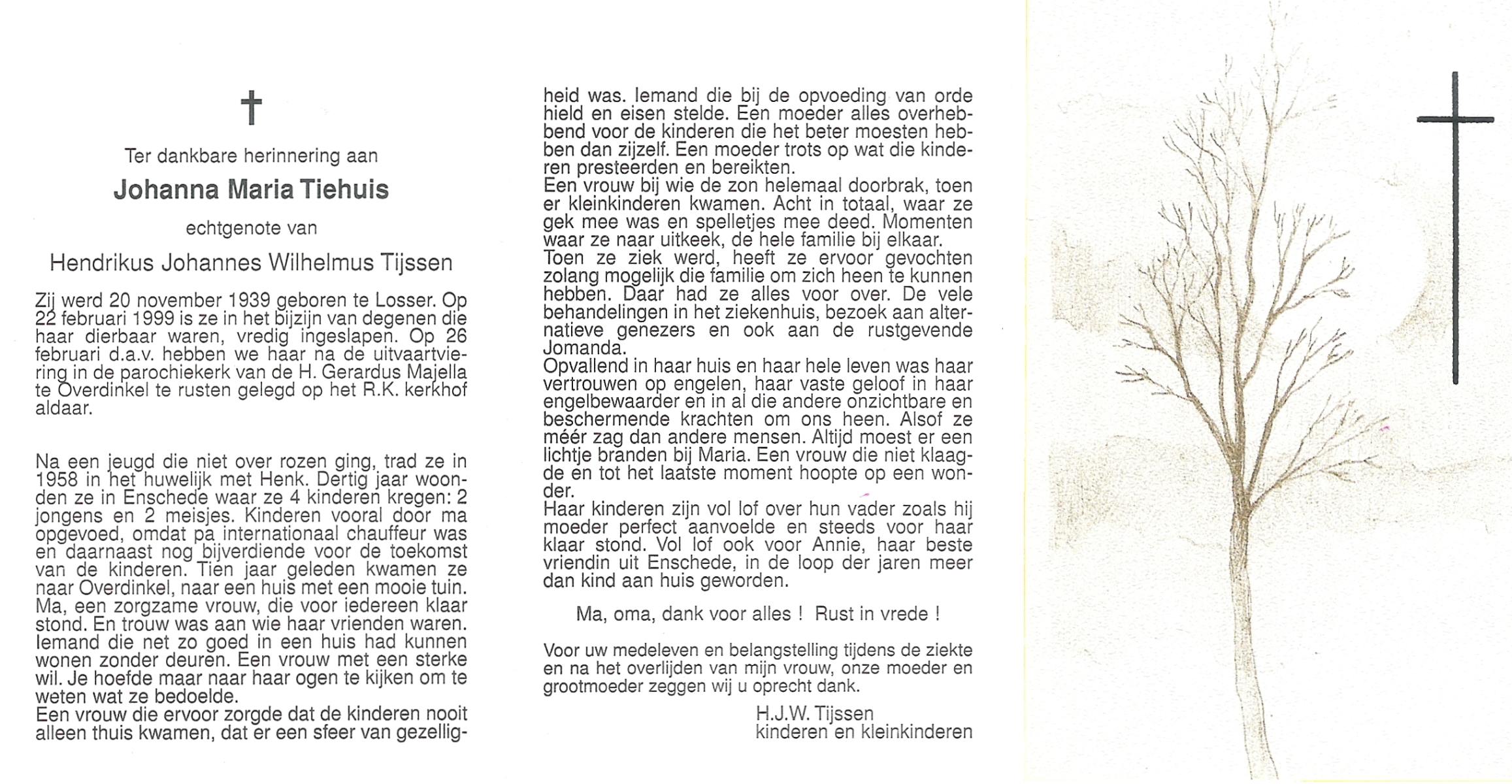 TIEHUIS, Johanna Maria, geboren op 20-11-1939 te Losser, overleden op 22-2-1999 op 59-jarige leeftijd, begraven op 26-2-1999 te Overdinkel.