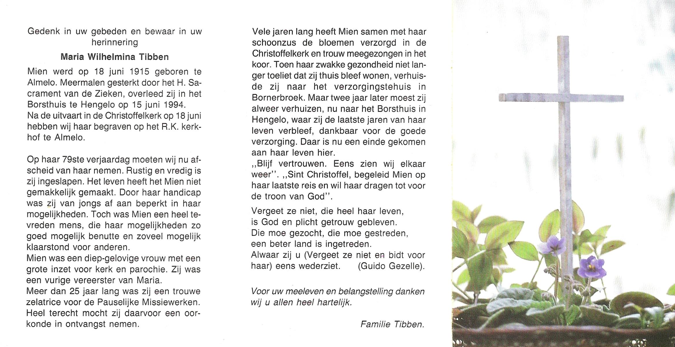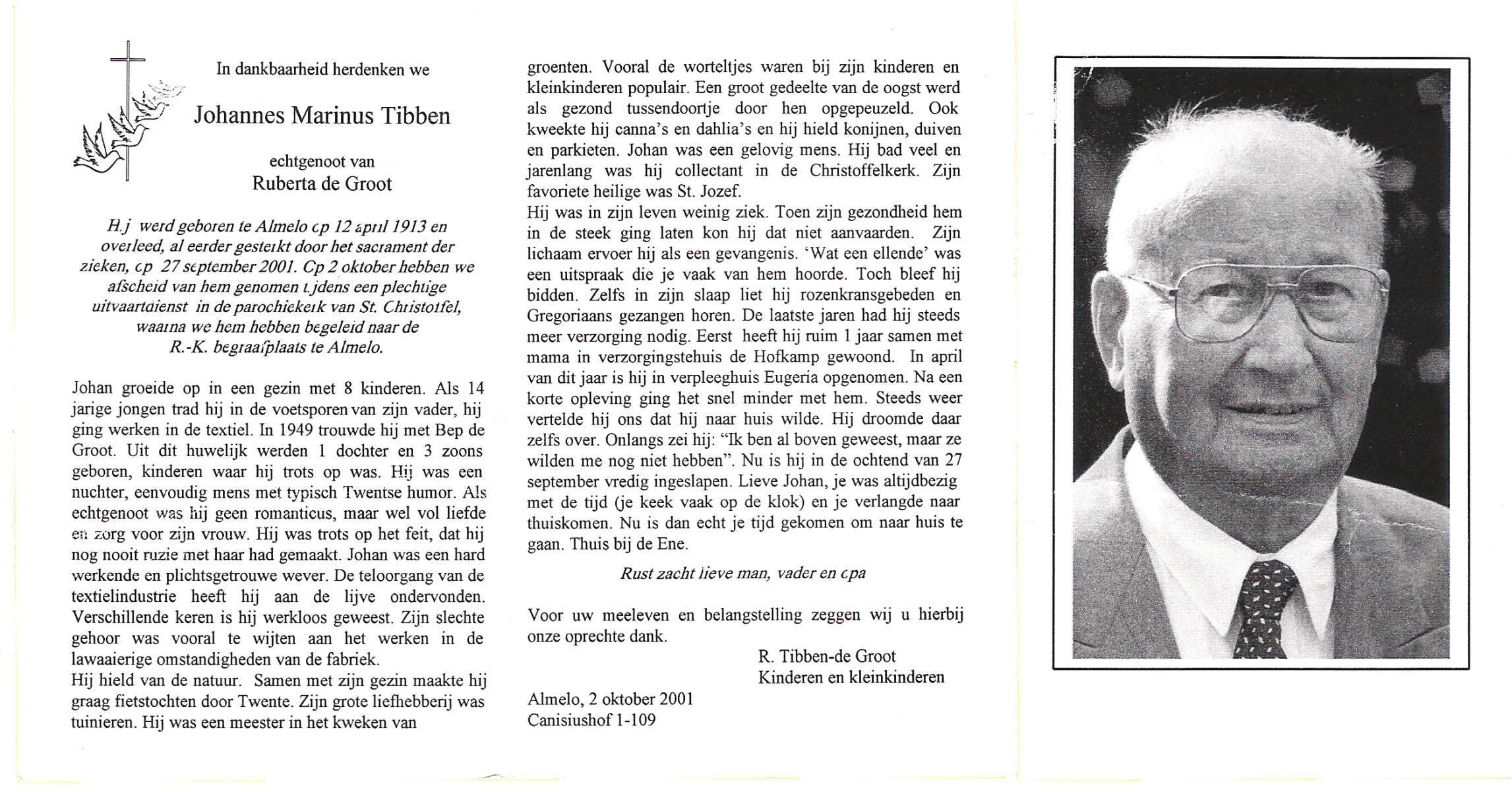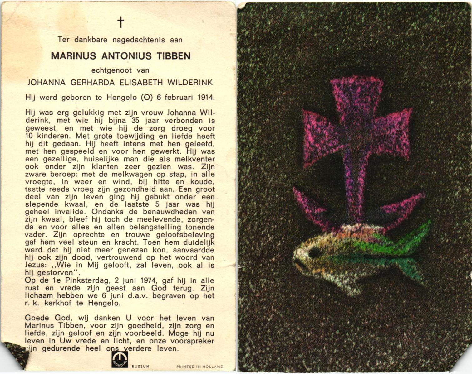 TIBBEN, Marinus Antonius, geboren op 6-2-1914 te Hengelo, overleden op 2-6-1974 te Hengelo op 60-jarige leeftijd, begraven op 6-6-1974 te Hengelo.