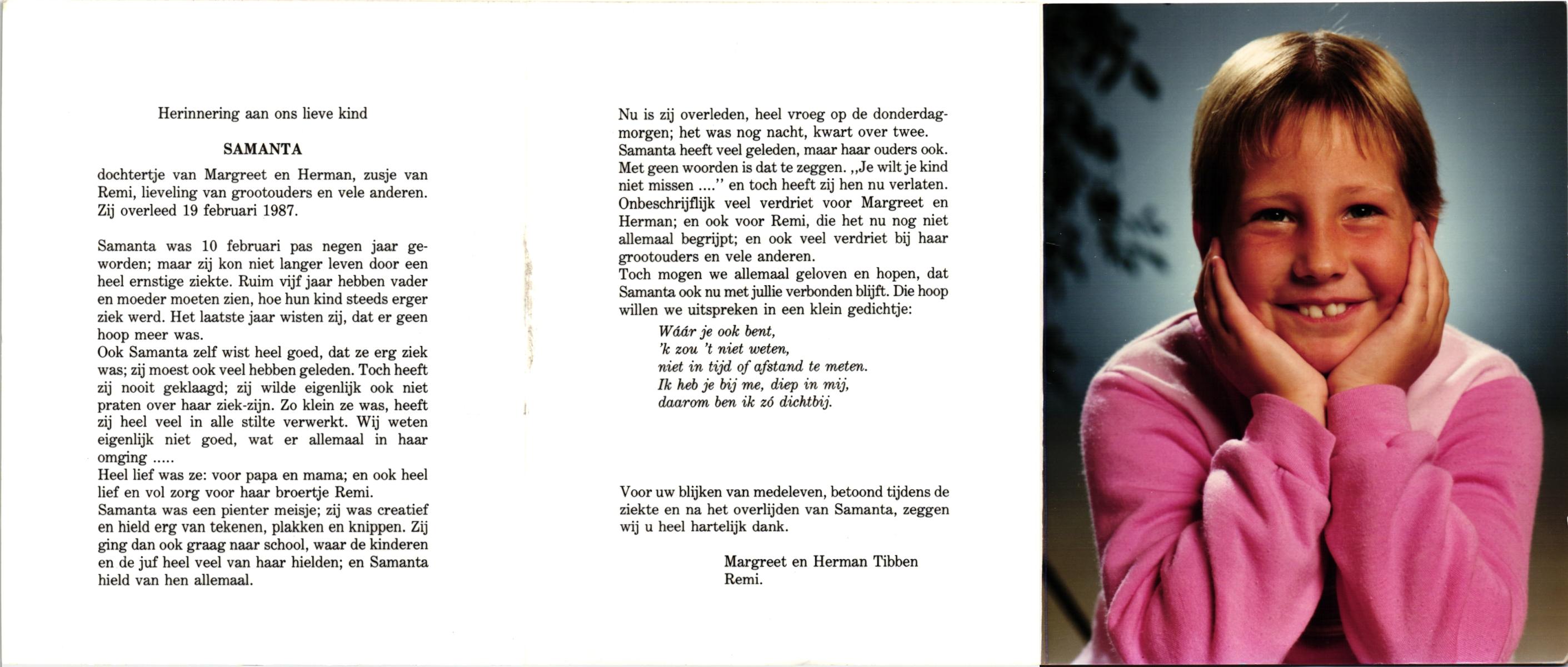 TIBBEN, Samanta, geboren op 10-2-1978, overleden op 19-2-1987 op 9-jarige leeftijd.