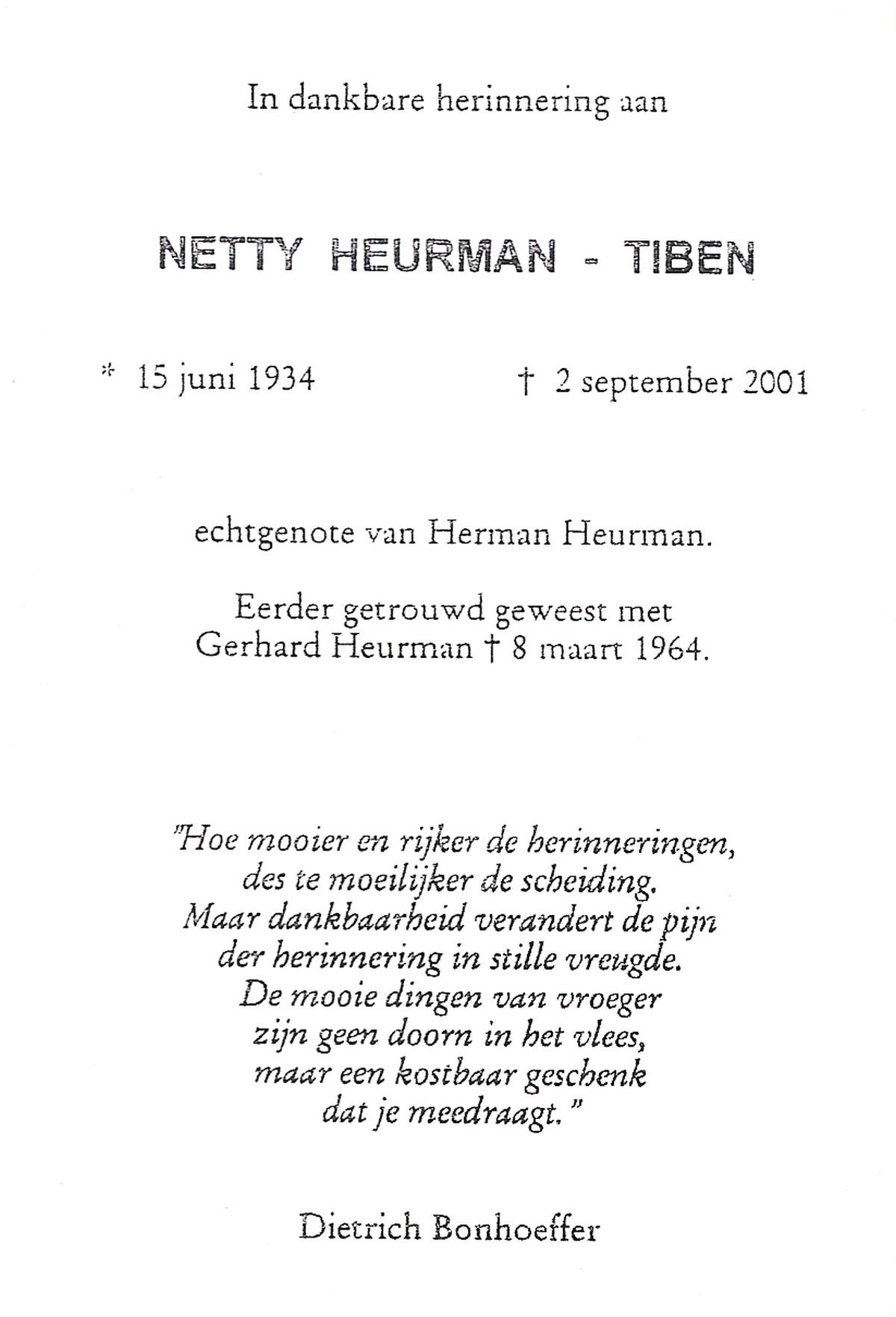 TIBEN, Netty, geboren op 15-6-1934, overleden op 3-9-2001 op 67-jarige leeftijd.