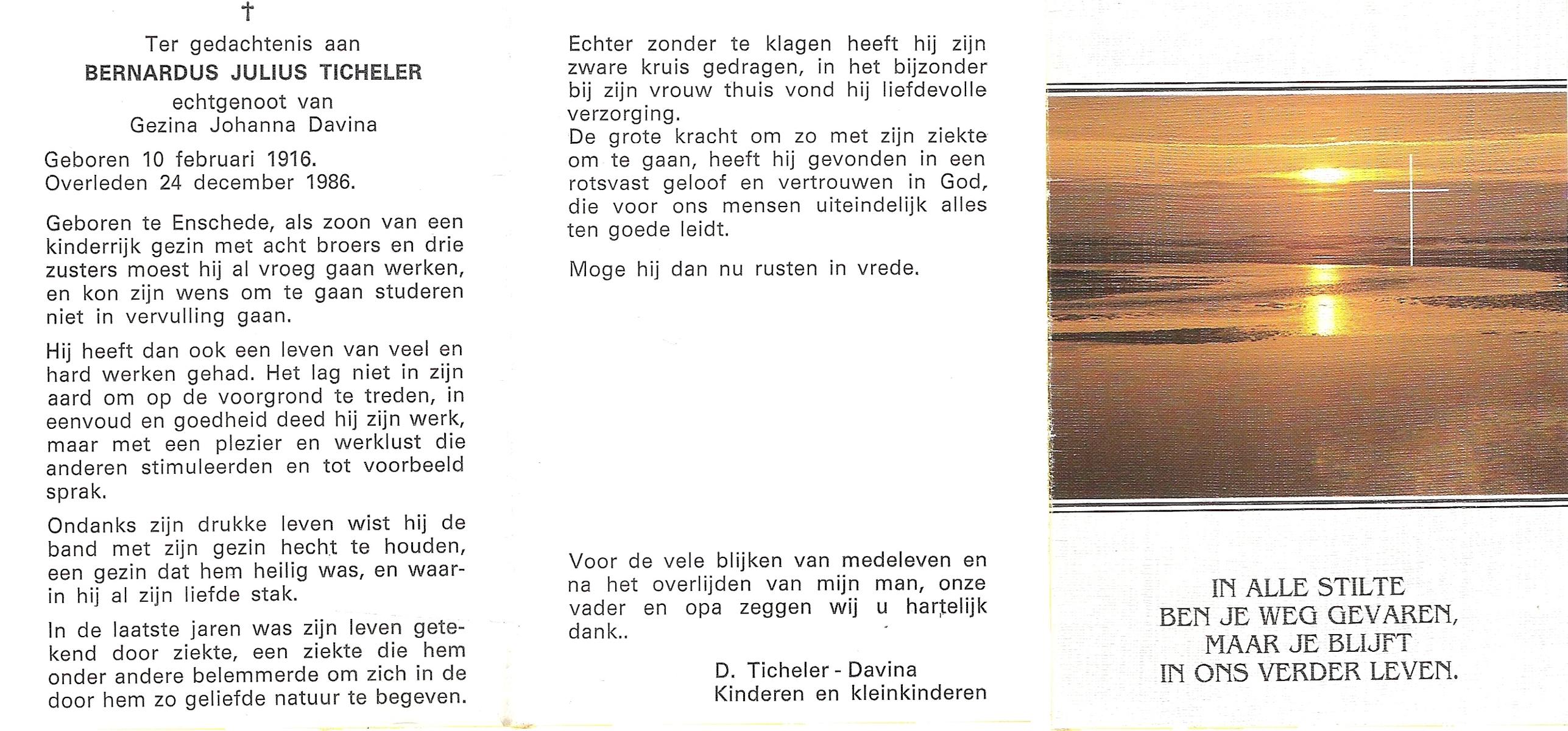 TICHELER, Bernardus Julius, geboren op 10-2-1916 te Enschede, overleden op 24-12-1986 op 70-jarige leeftijd.
