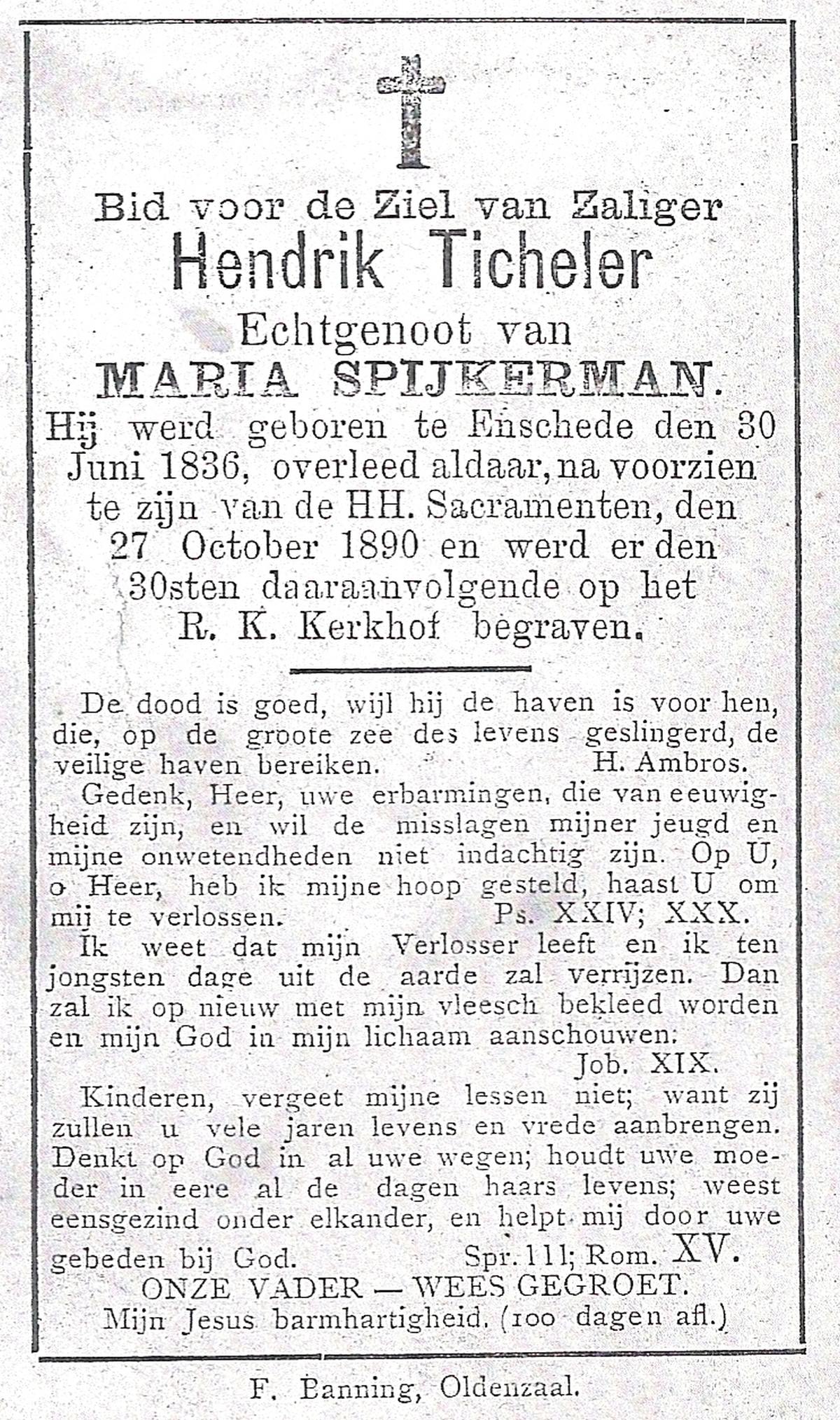 TICHELER, Hendrik, geboren op 30-06-1836 te Enschede, overleden op 27-10-1890 op 54-jarige leeftijd, begraven op 30-10-1890 te Enschede.