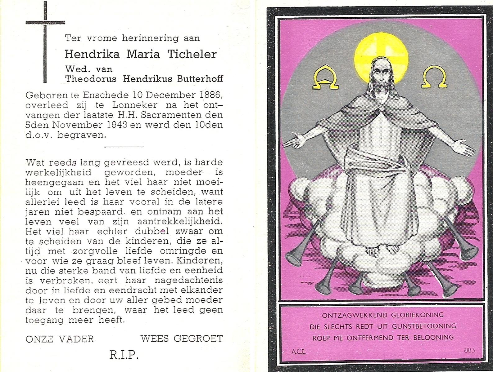 TICHELER, Hendrika Maria, geboren op 10-12-1886 te Enschede, overleden op 5-11-1943 te Lonneker op 56-jarige leeftijd, begraven op 10-11-1943 te Lonneker.