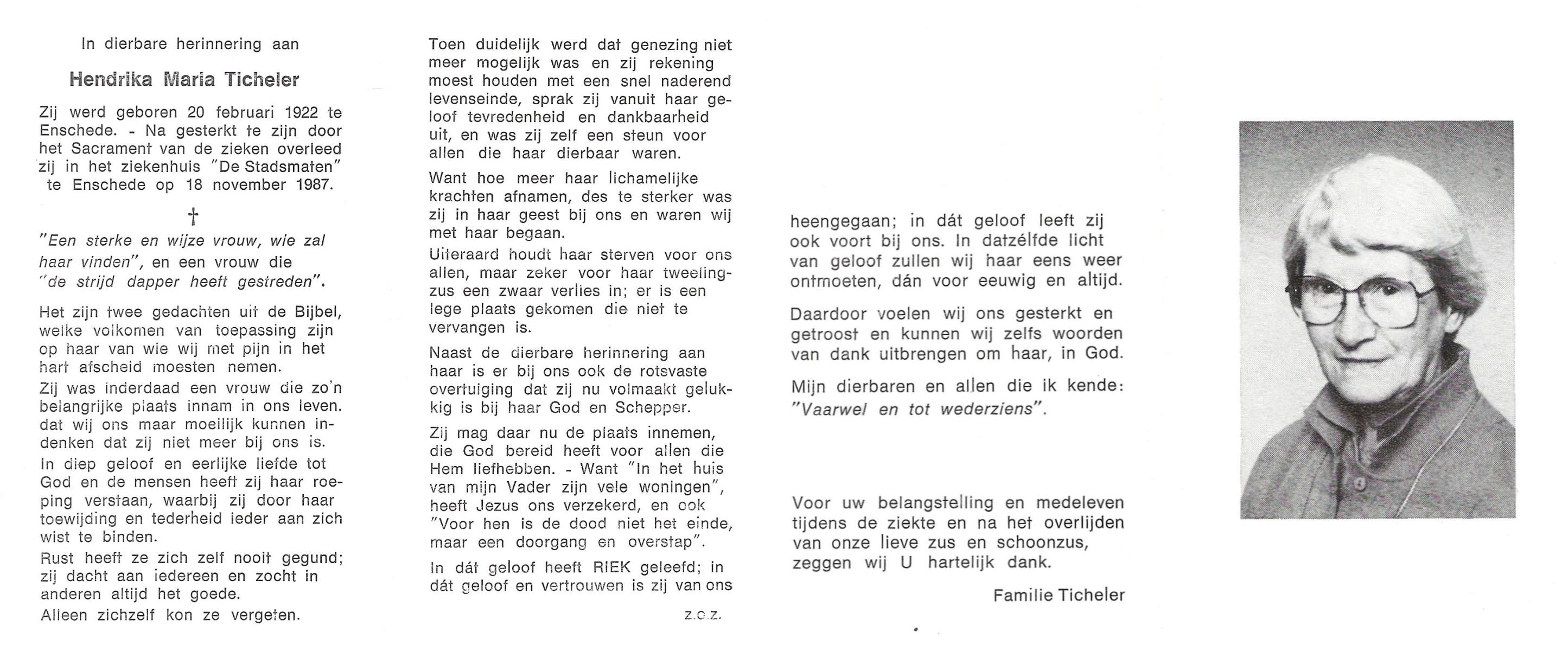 TICHELER, Hendrika Maria, geboren op 20-2-1922 te Enschede, overleden op 18-11-1987 te Enschede op 65-jarige leeftijd.