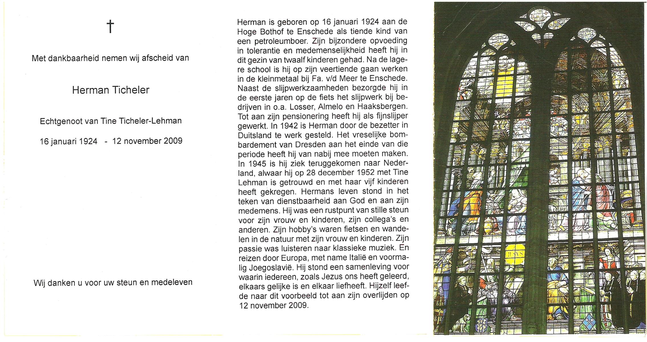 TICHELER, Herman, geboren op 16-1-1924 te Enschede, overleden op 12-11-2009 op 85-jarige leeftijd.