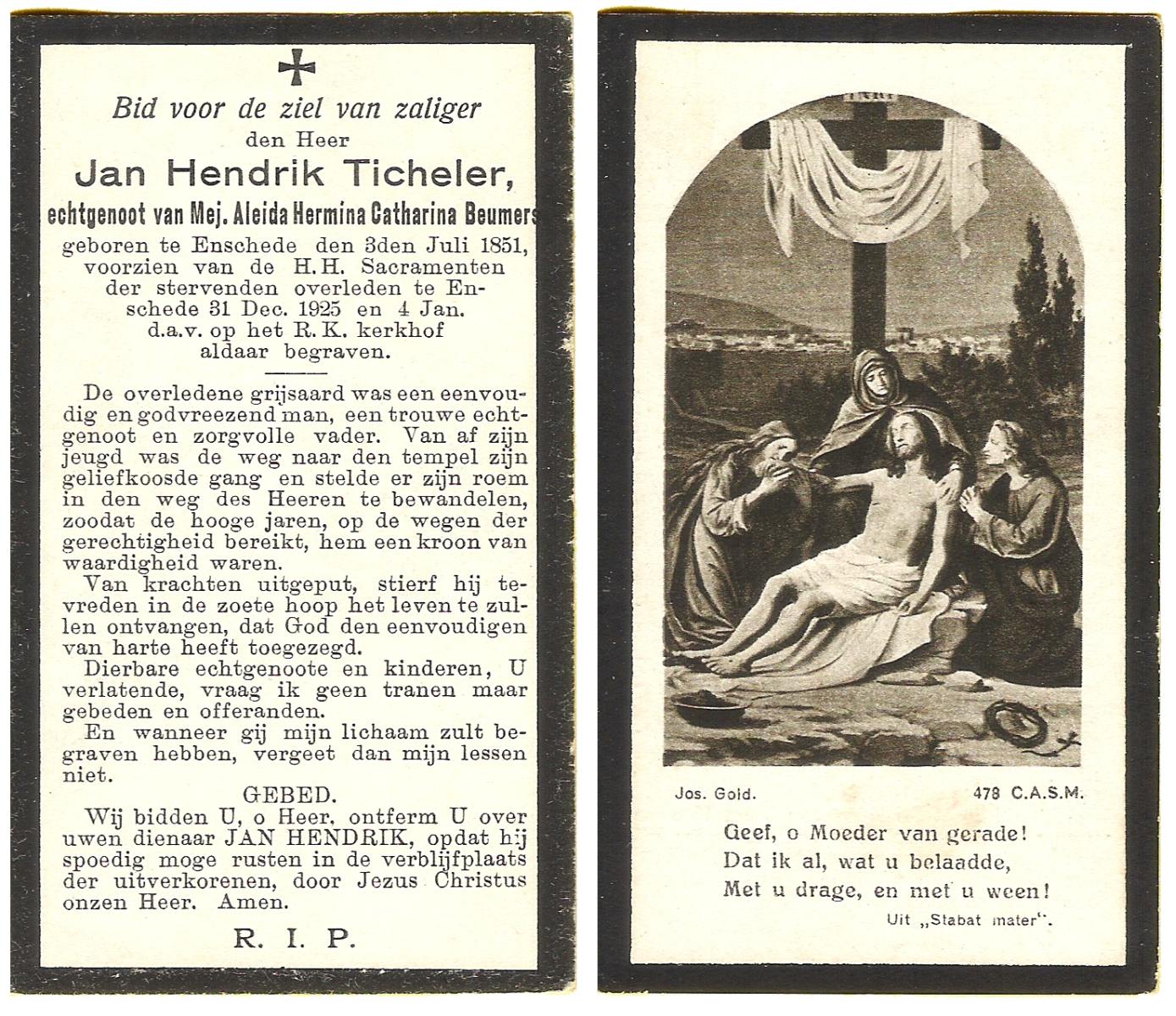 TICHELER, Jan Hendrik, geboren op 03-07-1851 te Enschede, overleden op 31-12-1925 te Enschede op 74-jarige leeftijd, begraven op 4-1-1926 te Enschede.
