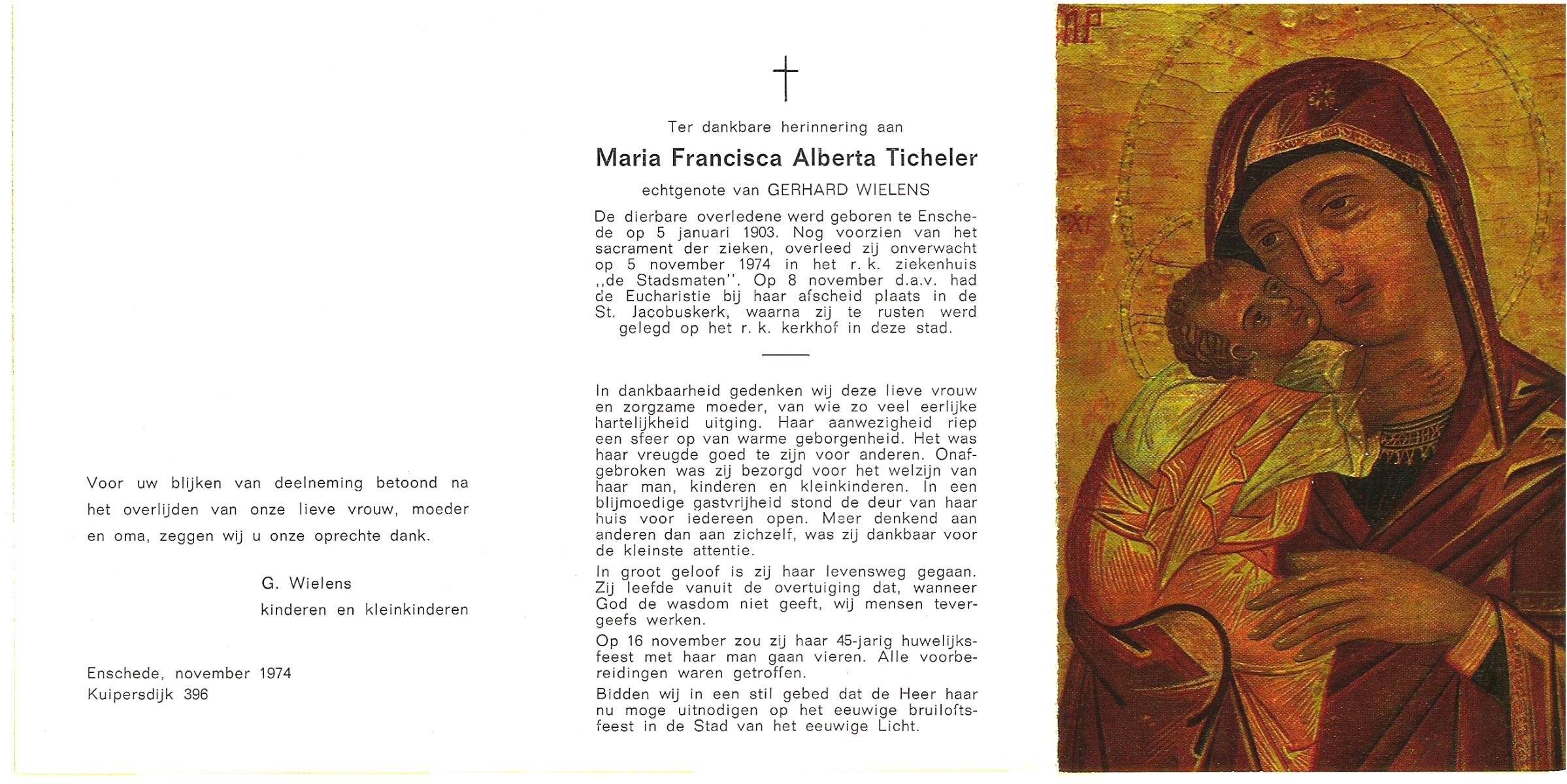 TICHELER, Maria Fancisca Alberta, geboren op 5-1-1903 te Enschede, overleden op 5-11-1974 te Enschede op 71-jarige leeftijd, begraven op 8-11-1974 te Enschede.