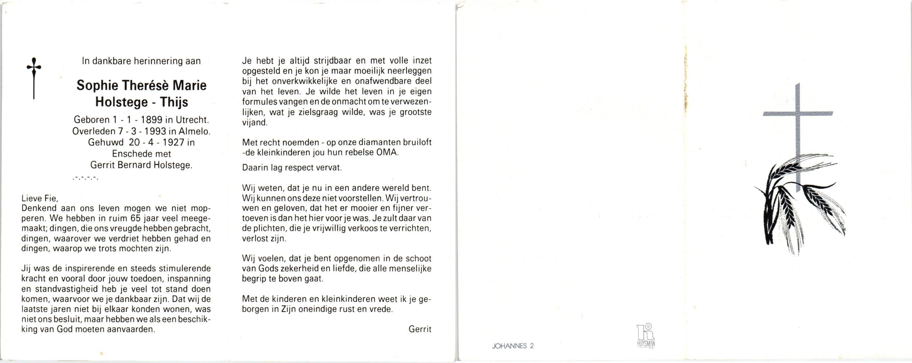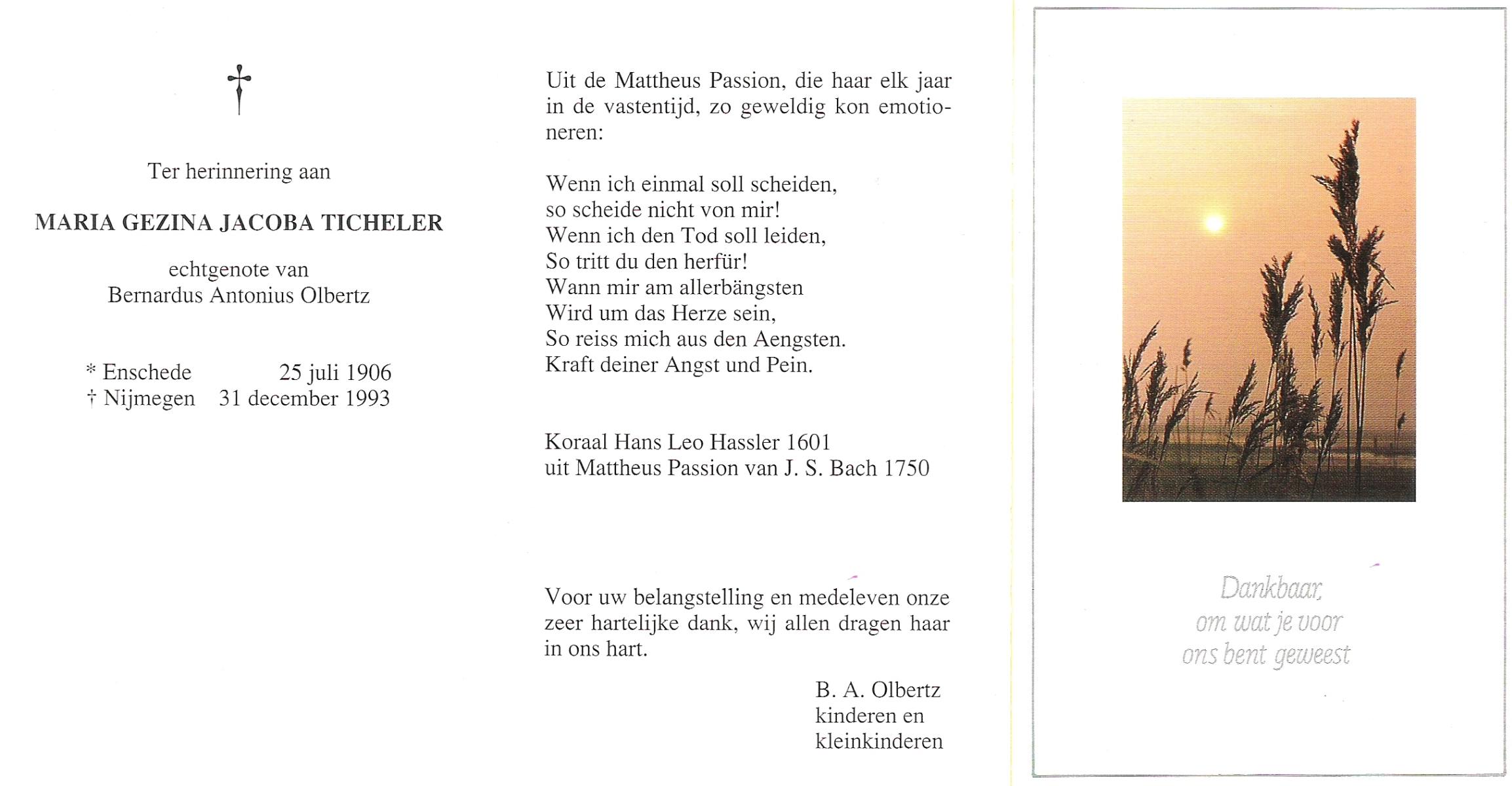 TICHELER, Maria Gezina Jacoba, geboren op 25-7-1906 te Enschede, overleden op 31-12-1993 te Nijmegen op 87-jarige leeftijd.