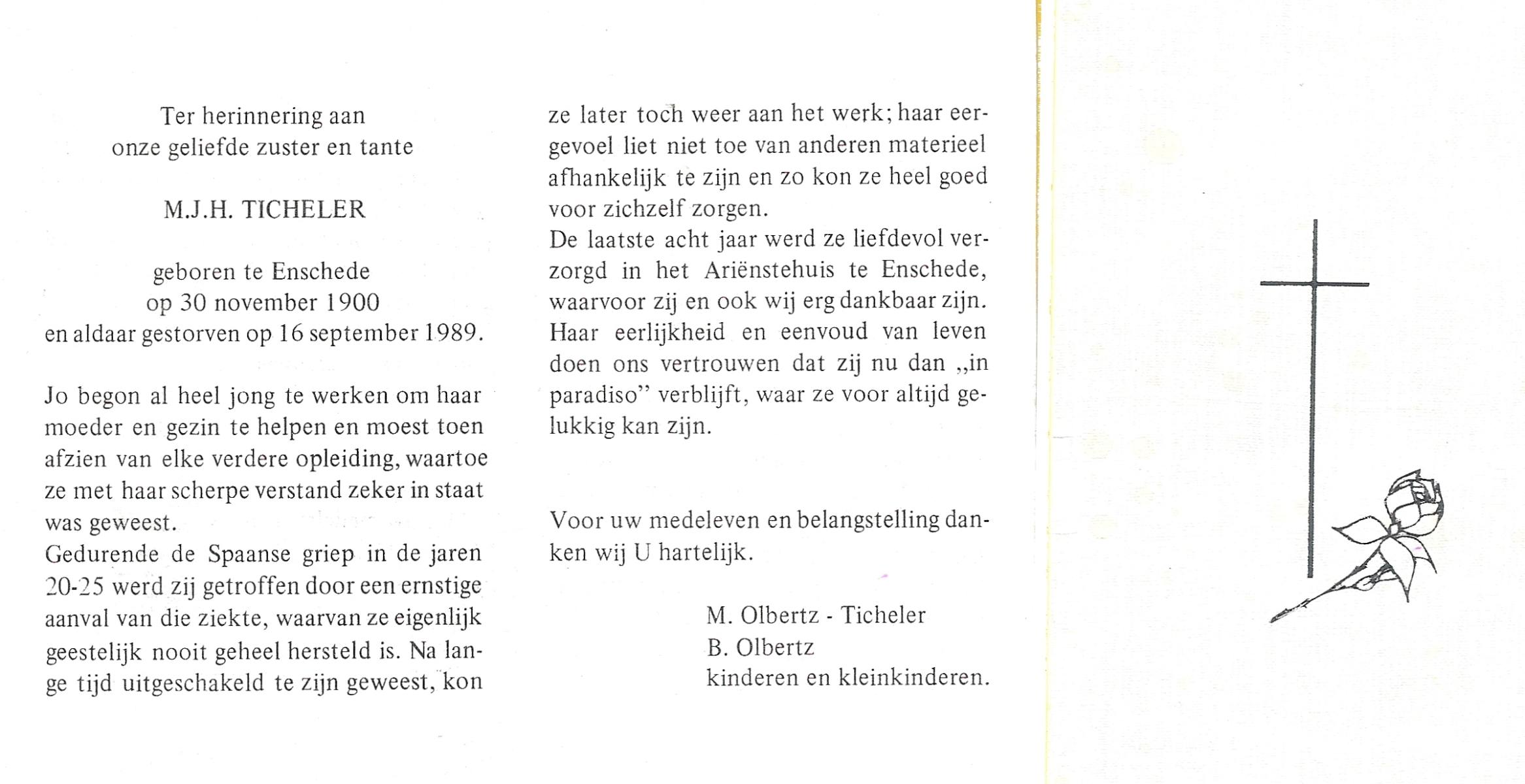 TICHELER, M.J.H. (Jo), geboren op 30-11-1900 te Enschede, overleden op 16-9-1989 te Enschede op 88-jarige leeftijd.