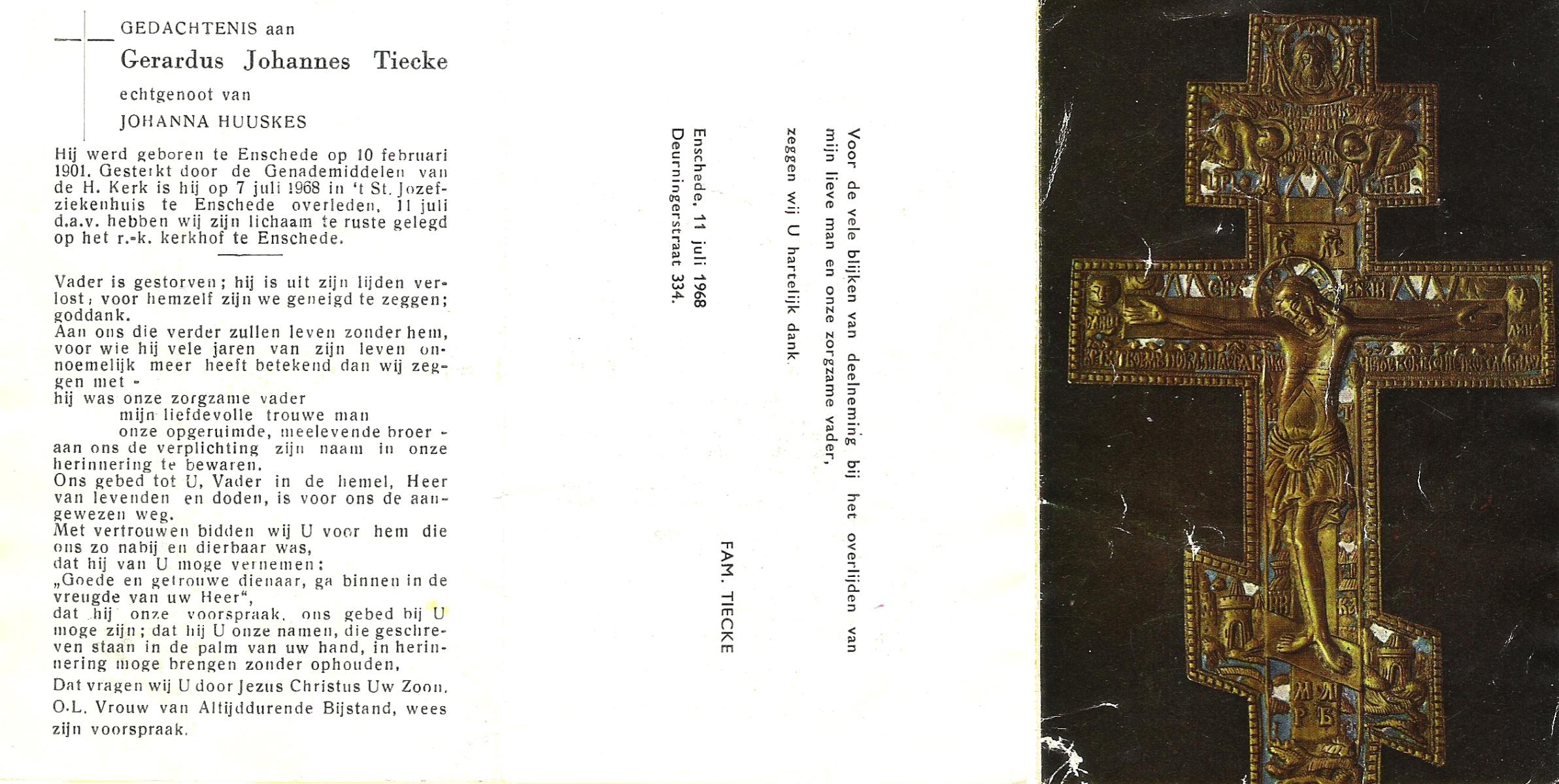 TIECKE, Gerardus Johannes, geboren op 10-2-1901 te Enschede, overleden op 7-7-1968 te Enschede op 67-jarige leeftijd, begraven op 11-7-1968 te Enschede.