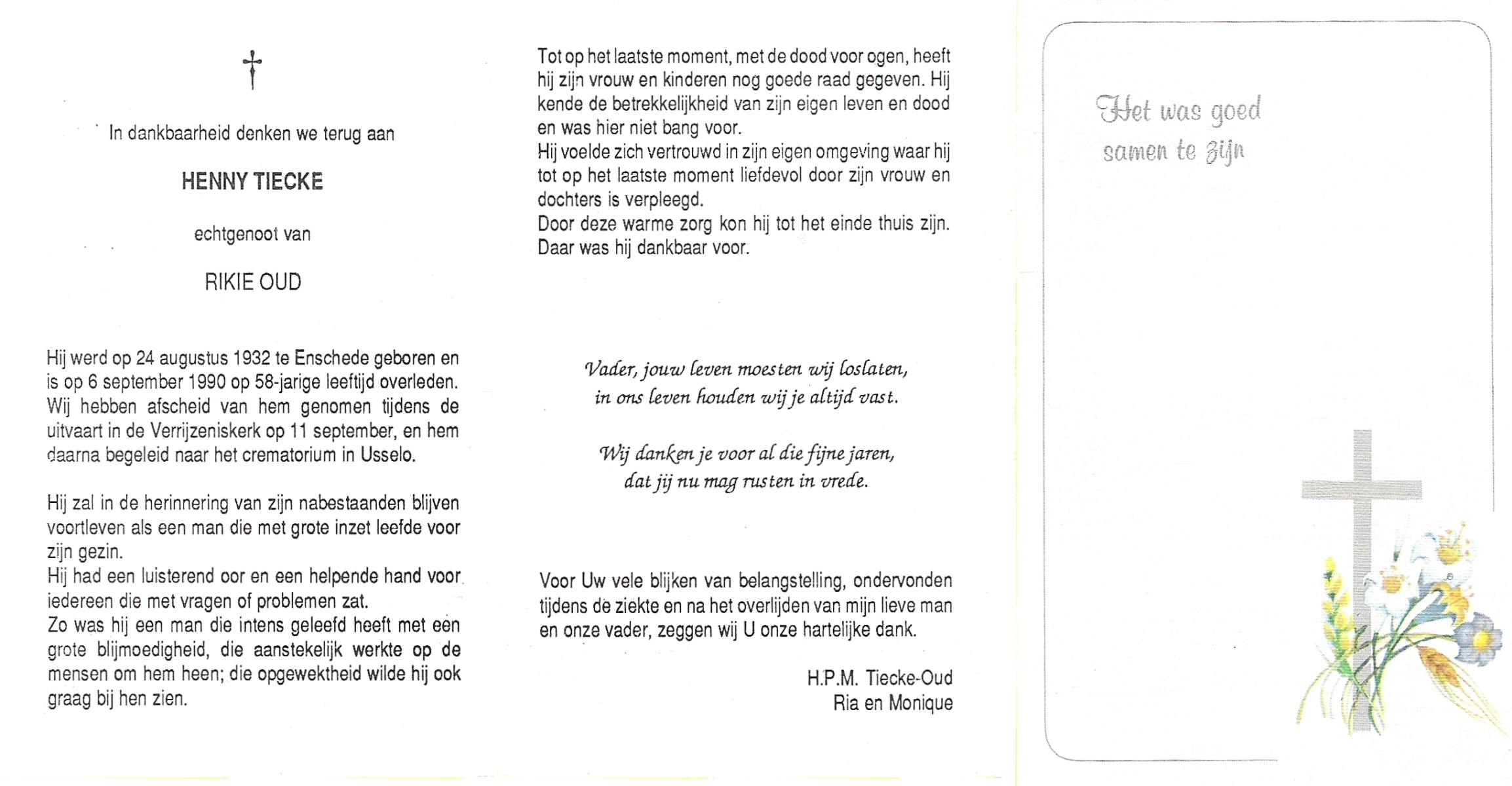 TIECKE, Henny, geboren op 24-8-1932 te Enschede, overleden op 6-9-1990 op 58-jarige leeftijd, gecremeerd op 11-9-1990 te Usselo.