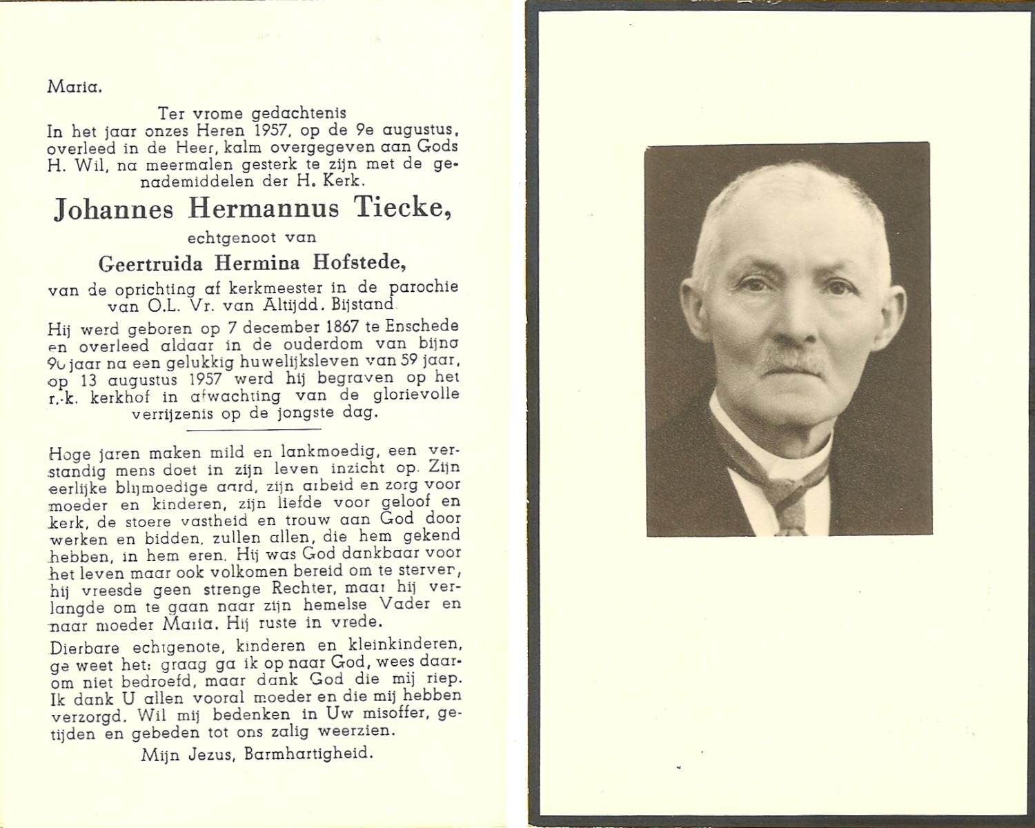 TIECKE, Johannes Hermannus, geboren op 07-12-1867 te Enschede, overleden op 9-8-1957 te Enschede op 89-jarige leeftijd, begraven op 13-8-1957 te Enschede.