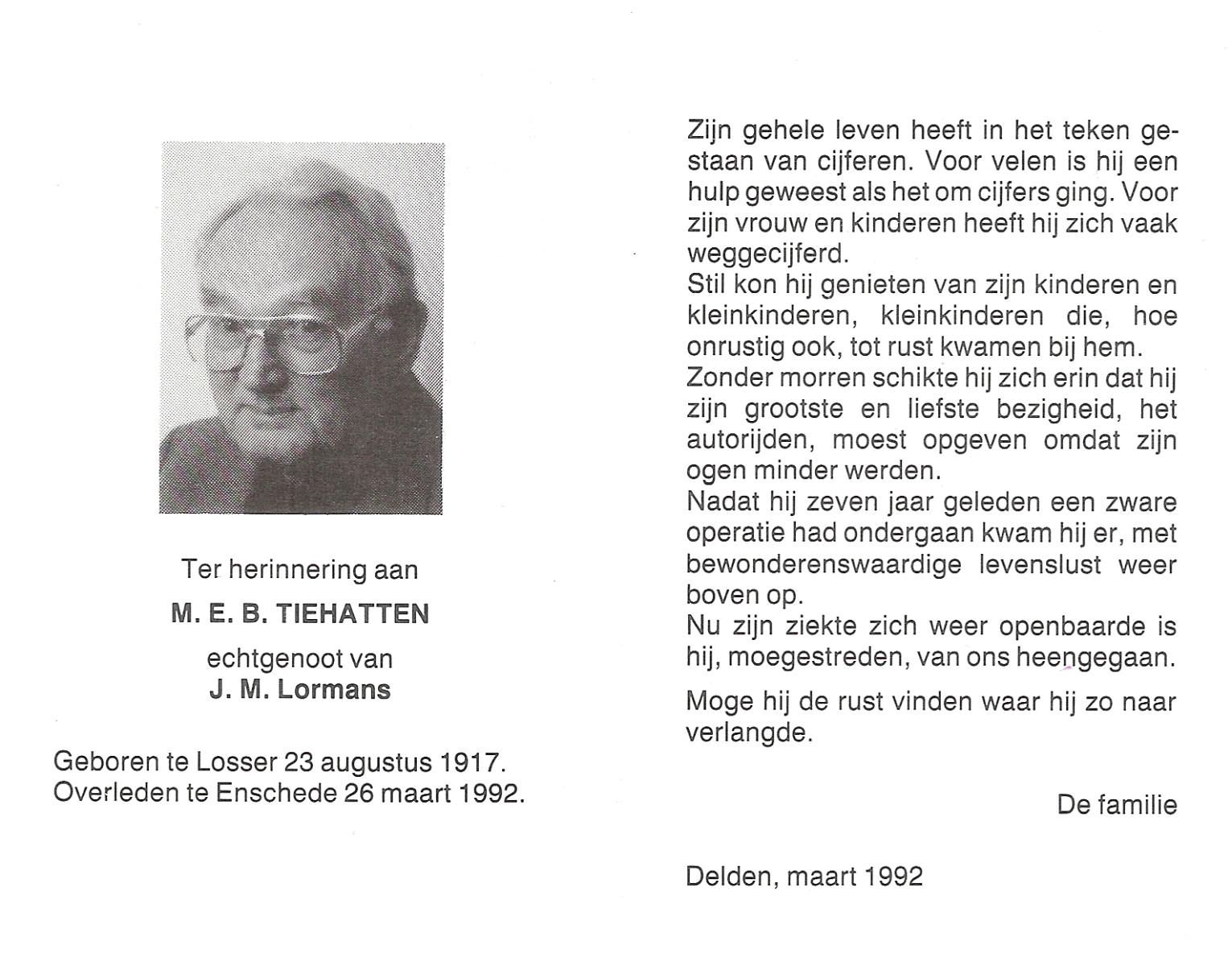 TIEHATTEN, M.E.B., geboren op 23-8-1917 te Losser, overleden op 26-3-1992 te Enschede op 74-jarige leeftijd.