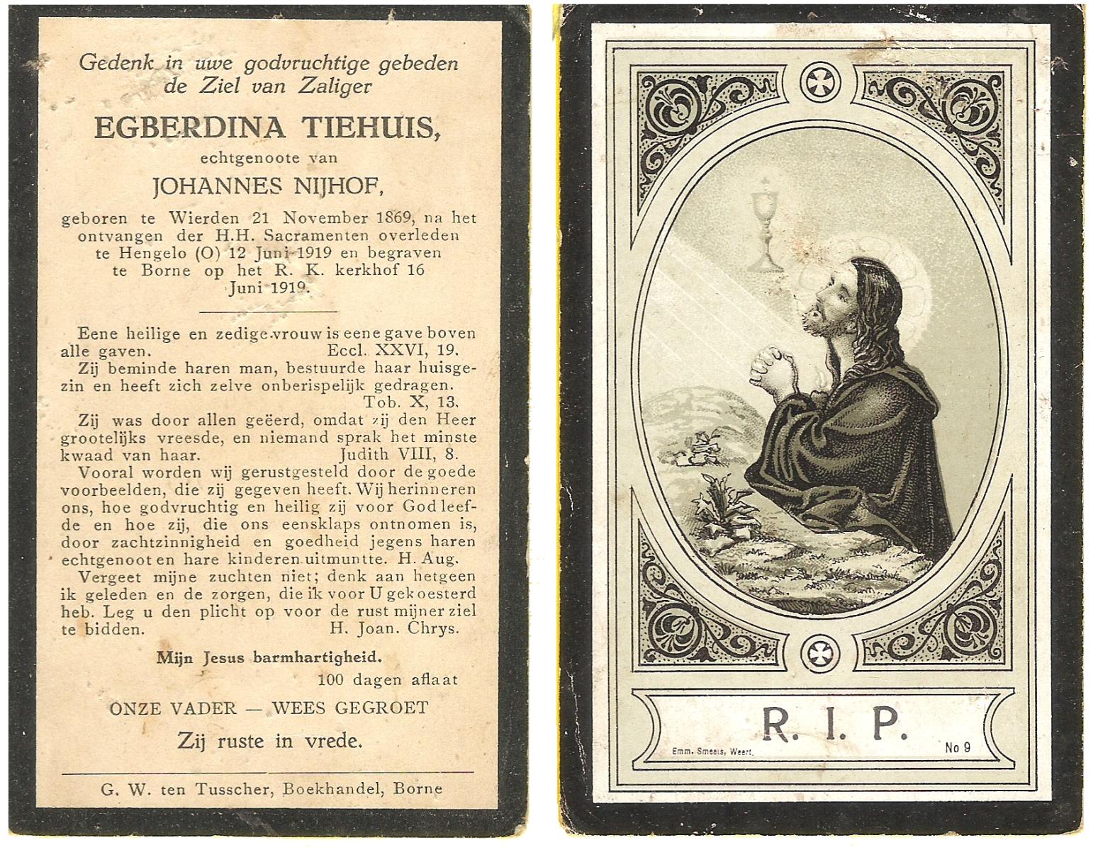 TIEHUIS, Egberdina, geboren op 21-11-1869 te Wierden, overleden op 12-6-1919 te Hengelo (Ov.) op 49-jarige leeftijd, begraven op 16-6-1919 te Borne.