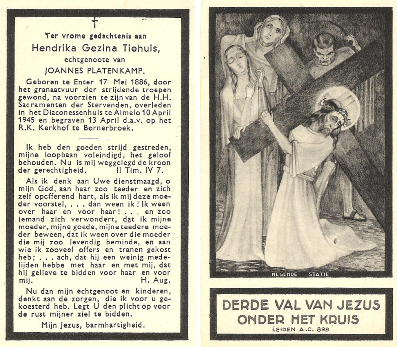 TIEHUIS, Hendrika Gezina, geboren op 17-05-1886 te Enter, overleden op 10-4-1945 te Almelo op 58-jarige leeftijd, begraven op 13-4-1945 te Bornerbroek.