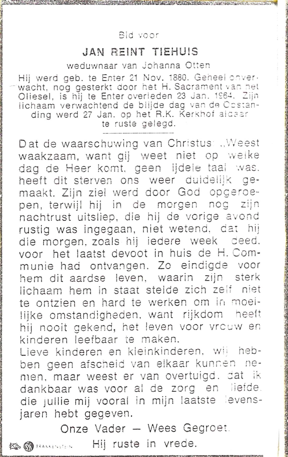 TIEHUIS, Jan Reint, geboren op 21-11-1880 te Enter, overleden op 23-1-1964 te Enter op 83-jarige leeftijd, begraven op 27-1-1964 te Enter.