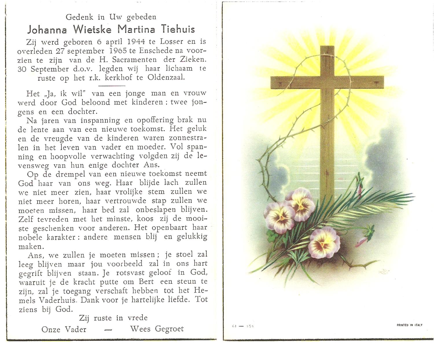 TIEHUIS, Johanna Wietske Martina, geboren op 6-4-1944 te Losser, overleden op 27-9-1965 te Enschede op 21-jarige leeftijd, begraven op 30-9-1965 te Oldenzaal.