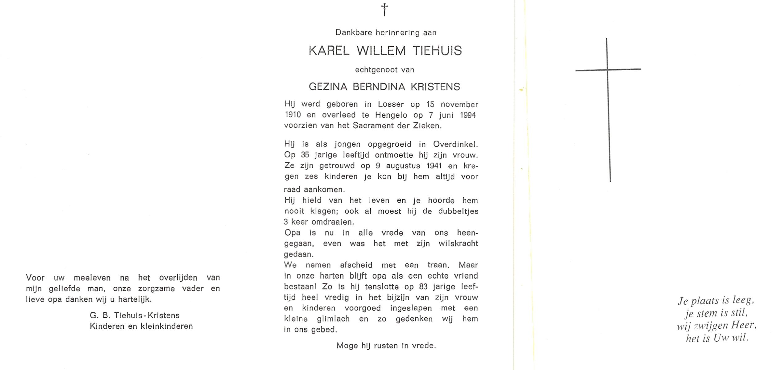 TIEHUIS, Karel Willem, geboren op 15-11-1910 te Losser, overleden op 7-6-1994 te Hengelo (Ov.) op 83-jarige leeftijd.