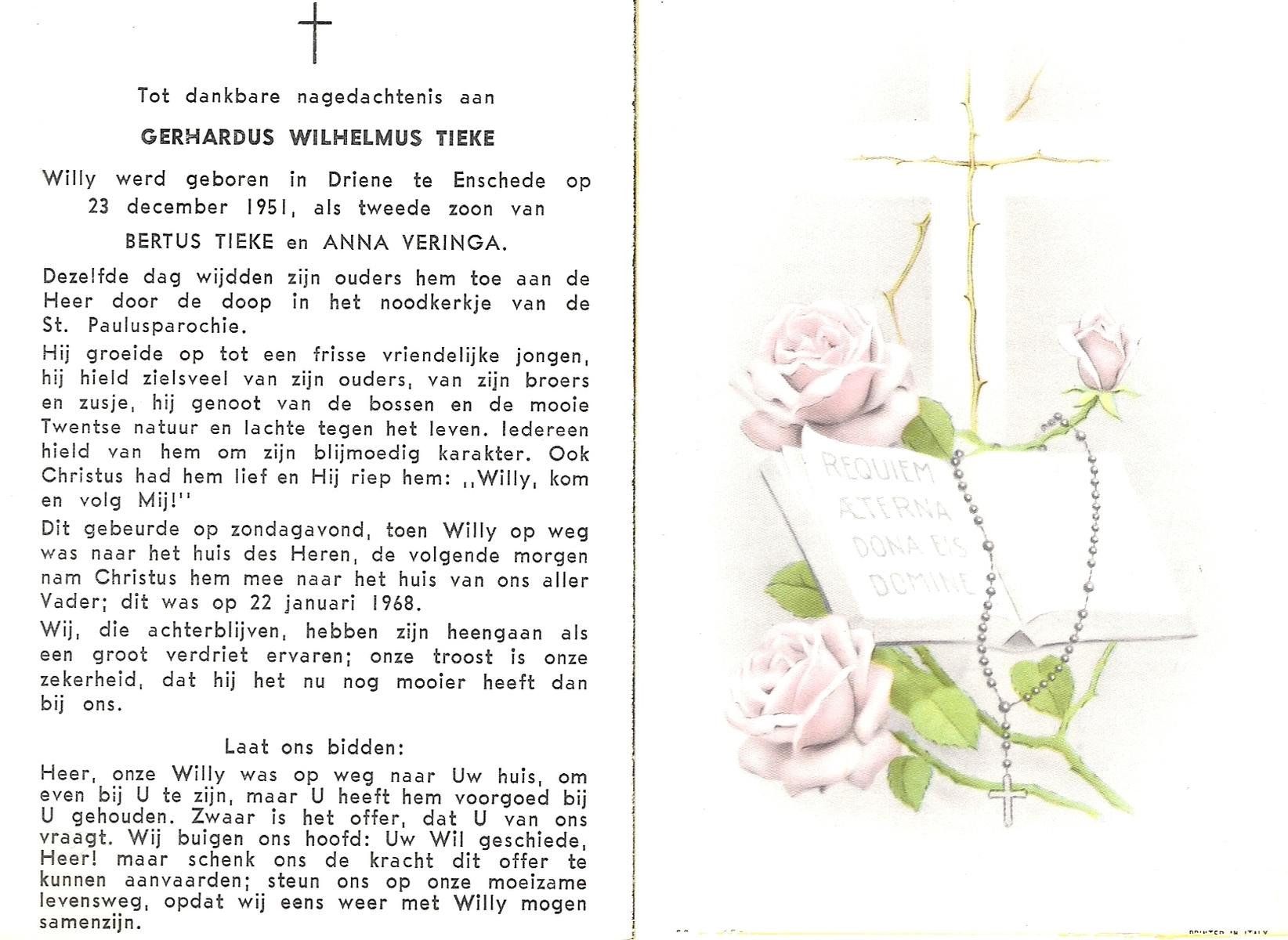 TIEKE, Gerhardus Wilhelmus, geboren op 23-12-1951 te Enschede, overleden op 22-1-1968 op 16-jarige leeftijd.