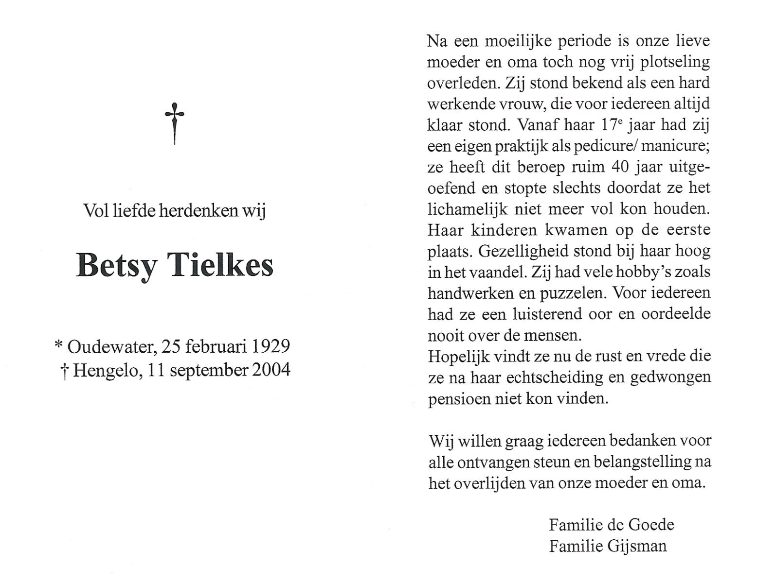 TIELKES, Betsy, geboren op 25-2-1929 te Oudewater, overleden op 11-9-2004 te Hengelo (Ov.) op 75-jarige leeftijd.