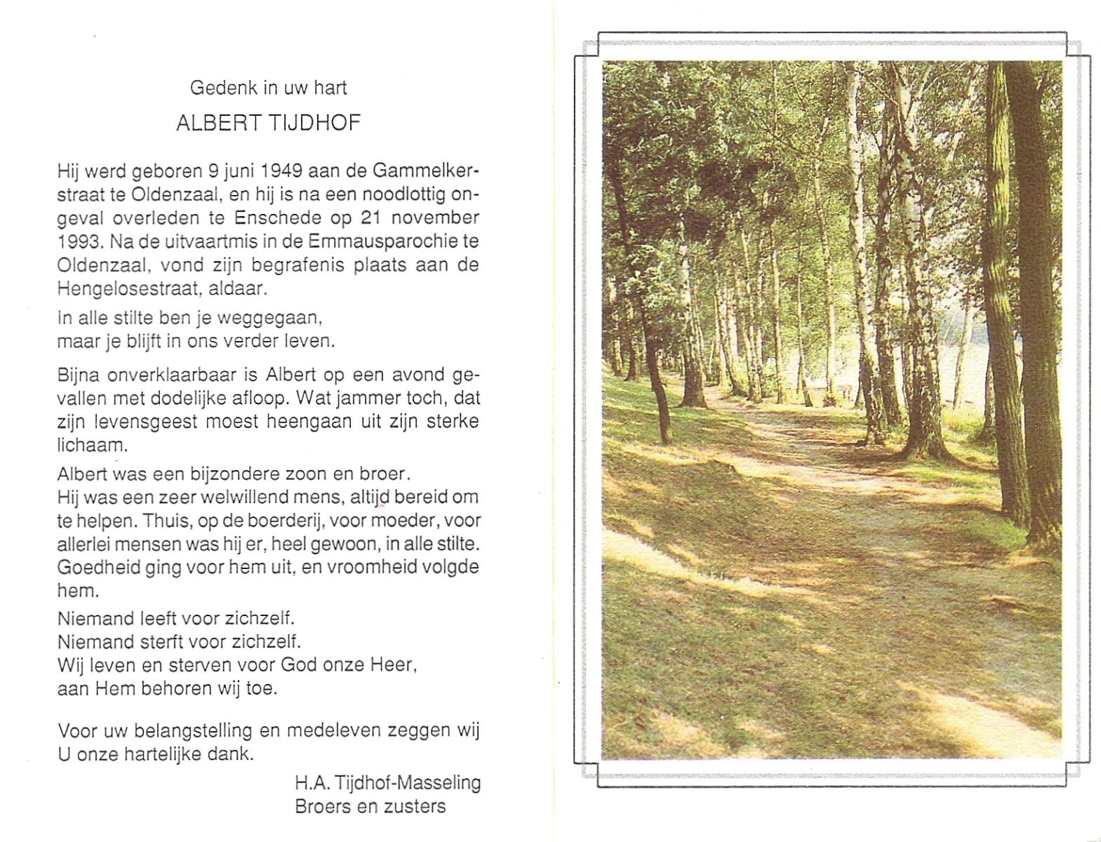TIJDHOF, Albert, geboren op 9-6-1949 te Oldenzaal, overleden op 21-11-1993 te Enschede op 44-jarige leeftijd, begraven te Oldenzaal.