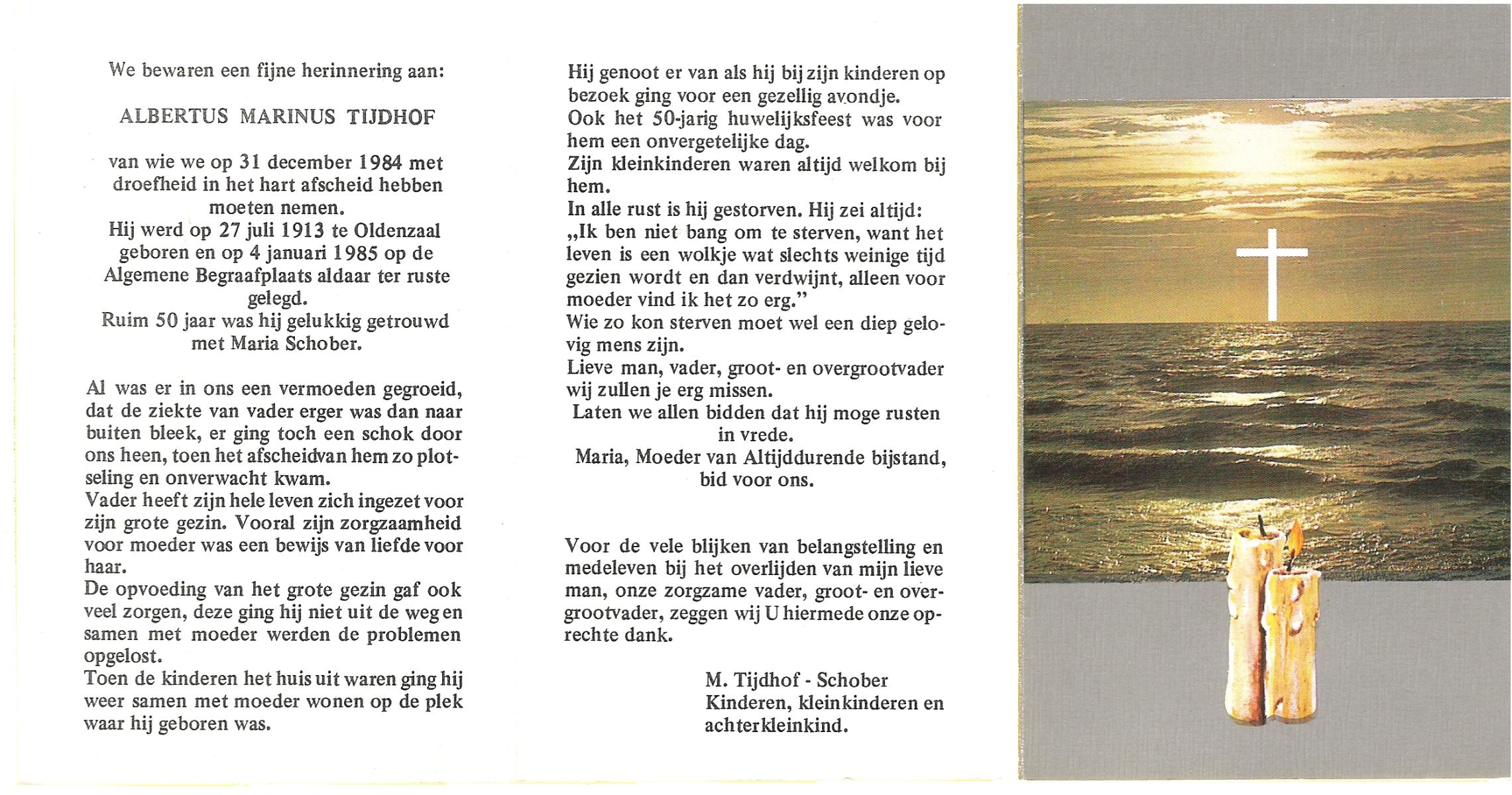 TIJDHOF, Albertus Marinus, geboren op 27-7-1913 te Oldenzaal, overleden op 31-12-1984 op 71-jarige leeftijd, begraven op 4-1-1985 te Oldenzaal Algemene begraafplaats.