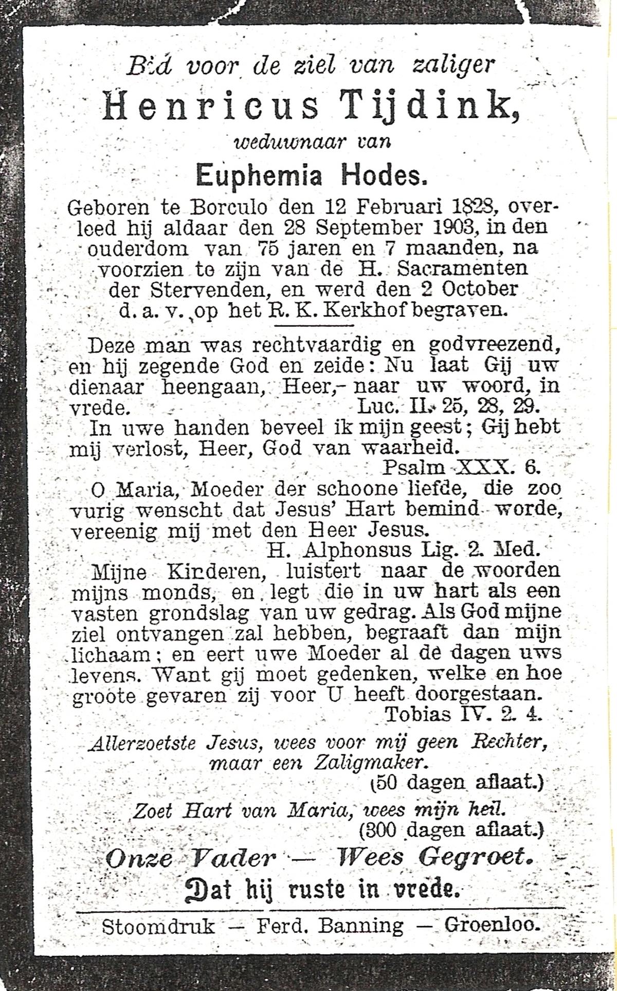 TIJDINK, Henricus, geboren op 12-02-1828 te Borculo, overleden op 28-9-1903 te Borculo op 75-jarige leeftijd, begraven op 2-10-1903 te Borculo.