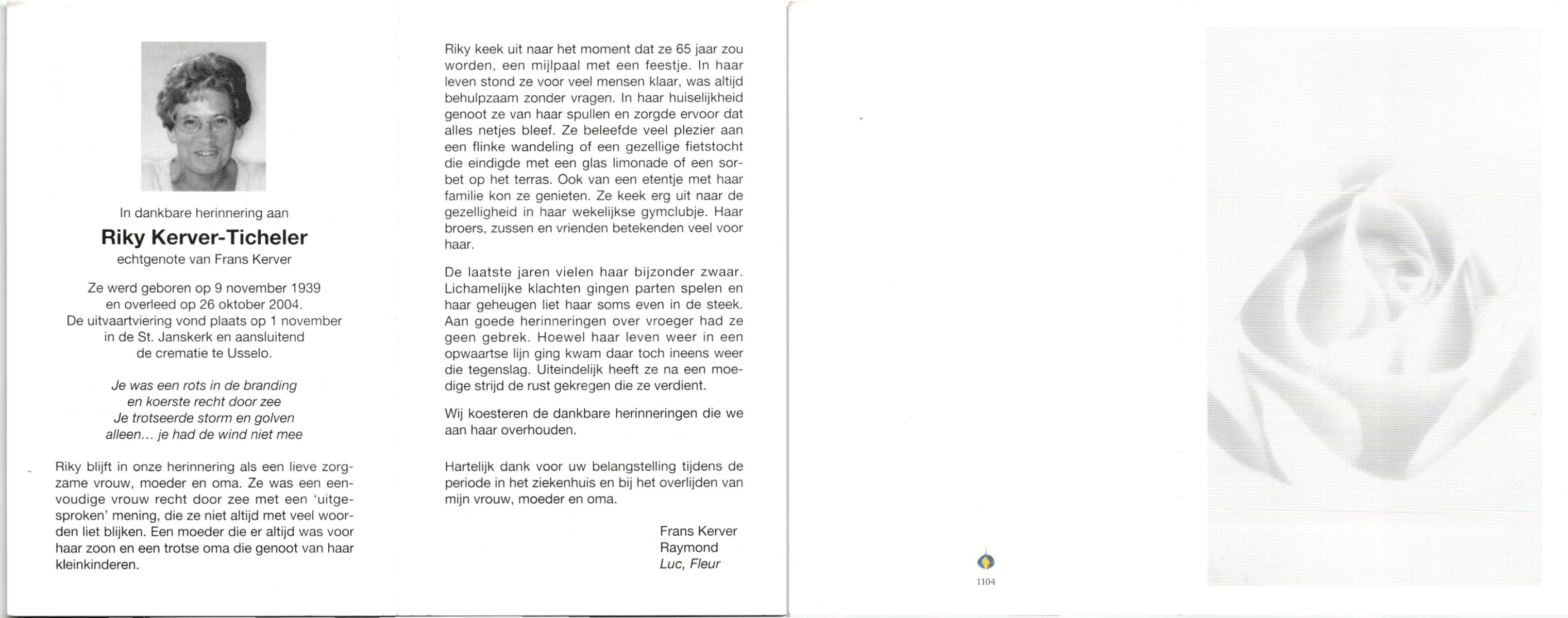 TICHELER, , Riky, geboren op 9-11-1939, overleden op 26-10-2004 op 64-jarige leeftijd, gecremeerd op 1-11-2004 te Usselo.