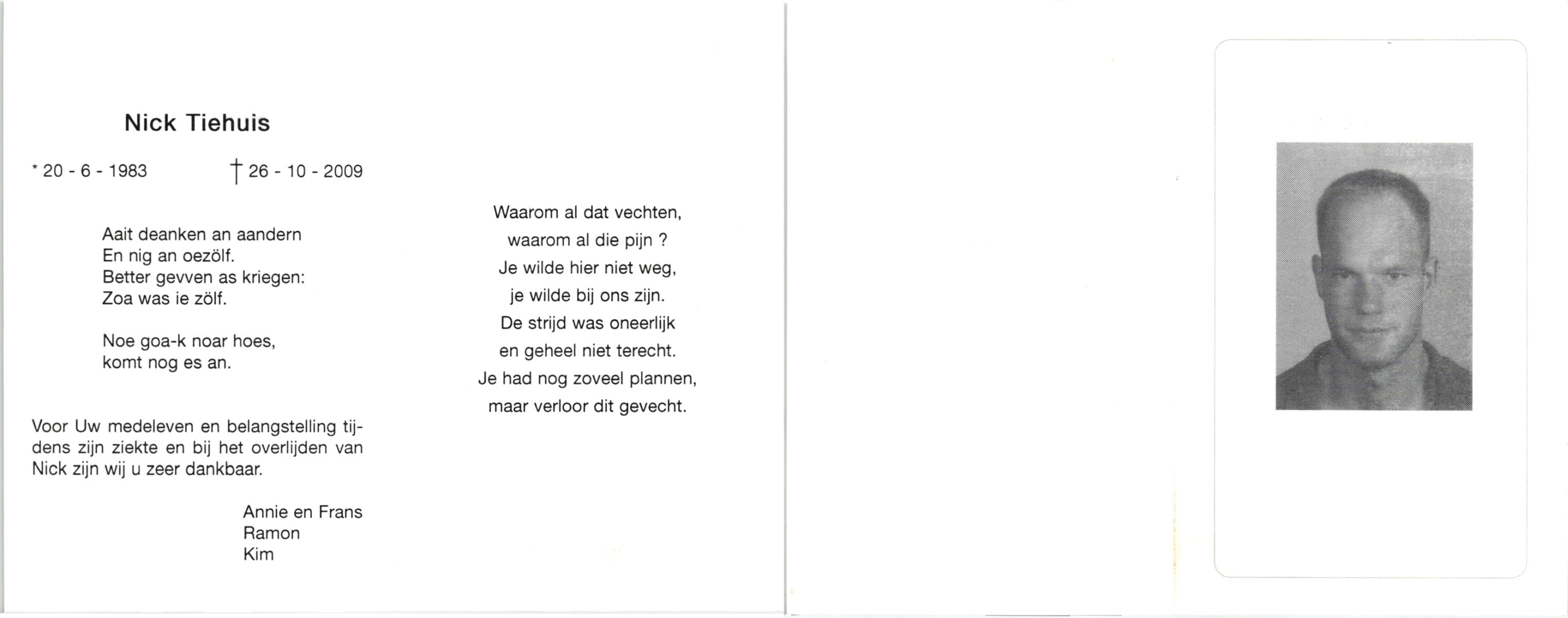 TIEHUIS, , Nick, geboren op 20-6-1983, overleden op 26-10-2009 op 26-jarige leeftijd.