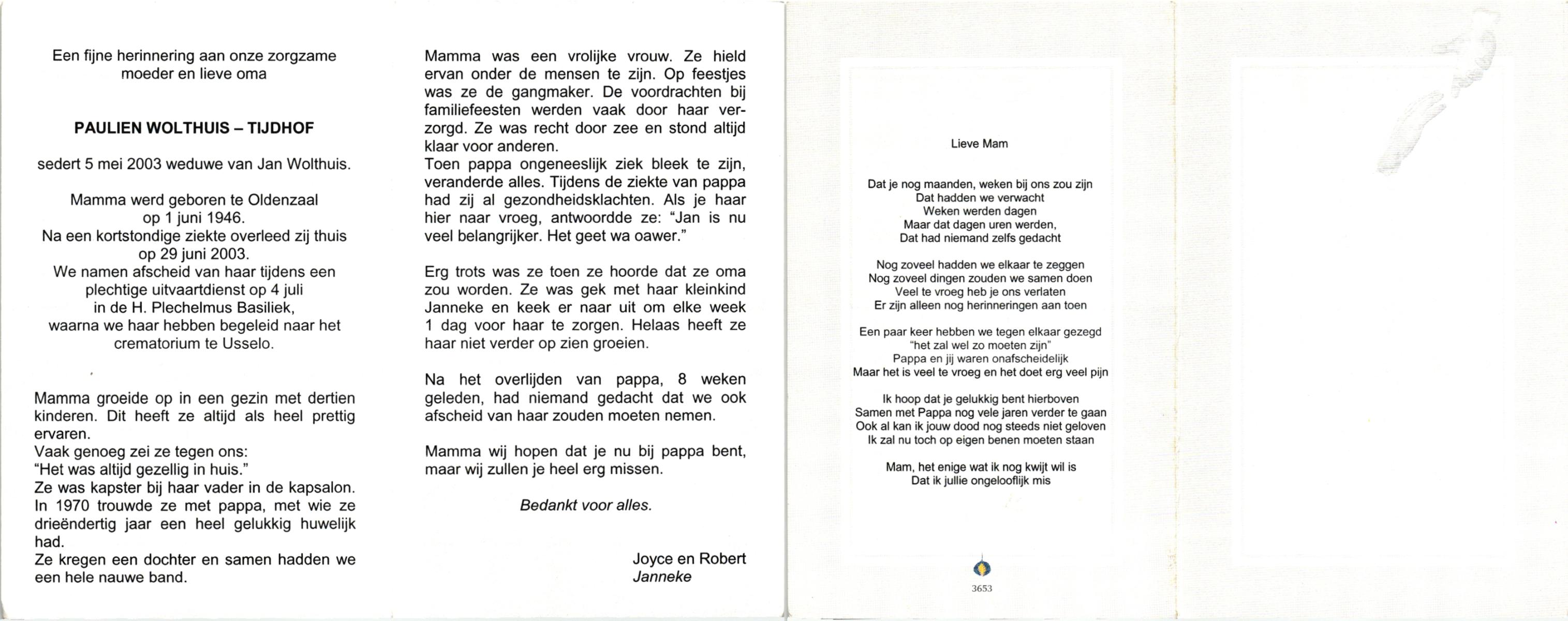 TIJDHOF, , Paulien, geboren op 1-6-1946 te Oldenzaal, overleden op 29-6-2003 op 57-jarige leeftijd, gecremeerd op 4-7-2003 te Usselo.