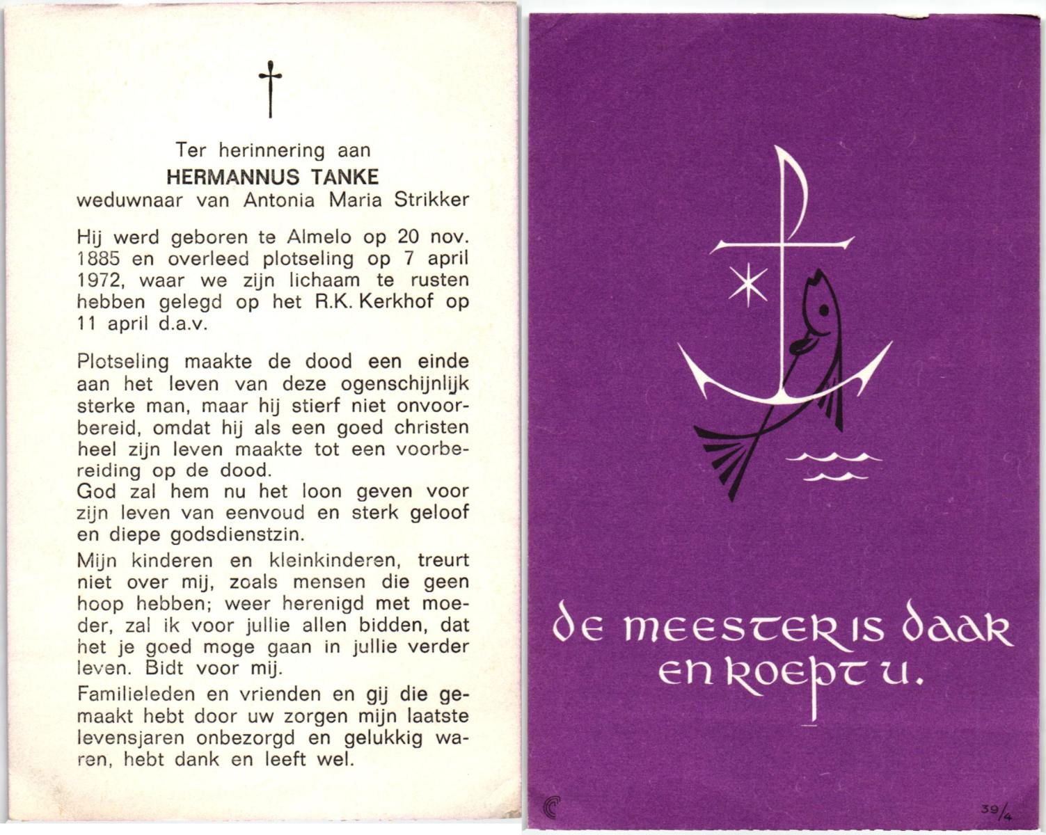 STRIKKER, Hermannus Karel Anthonius, geboren op 13-7-1905 te Delden, Stad, overleden op 22-7-1985 te Delden op 80-jarige leeftijd, begraven te Delden, Stad.