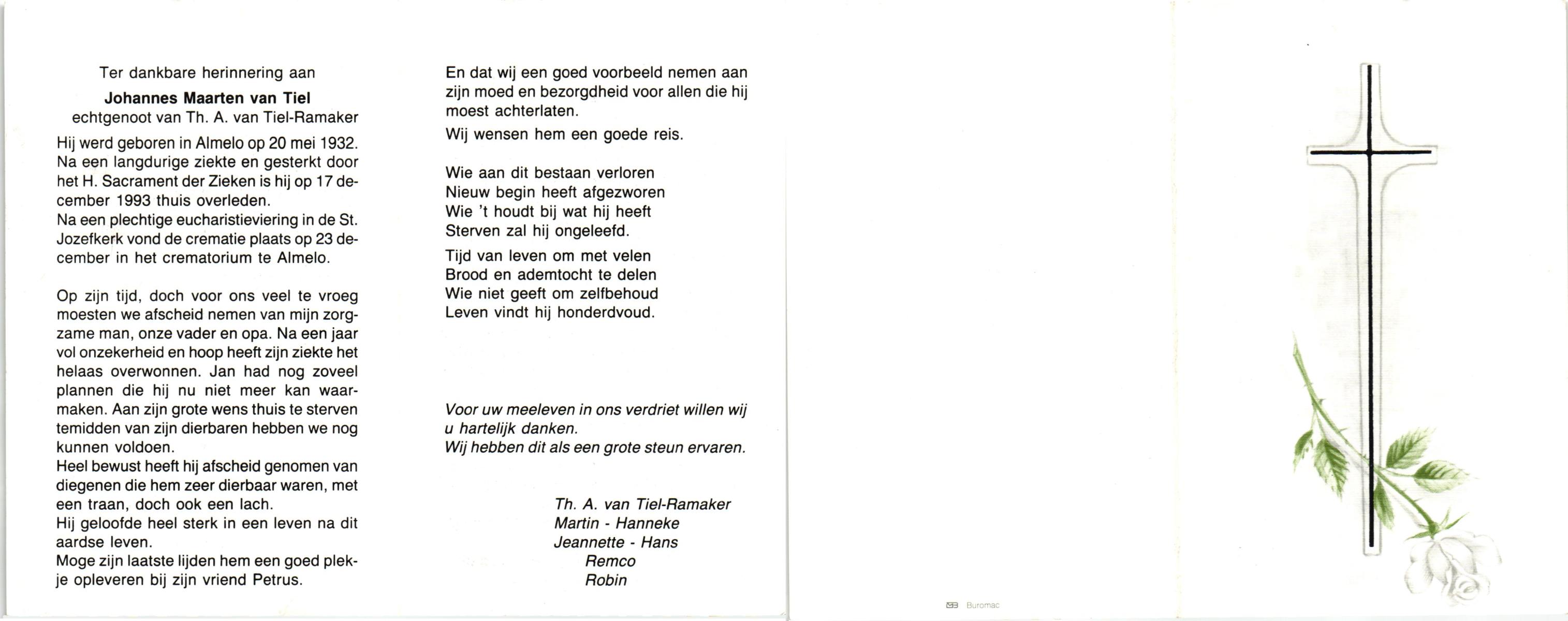 TIEL, van, Johannes Marten, geboren op 20-5-1932 te Almelo, overleden op 17-12-1993 te Almelo op 61-jarige leeftijd, begraven op 23-12-1993 te Almelo.