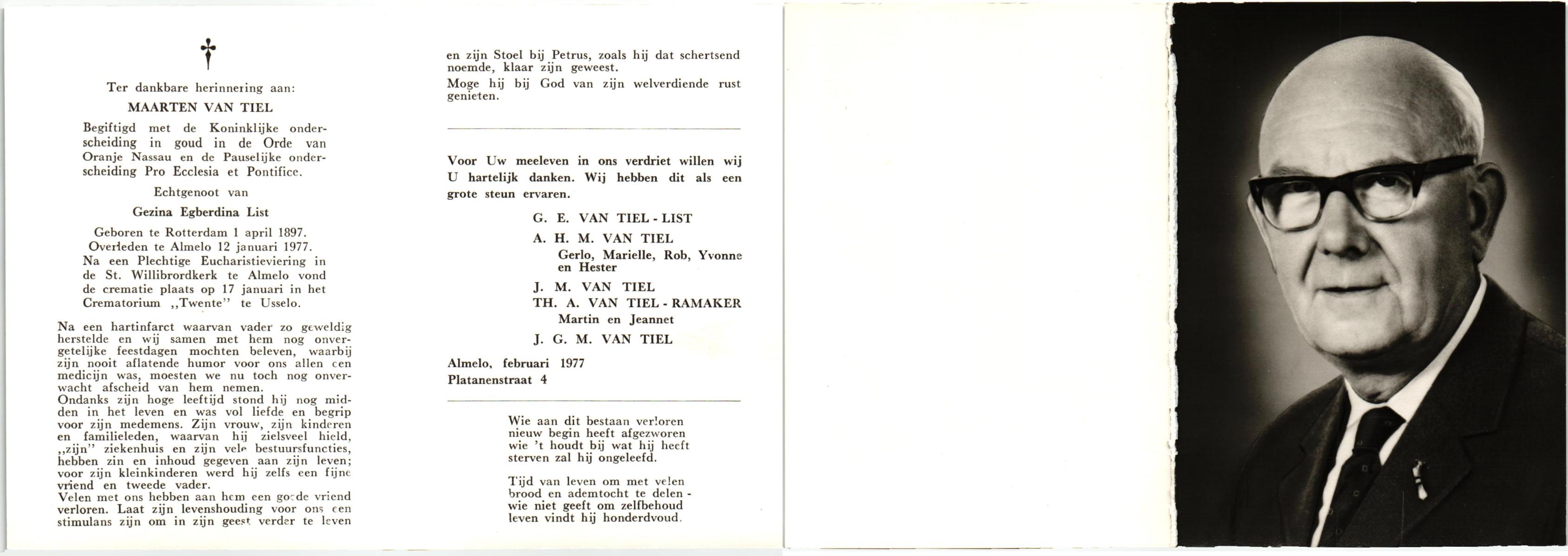 TIEL, van, Maarten, geboren op 01-04-1897 te Rotterdam, overleden op 12-1-1977 te Almelo op 79-jarige leeftijd, gecremeerd op 17-1-1977 te Usselo.