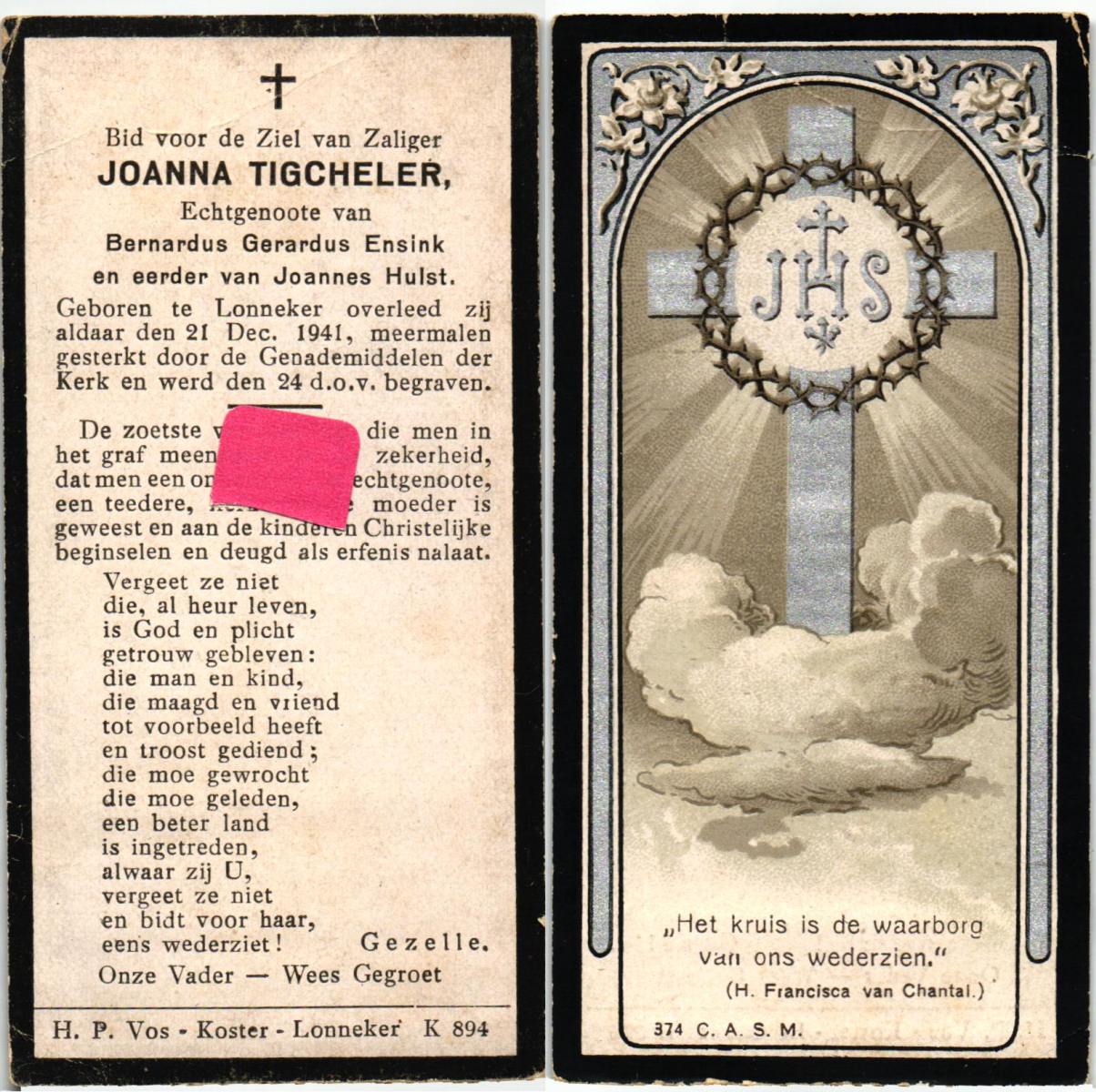 TIGCHELER, Joanna, geboren te Lonneker, overleden op 21-12-1941 te Lonneker, begraven op 24-12-1941.