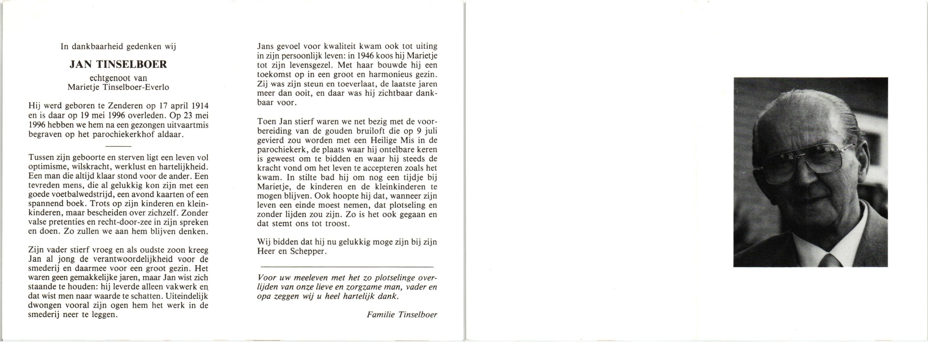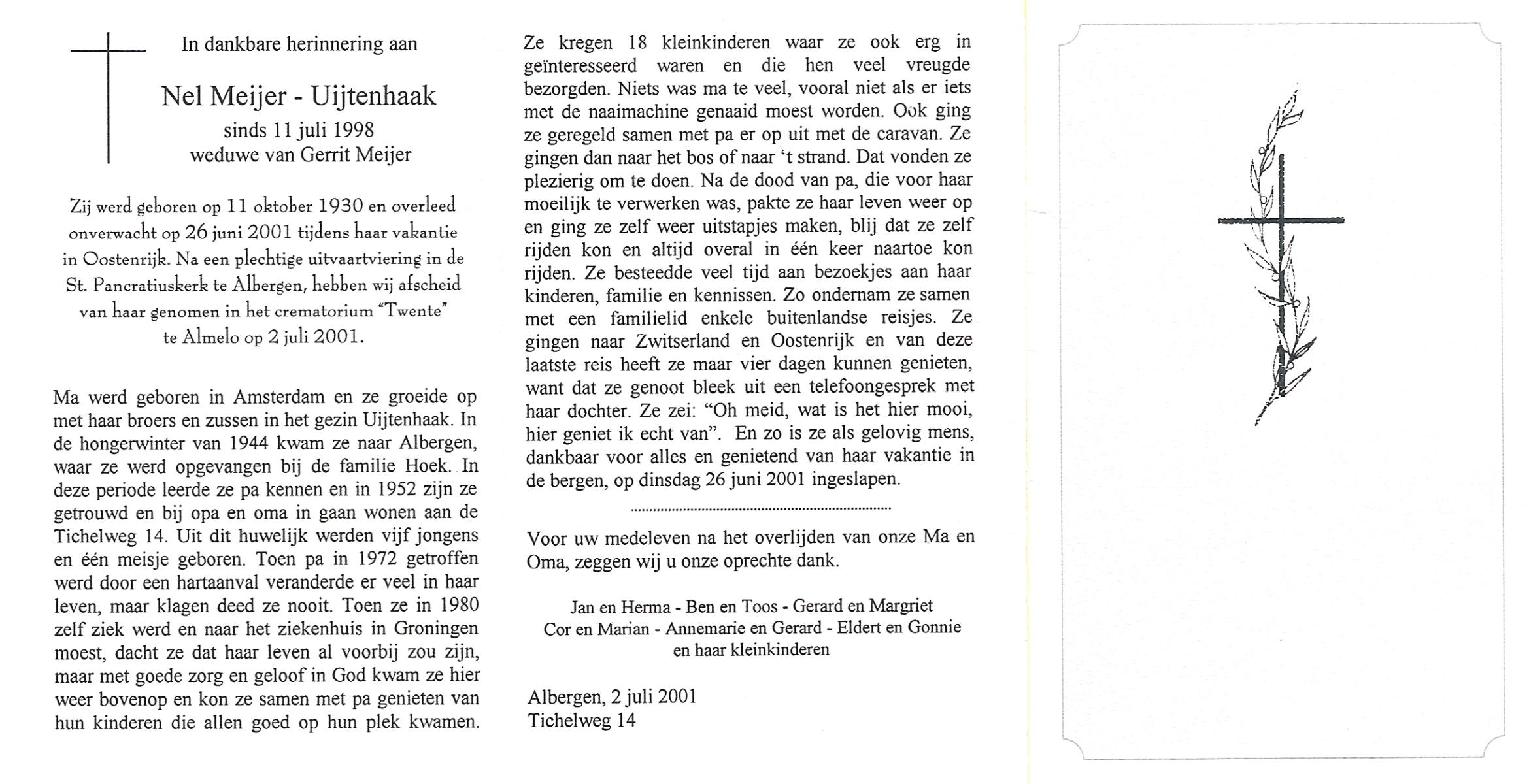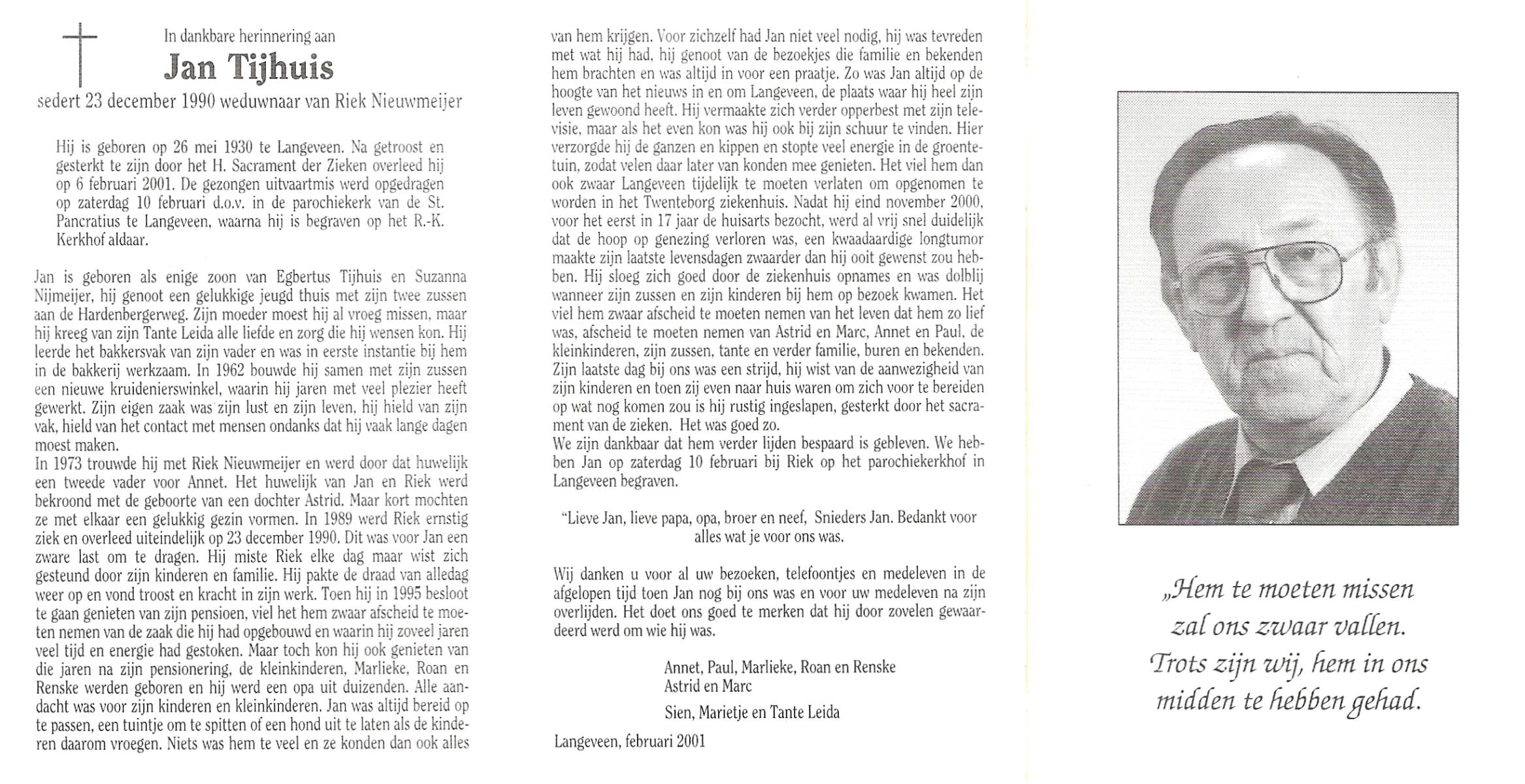 TIJHUIS, Jan, geboren op 26-5-1930 te Langeveen, overleden op 6-2-2001 op 70-jarige leeftijd, begraven op 10-2-2001 te Langeveen R.K.kerhof.