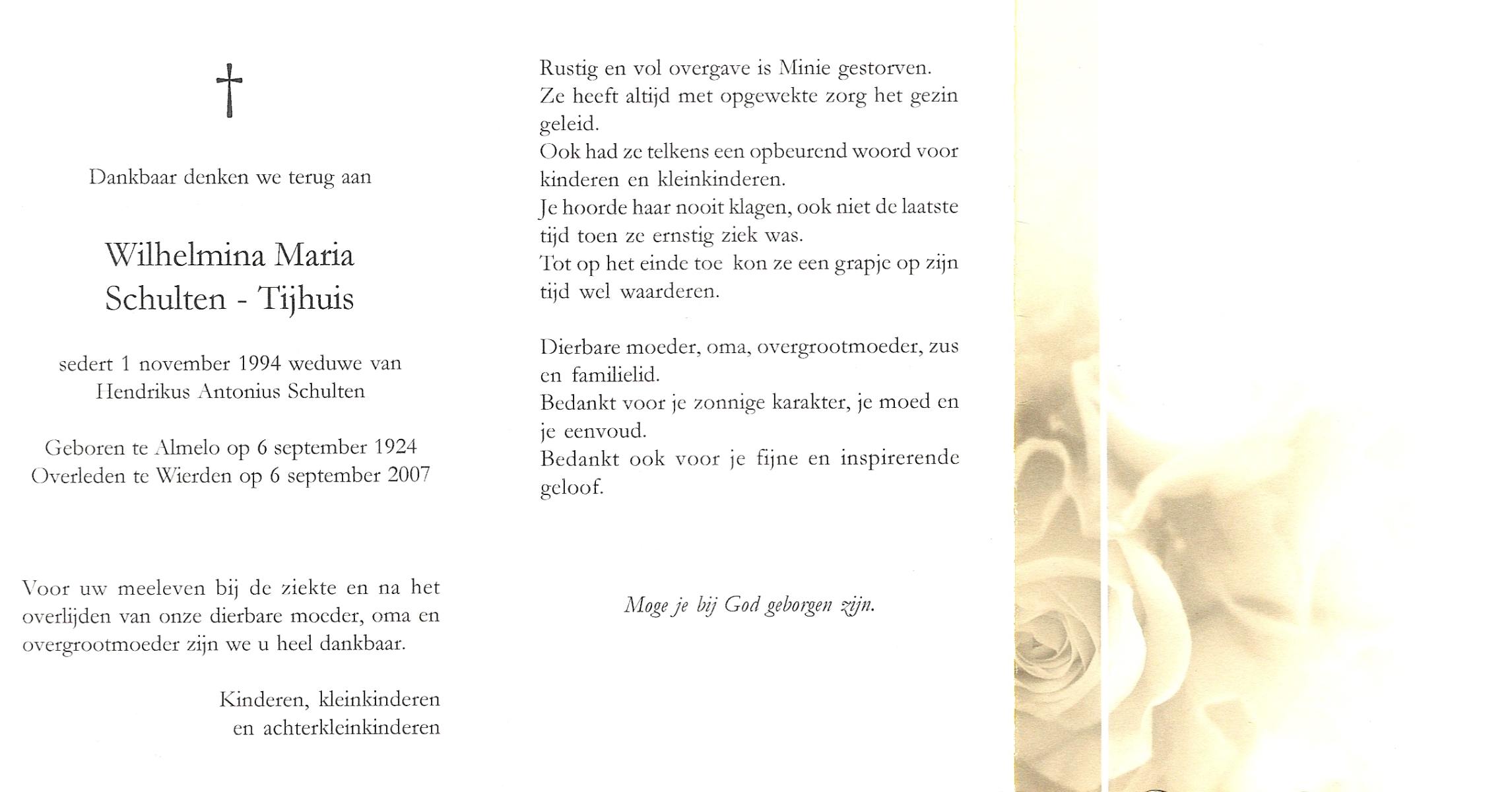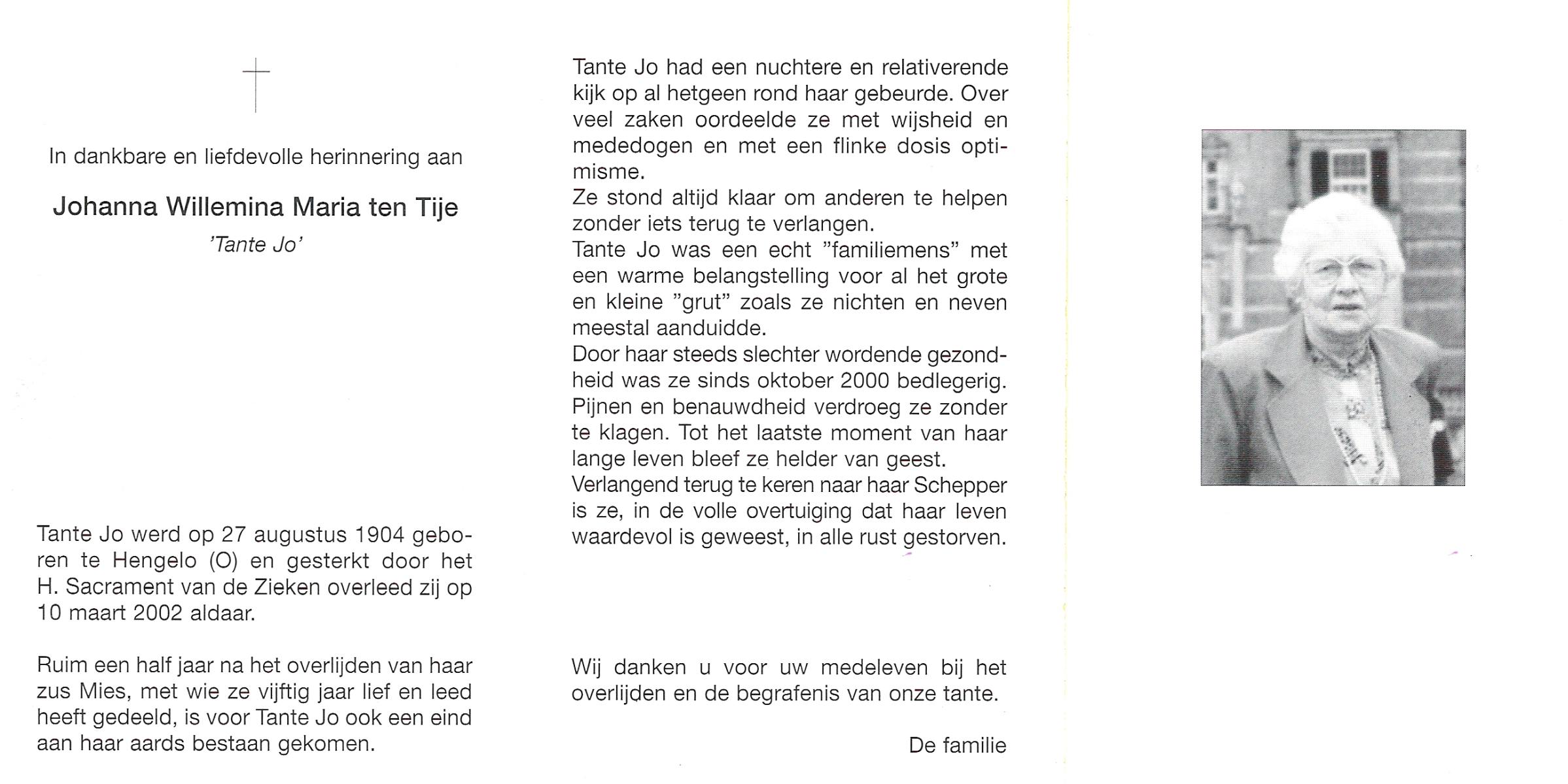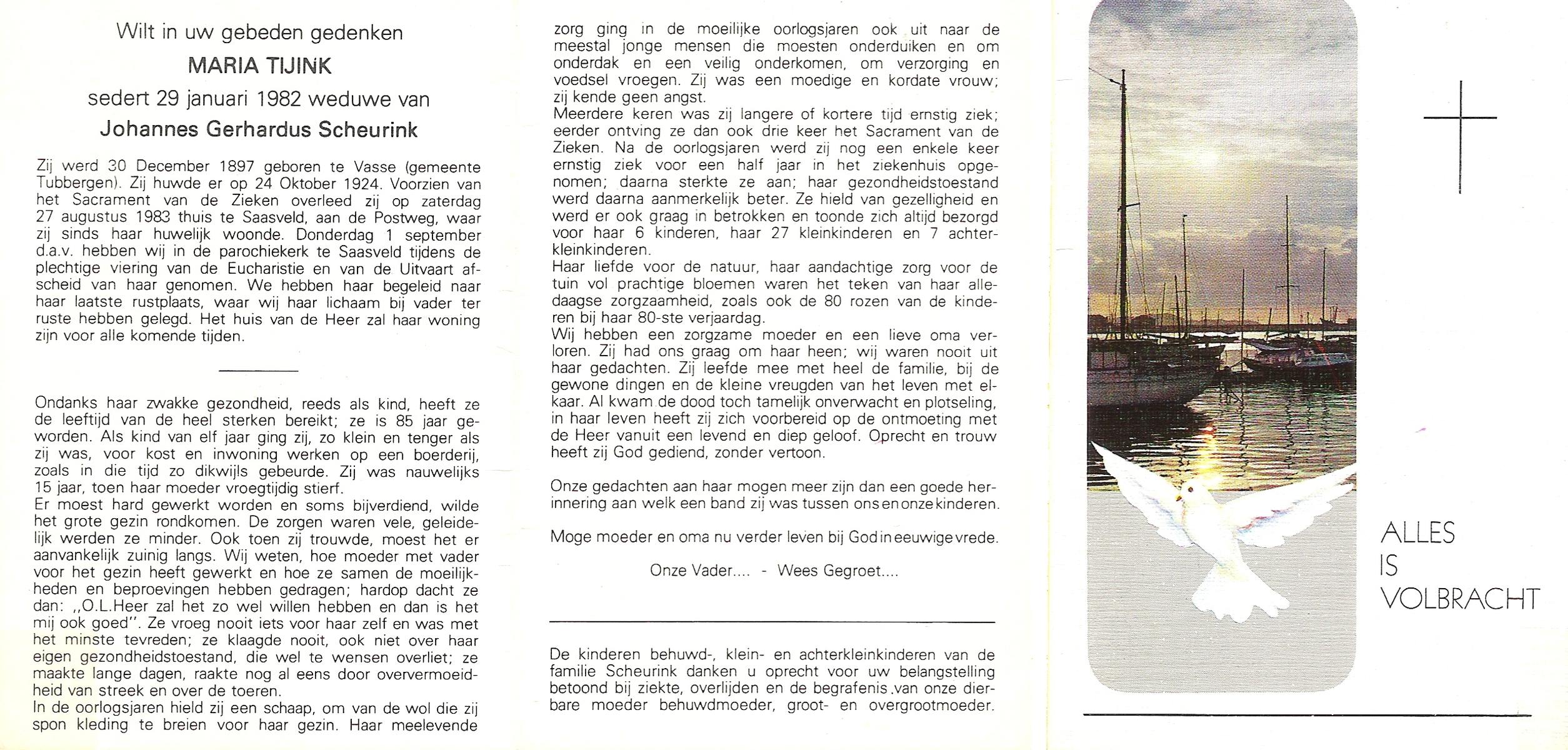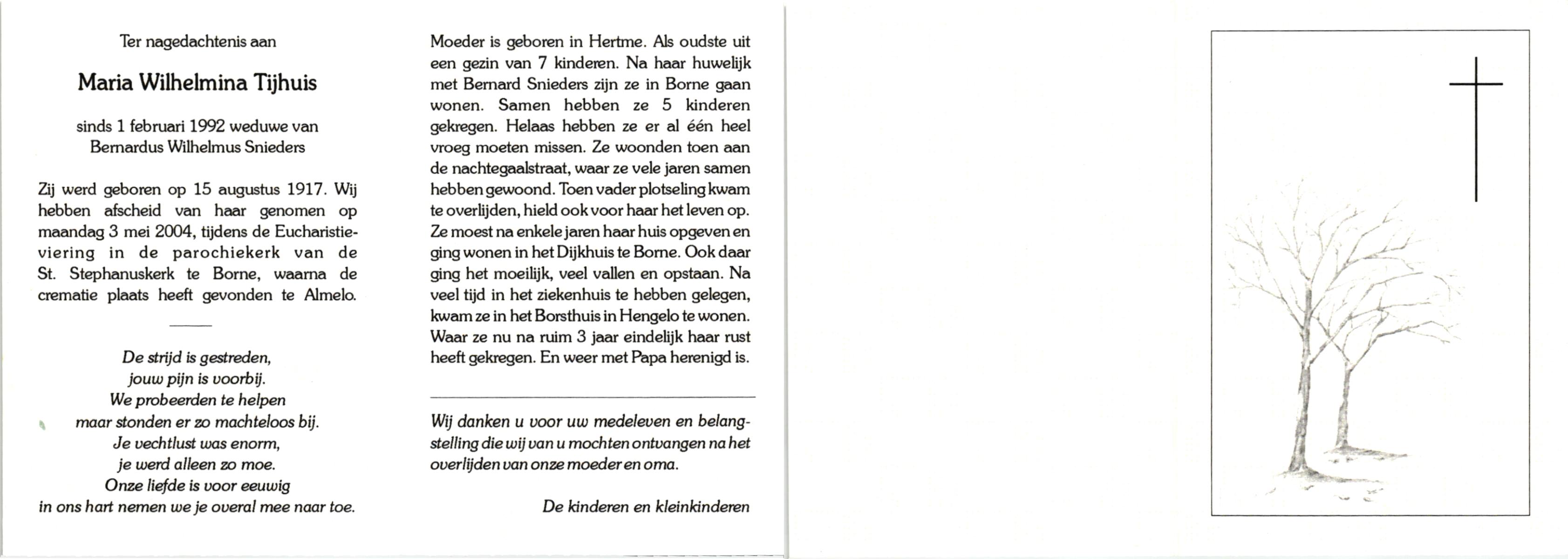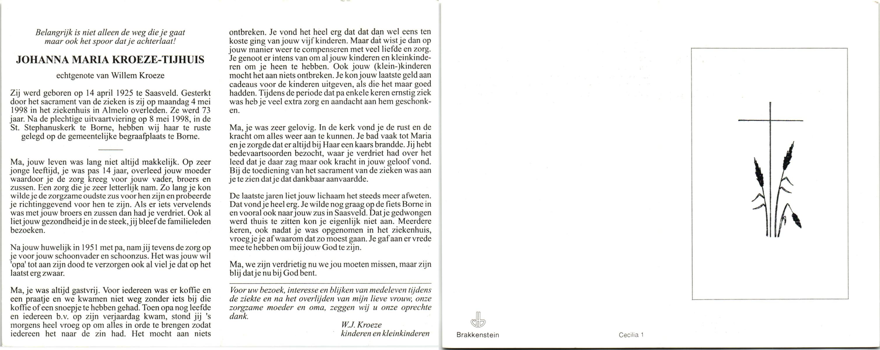 TIJHUIS, Johanna Maria, geboren op 14-4-1925 te Saasveld, overleden op 4-5-1998 te Almelo, ziekenhuis op 73-jarige leeftijd, begraven op 8-5-1998 te Borne.