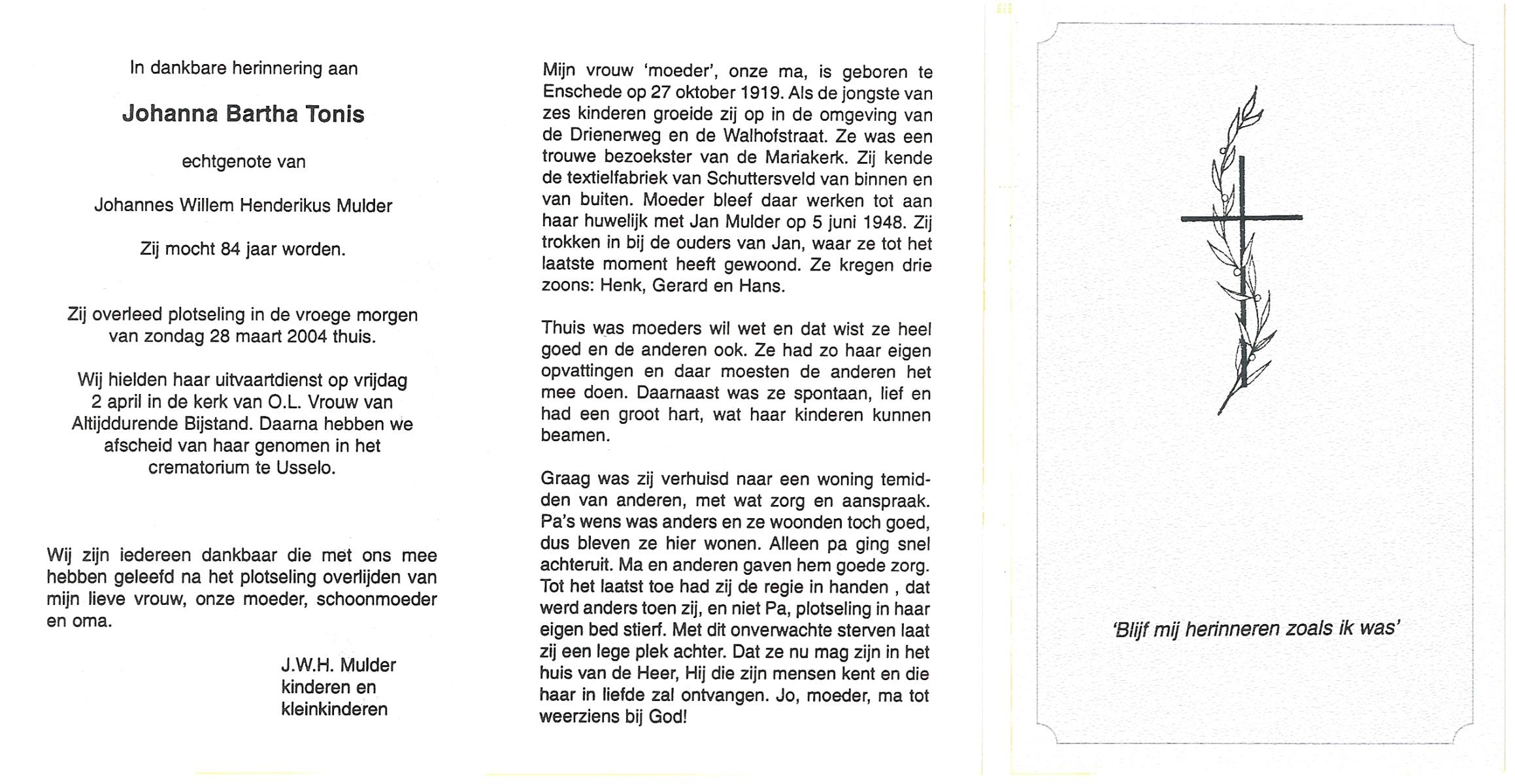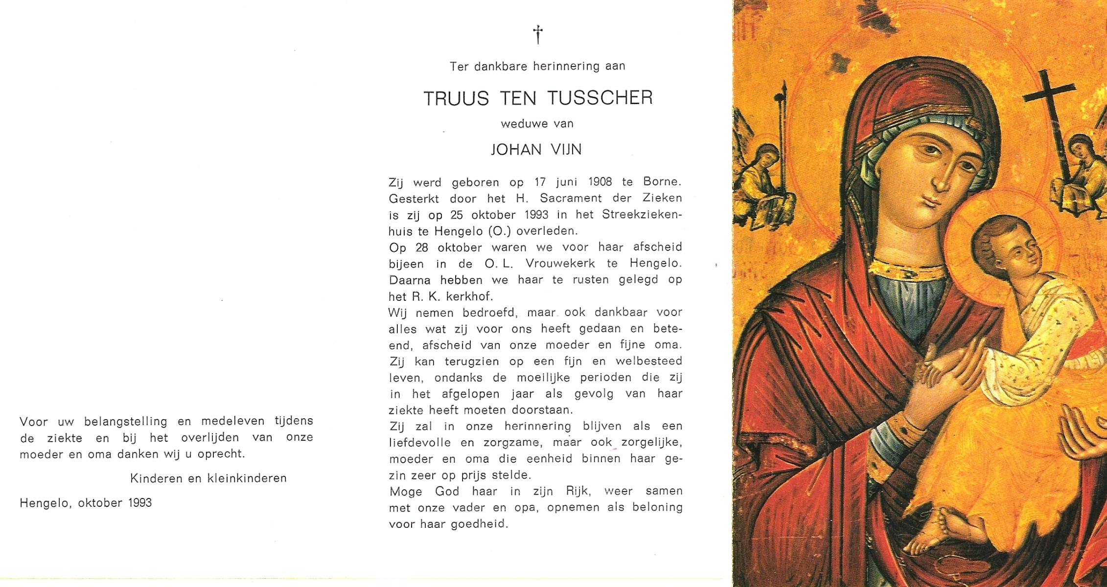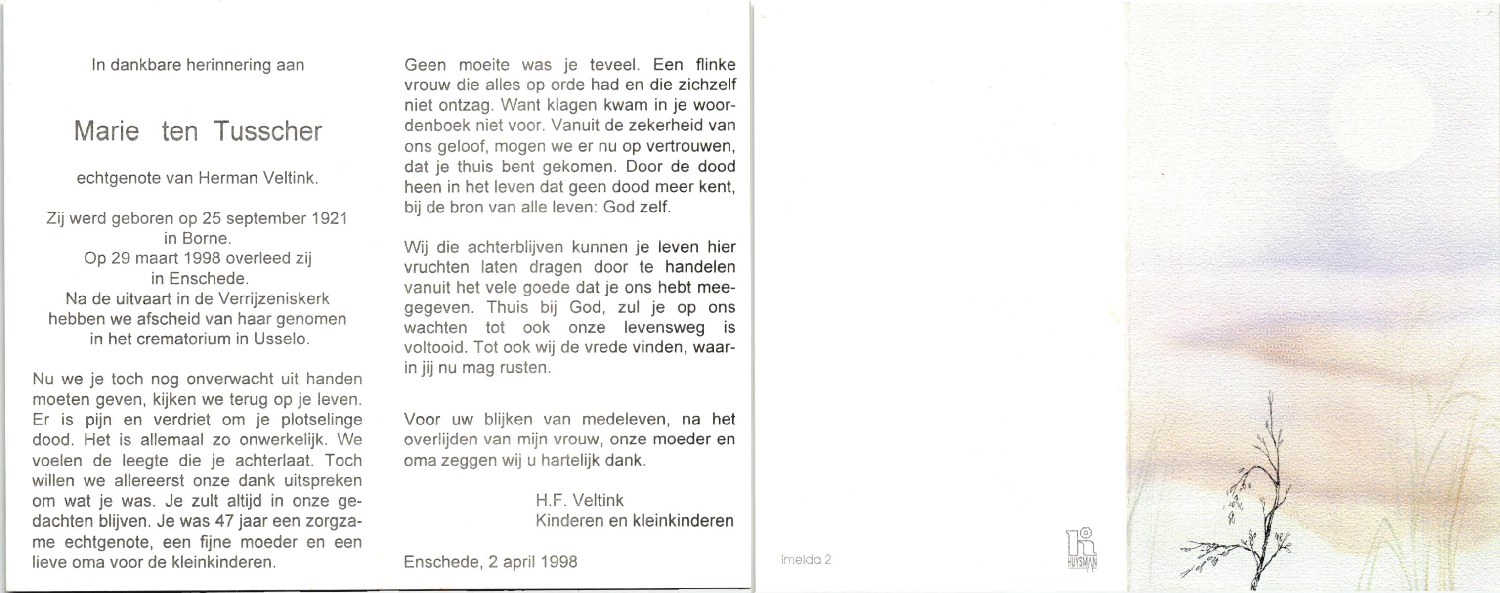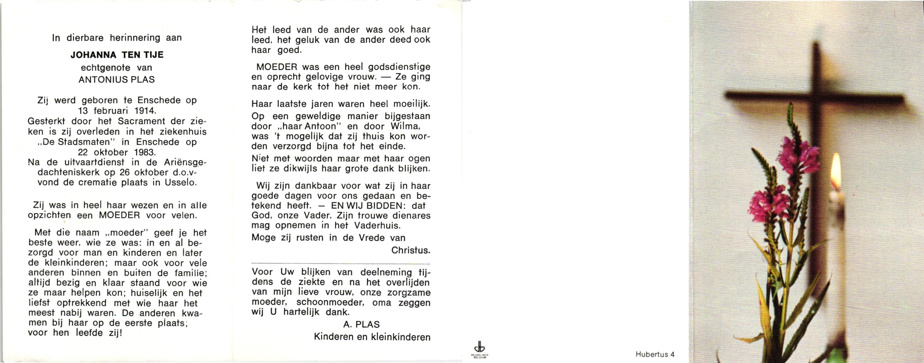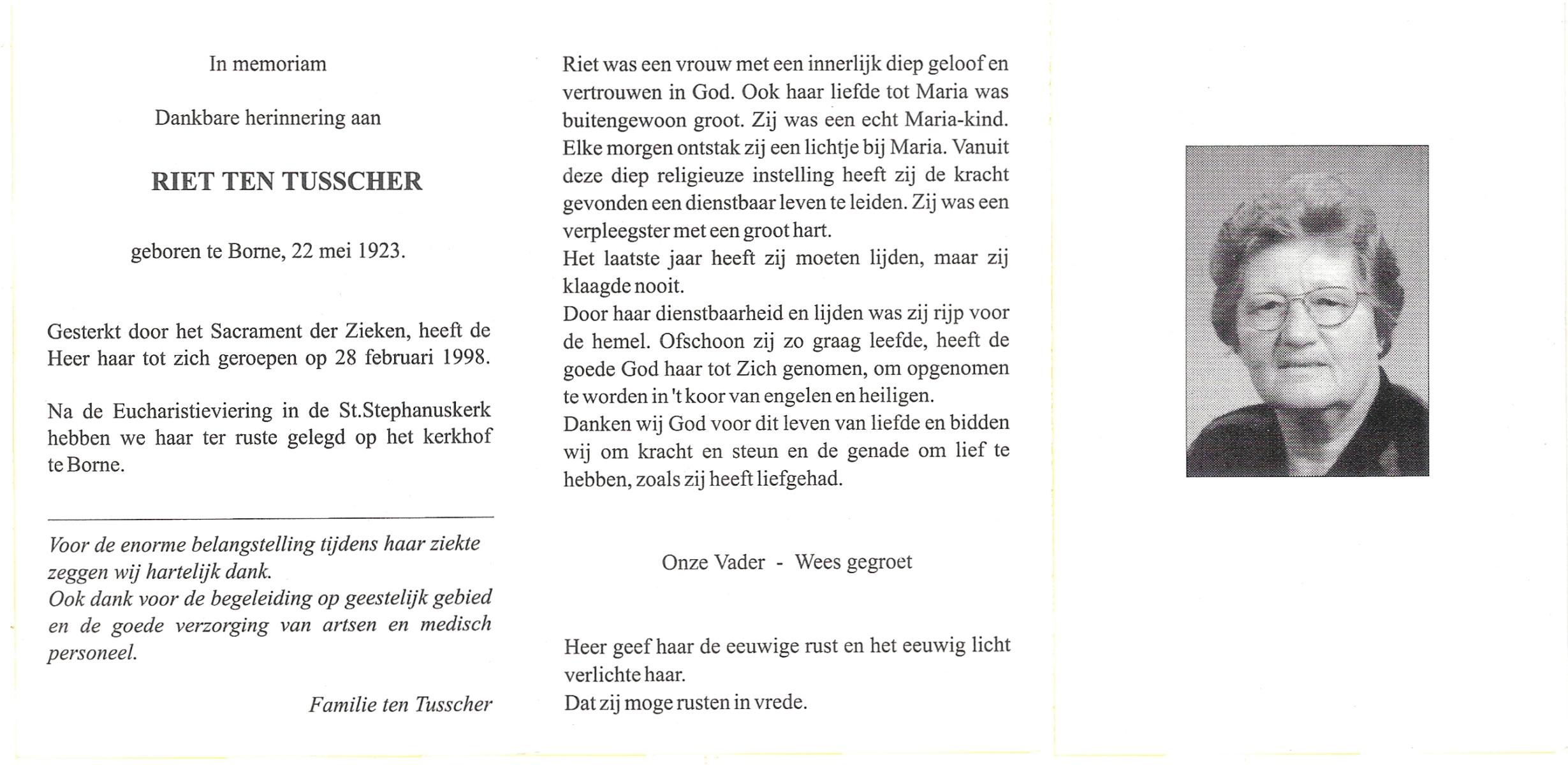 TIJHUIS, Johanna Maria, geboren op 14-4-1925 te Saasveld, overleden op 4-5-1998 te Almelo, ziekenhuis op 73-jarige leeftijd, begraven op 8-5-1998 te Borne.